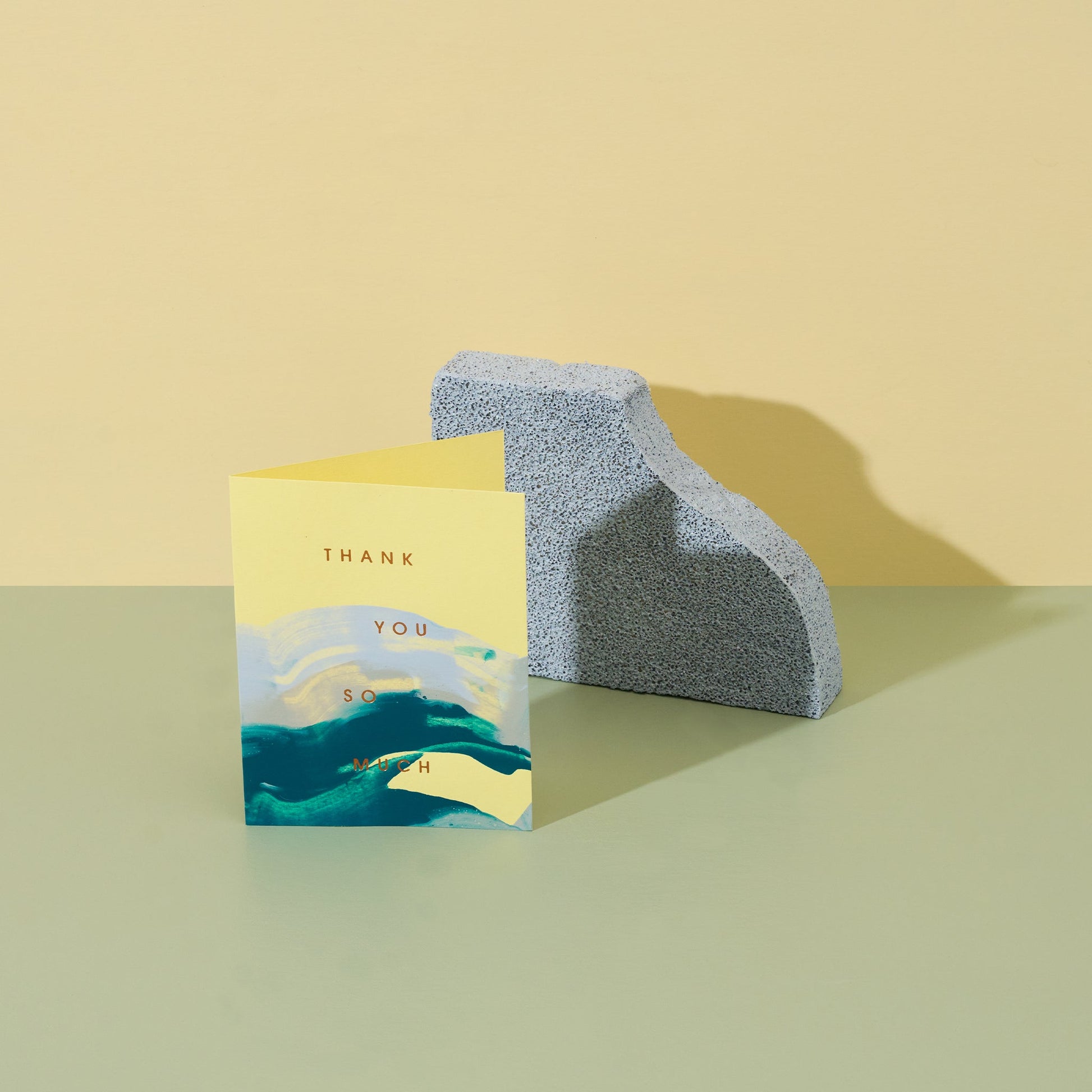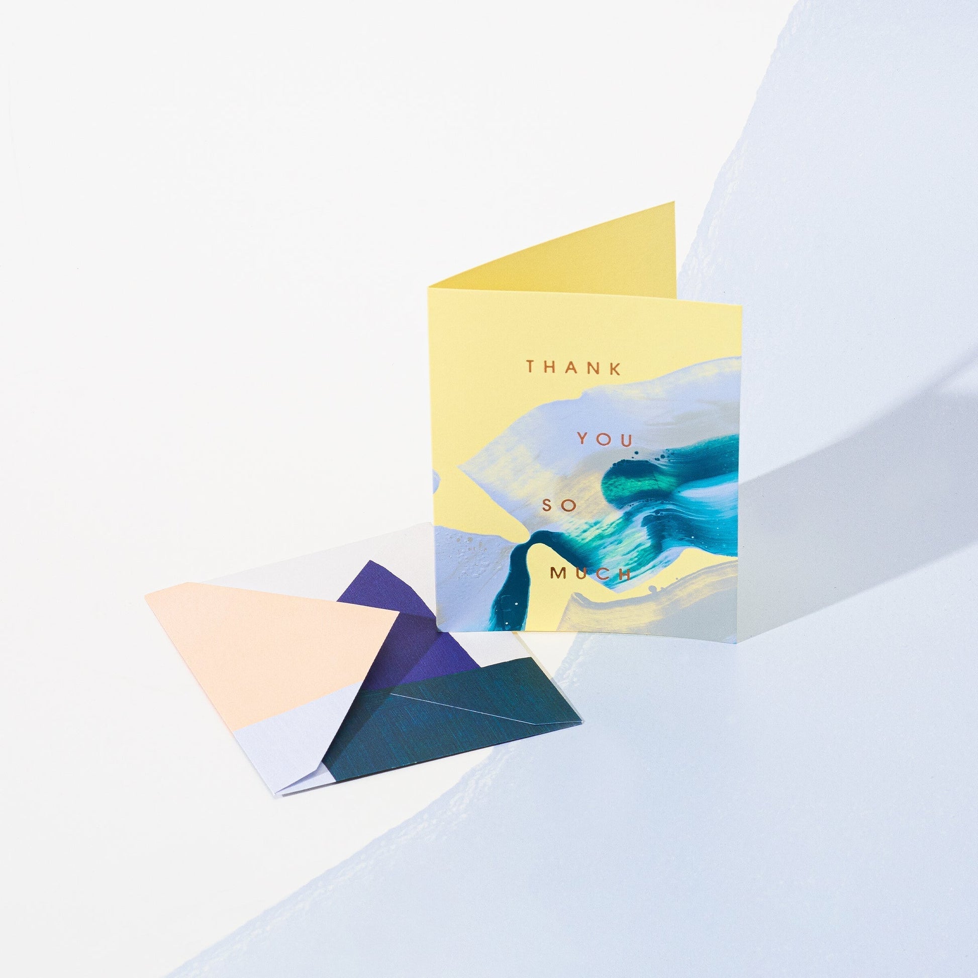 Each card is hand painted on large pieces of card stock before foil stamping on one of our antique foil presses. The result is a completely one-of-a-kind card. This card uses our swirl painted process.