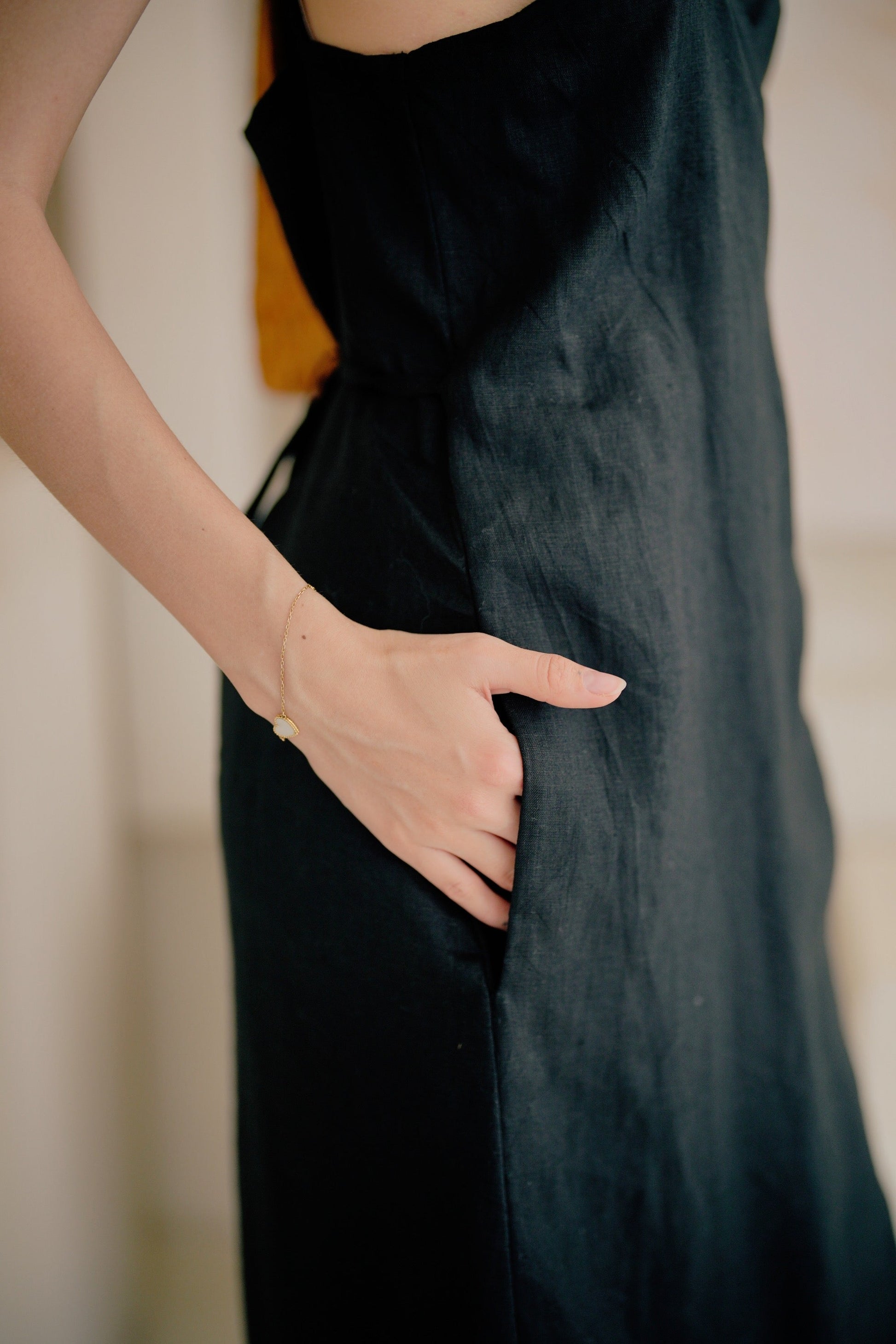 So lovely in this gorgeous midi dress, features in a surplice wrap front silhouette with V-neckline and adjustable shoulder straps, two sided pockets for a chic style. With our made-to-order approach, every piece is created by need which allows our talented artisans to take their time to focus on every detail. Every tailor-quality garment is specifically made specially for you. Every stitch is meant to keep our artisans craftsmanship culture alive. Our model is 5‘7” Size S and is wearing One size. Dress length measurement: 41.75” / 106 cm (breast to bottom). Adjustable shoulder straps, wrap-inspired silhouette. Two sided pockets. Hand wash cold. Lay flat to dry. 100% linen. Shipping & Returns: Return accepted for store credit only. Please see our Shipping & Returns page for more details.