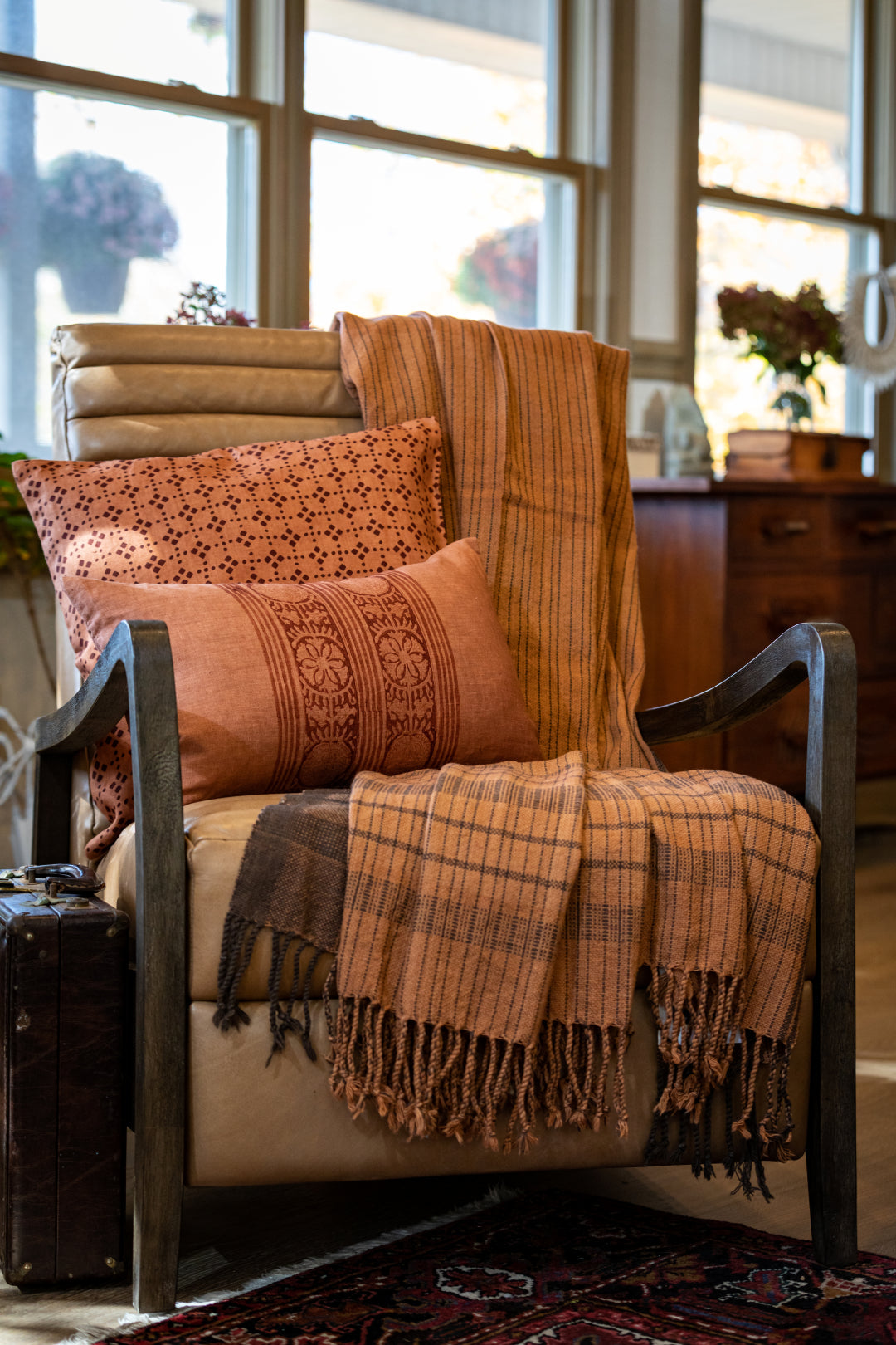 Cinnamon pillow cover with Anjali Dots printed in Cacao.