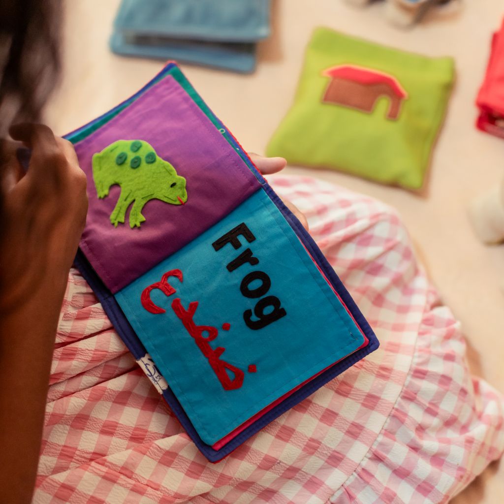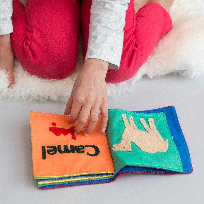 In this Animal Book, there are comparisons of each creatures' Arabic and English names. These comparisons display letter and sound differences between the two languages. The book directly aids reading and writing development. This toy provides not only visual stimulation but also a rich tactile sensation. The pages are made with soft, textured materials that offer various sensory experiences. Your child can play independently or with a friend, at home or traveling!