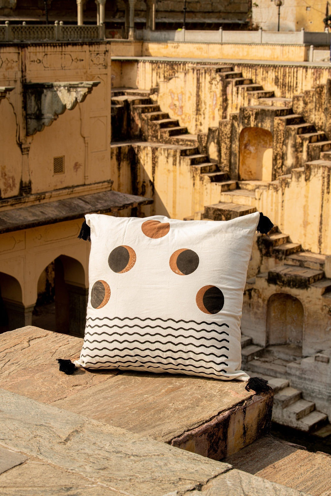 This reversible, hand-printed quilt on a crisp white base presents a modern take on lunar motifs. One side showcases a prominent brown moon, while the flip side features the lunar cycle in shades of black and brown.