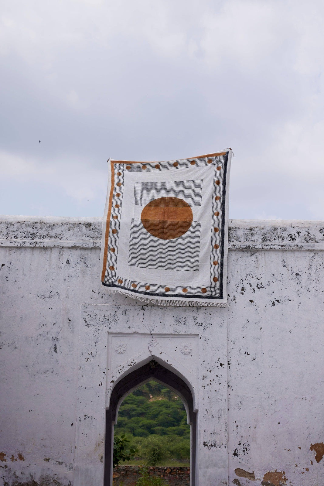 The design is hand-pressed onto each rug using hand-carved wooden blocks dipped in dyes. All rugs are made in small batches.