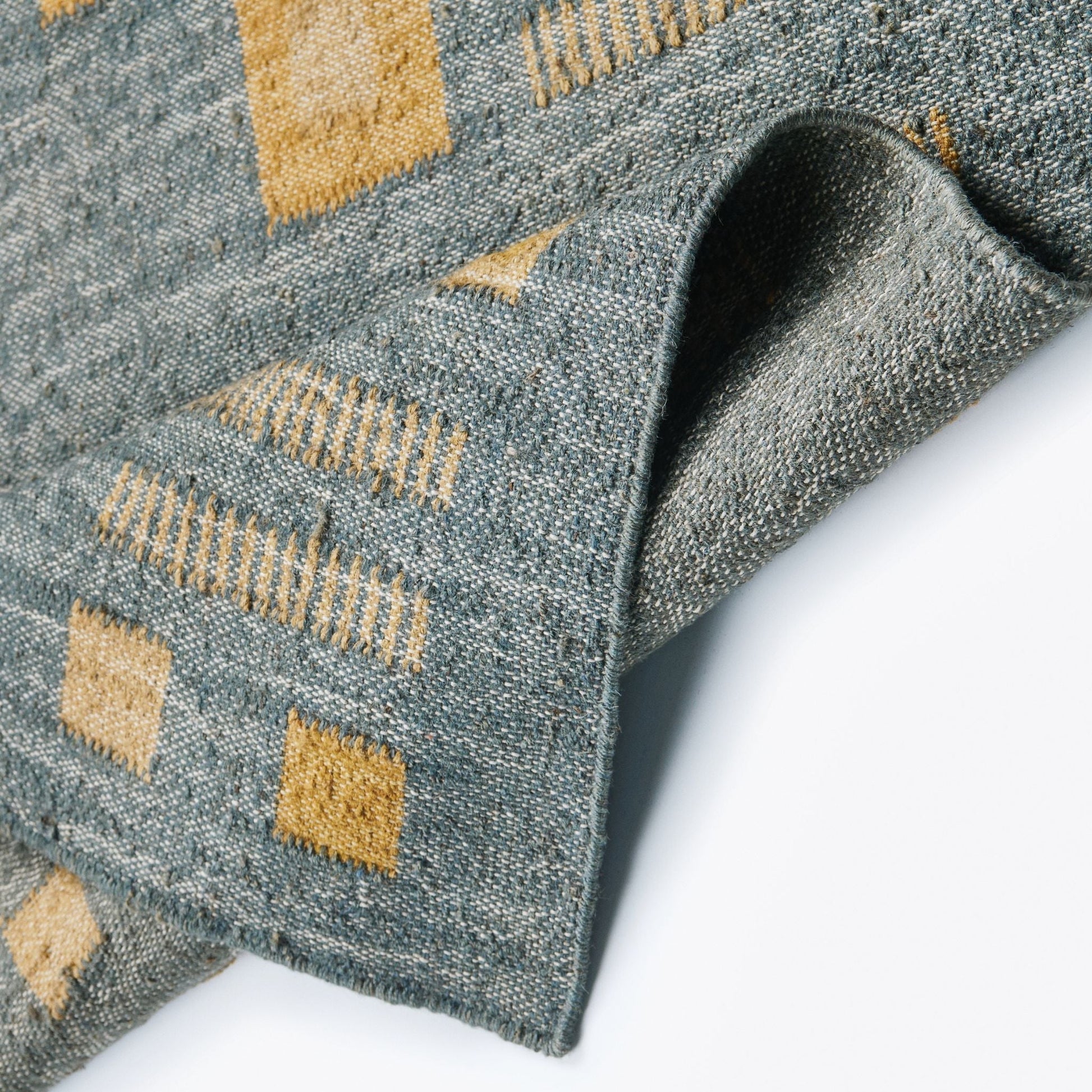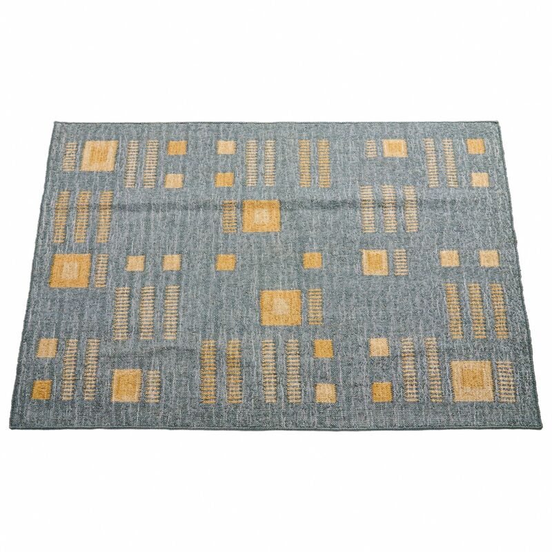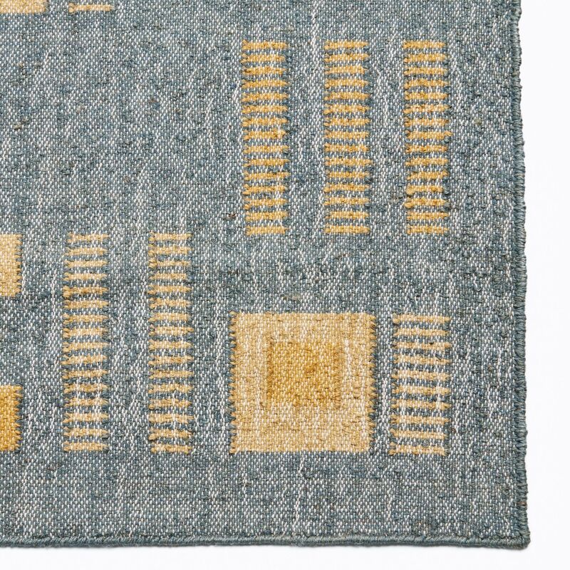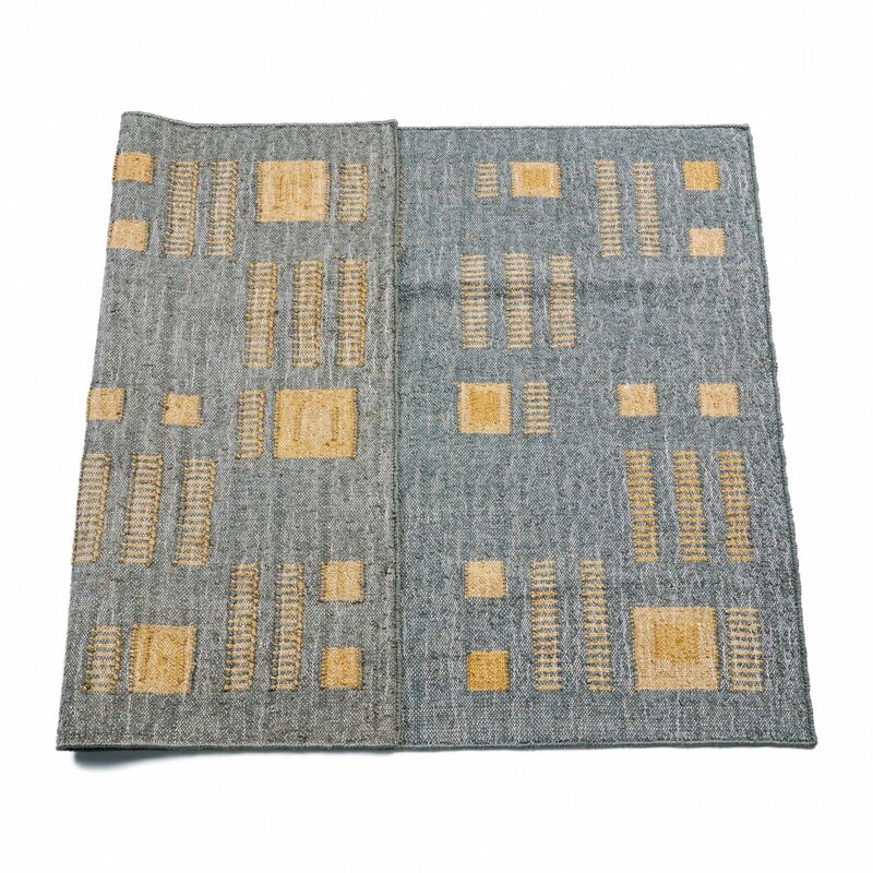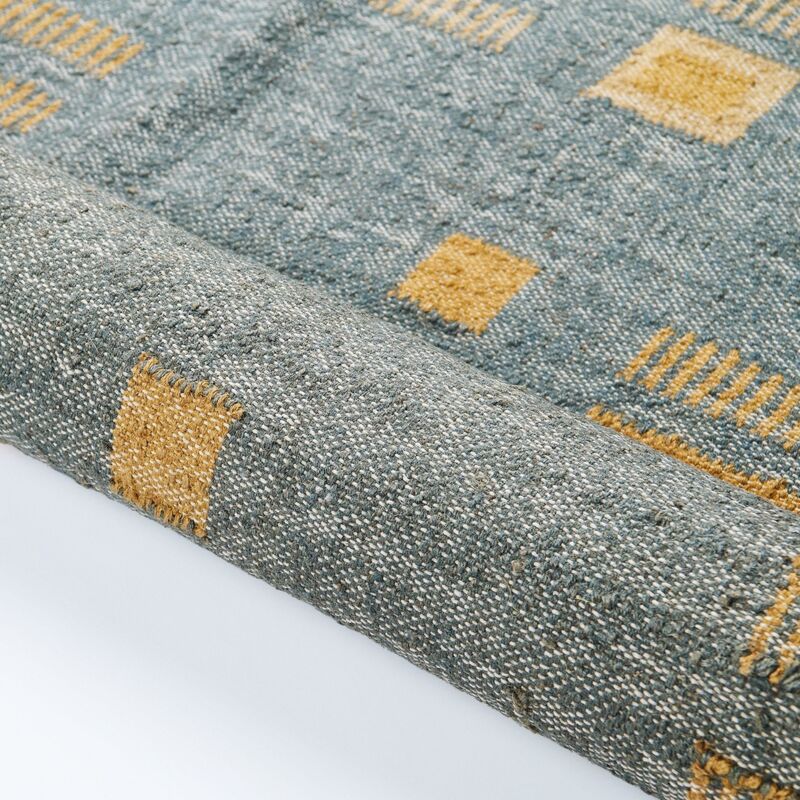Ash Blue Rug has been carefully handwoven by heritage rug weaver community in India . Handwoven completely on our custom design , we are using 100% jute and it is light in weight. The blend of natural yarns and unique technique used creates a double color effect in the geometric repeat pattern design of rug in pleasant ash blue hues with a pop of topaz making it suitable for a studio, office, guest , living room space or hanging it as a wall decor. Complete process is done by hand, which mean each piece is unique and one of a kind. A classic rug, it will enhance interior spaces and also support artisan communities ethically. If looking for a custom size please email for more details. Size: 4 Feet X 6 Feet ( 48"x 72" ) Material: 100% jute Colors: Shades of ash blue with topaz yellow. Origin: Ethically & responsibly handwoven by rug weavers in India. Wash care: Gently hand wash with cold water and hang dry. Custom Sizes : Possible. Email at info@studiovariously.com for more info. Swatches : Email at info@studiovariously.com to request for swatches. Swatches in stock. Lead time : 8 to 10 weeks including delivery. What Makes Your Purchase Sustainable? Non toxic dyes used. 100% handmade manufacturing process by rug weaving artisan clusters. Use only 100% natural + biodegradable responsibly sourced materials. Small batch production ensures higher quality & less wastage.