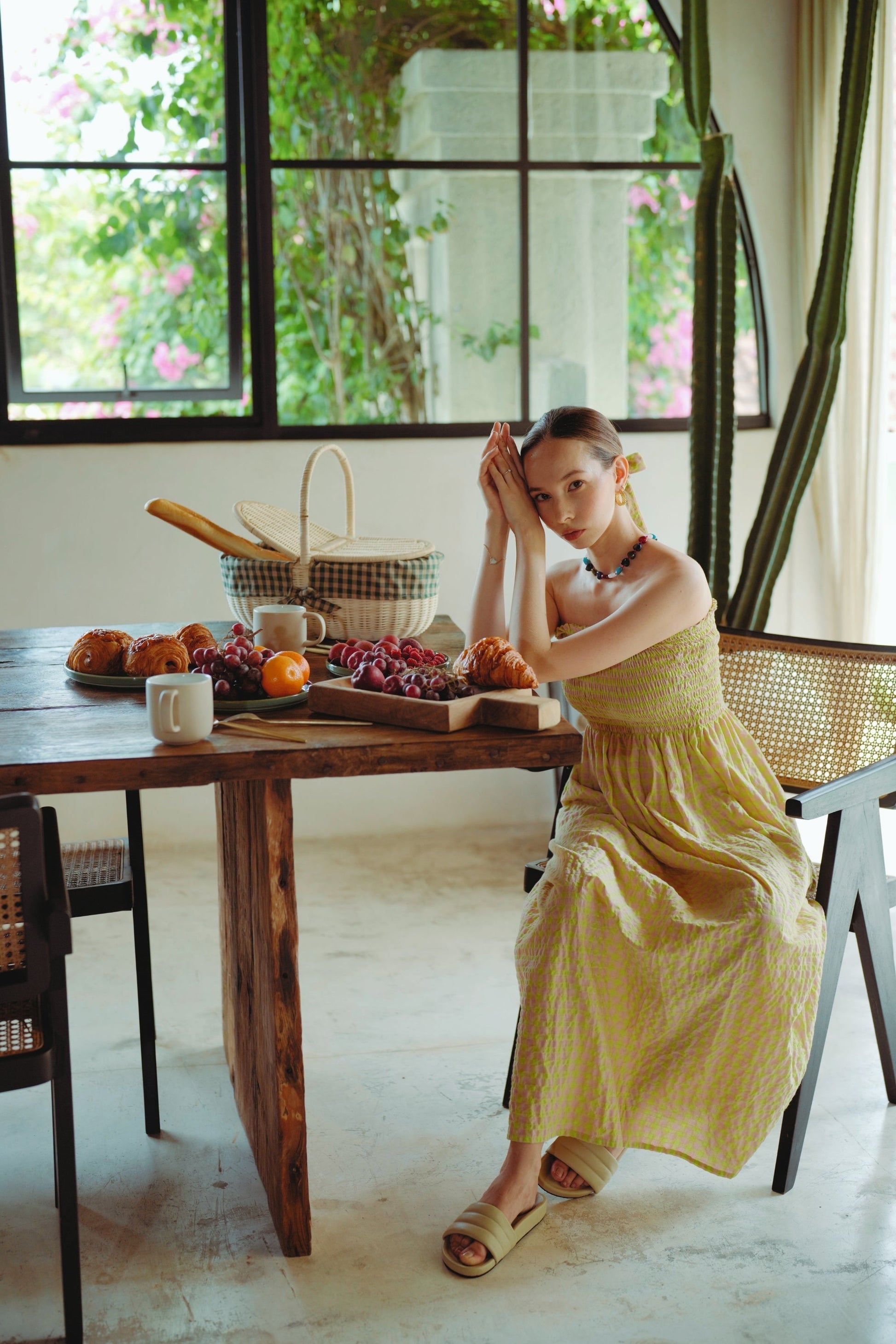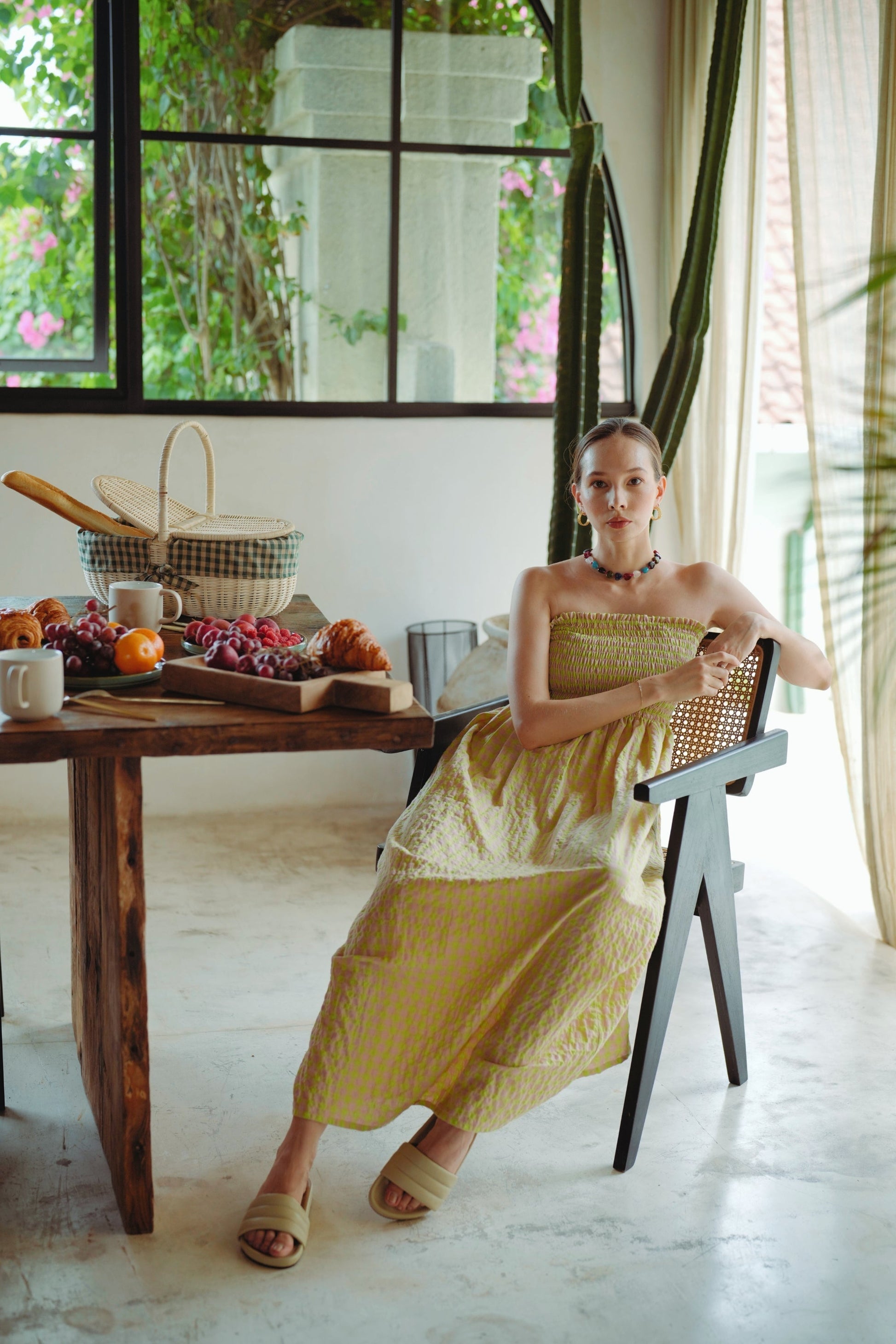 Ava Strapless Crinkle Gingham Dress in Lemonade