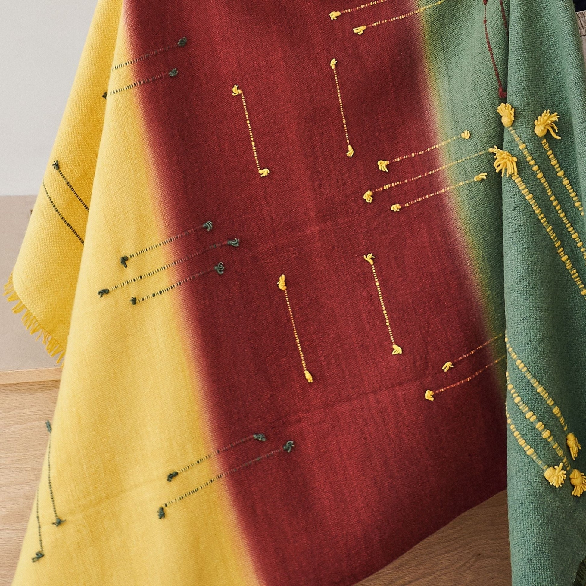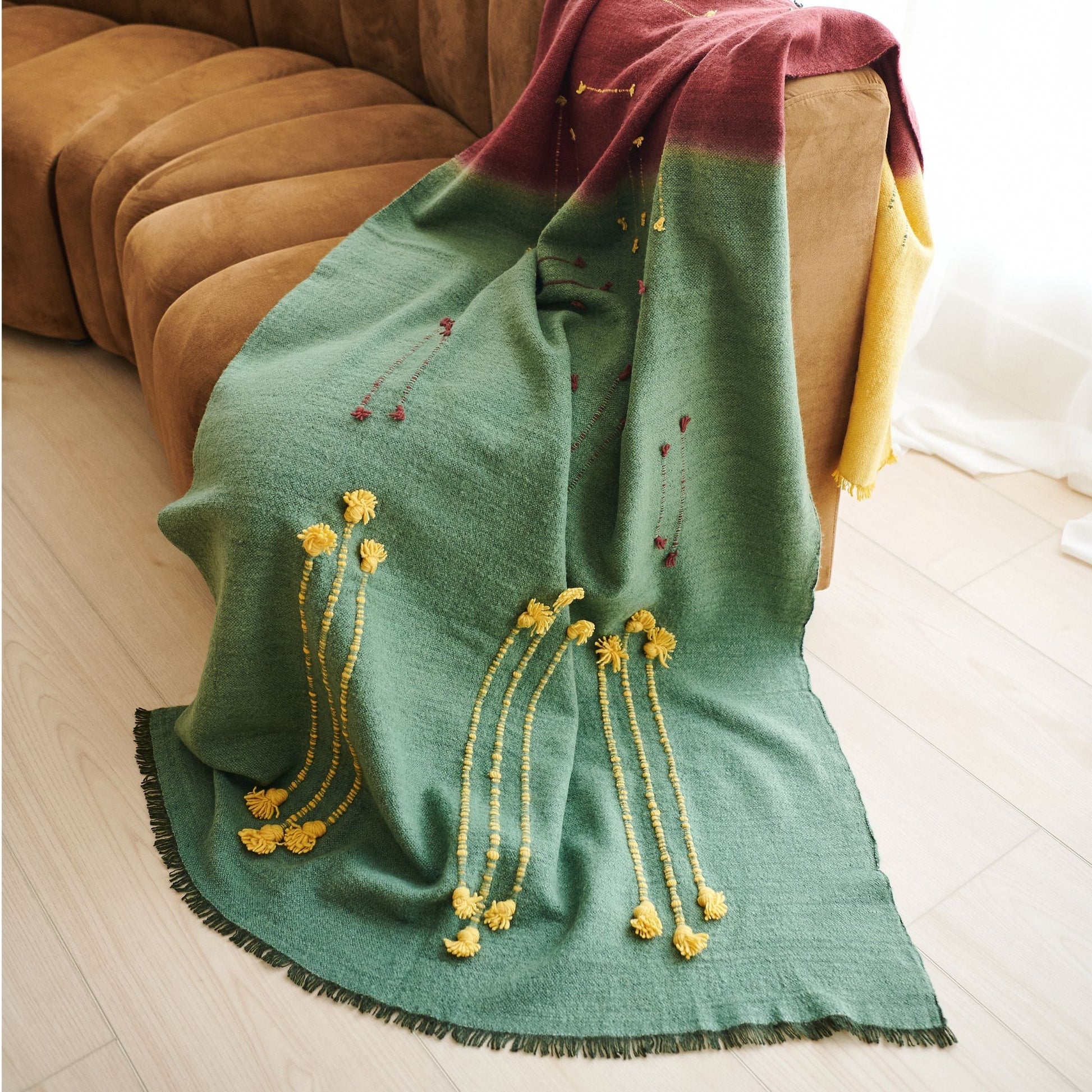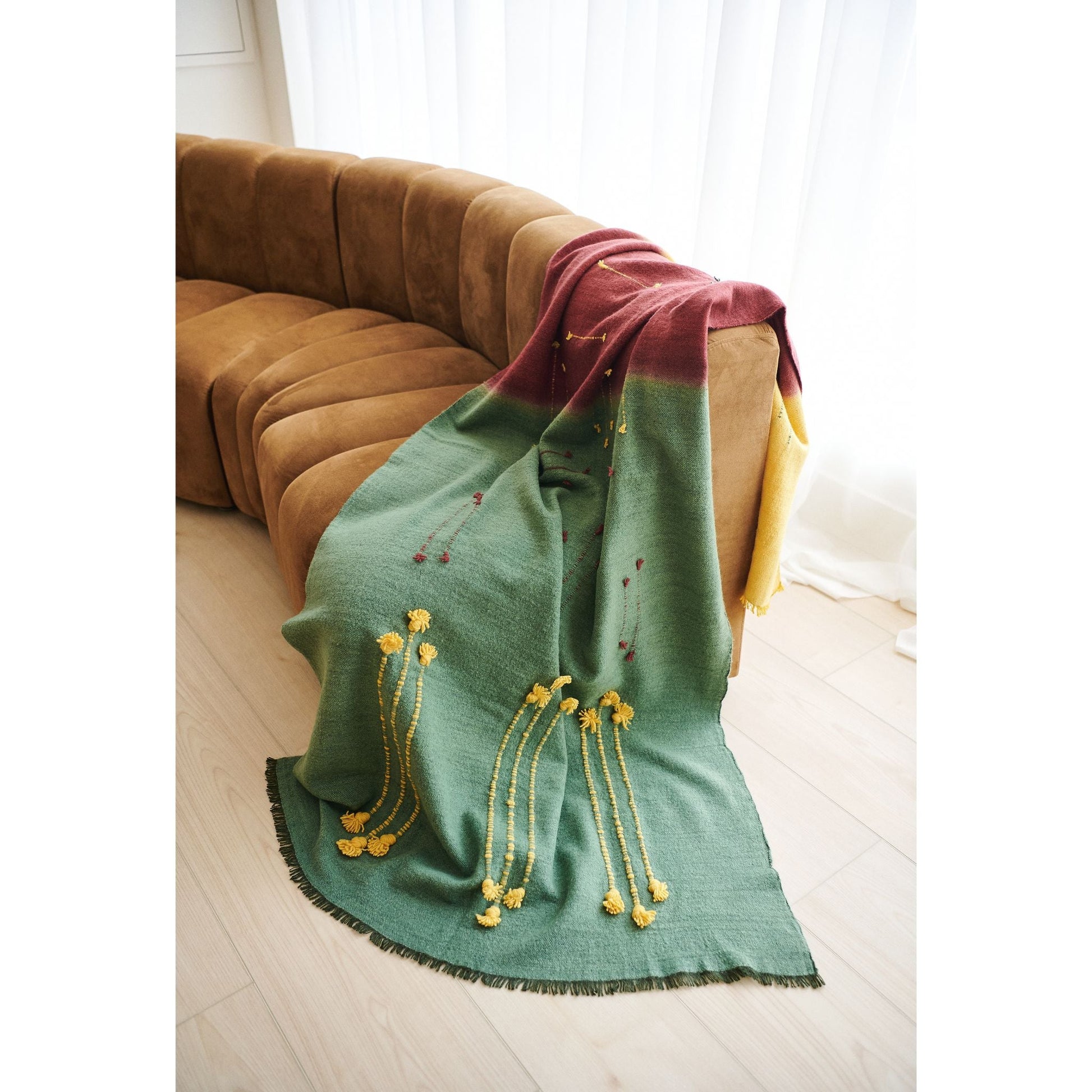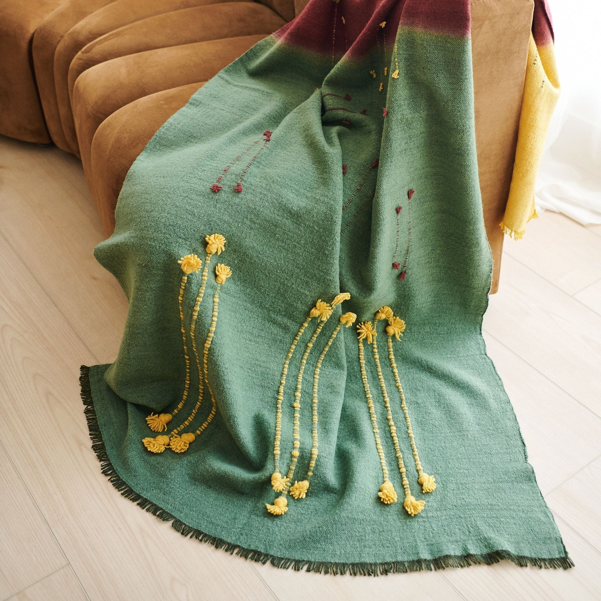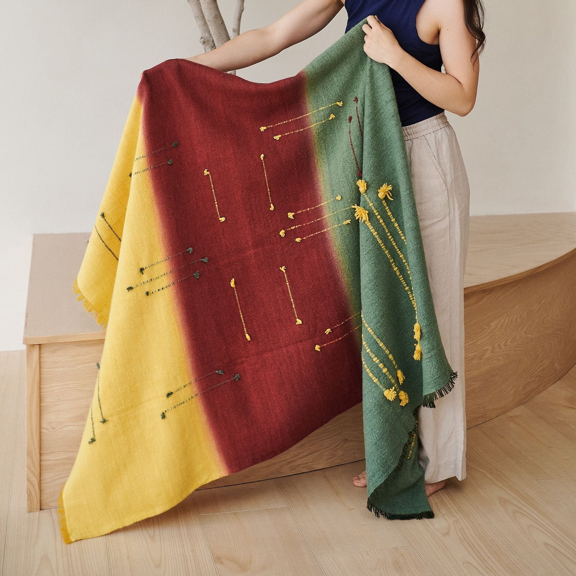 A quiet reflection of the walk in the woods with bold contrasting color choices and textural details all created meticulously by expert artisans is what Avacado Throw is all about. Modern harmony brought to life with locally sourced hand spun merino from the foothills of Himalayas, scoring well on carbon footprint impact as well. Avacado is quite a statement making piece , adding warm earthy tones to your interiors and living spaces. Each piece is 100% handmade from start to finish, making it a unique sustainable throw which is both classic and minimal modern in its appeal. Avocado Throw is soft to touch and wears well over time. Requiring attention to detail and finishing, this throw luxuriously combines heritage value. High quality craftsmanship makes it reversible to arrange and use. Fringes are kept short for a modern look. Eco friendly dyes Swiss dyes are specifically engineered to promote the lifespan of each throw. As this luxurious piece is completely handmade from start to finish Designed by Variously in Michigan, each throw is developed in direct collaboration with handloom weavers based in the foot hills of Himalayas in Nepal. Avacado is a timeless throw / blanket that will complement your personal or living spaces. While also being a thoughtful gift, Avacado Handloom Throw also supports artisan communities ethically and directly ( no middle men ) Throw Size: 110 cm X 210 cm Material: 100% soft merino from Nepal Colors: Avacado green, rustic red, ochre yellow Artisan base: Ethically & responsibly handwoven by artisans in Nepal. Wash care: Gently hand wash using gentle detergents. Hang dry in cool shaded place or delicately dry clean only. What Makes Your Purchase Sustainable ? Eco friendly dyes free of toxic chemicals used. Support employment of women artisans. 100% handmade ethical manufacturing process by artisans. Uses only 100% natural responsibly sourced materials. Small batch production ensures higher quality & less wastage. Note: Avacado Throw is available in stock from September 2025 onwards. Your purchase will reserve your piece in our production batch. Variously will inform you right away with more updates on delivery.
