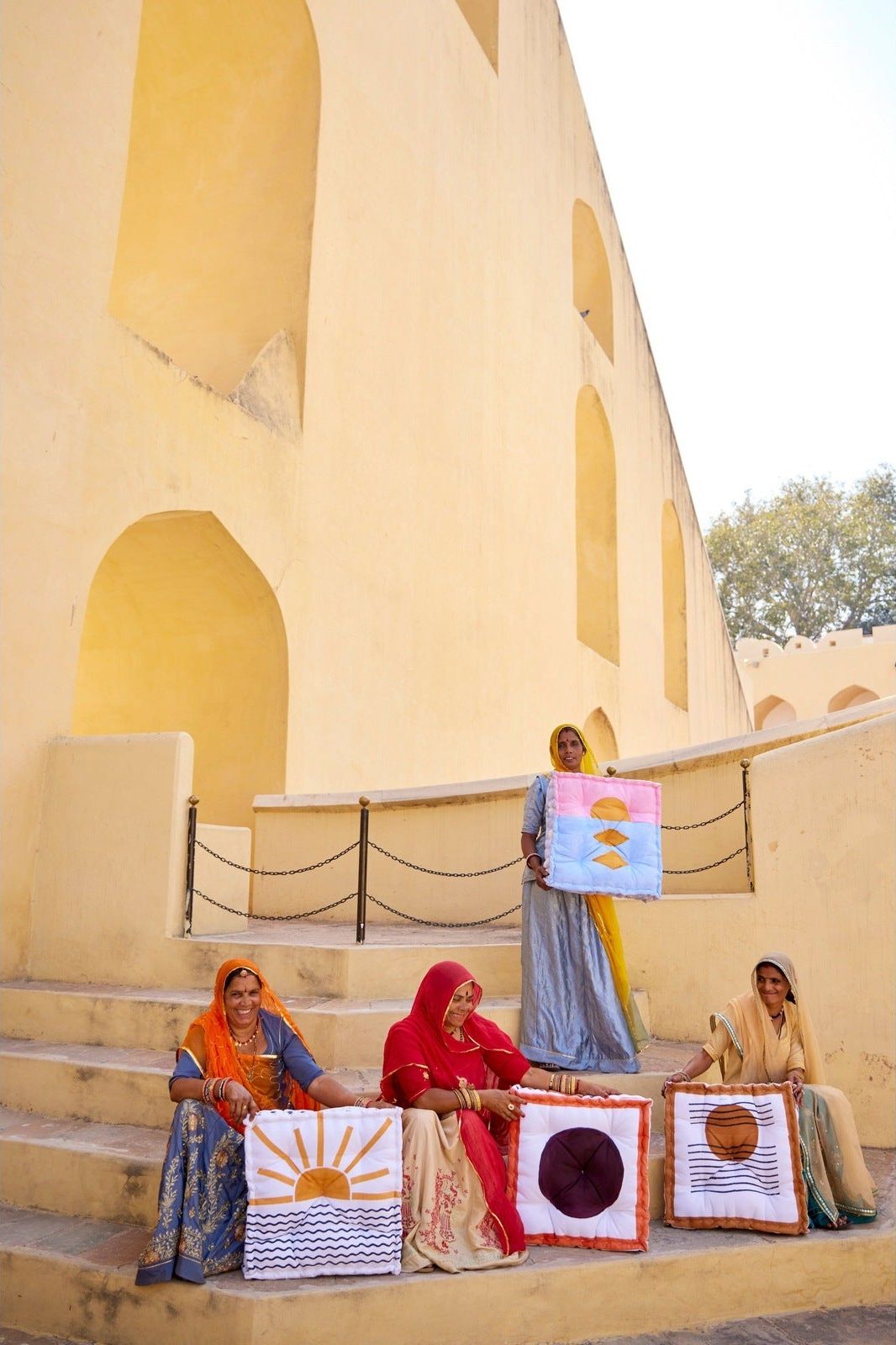 The cushion’s design is hand-pressed onto cotton using hand-carved wooden blocks dipped in dyes. The printed cotton shells are then brought to the homes of sewists who stuff and stitch the pillows by hand, creating the final product.