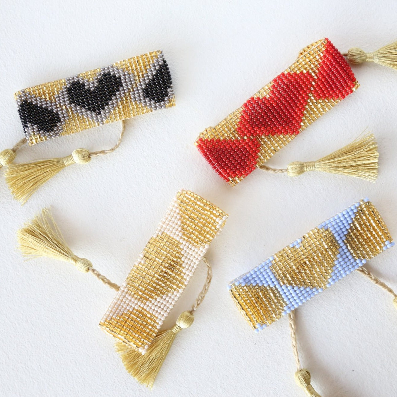 Hearts in black & gray, black, with a gold bead boarder and tassels.