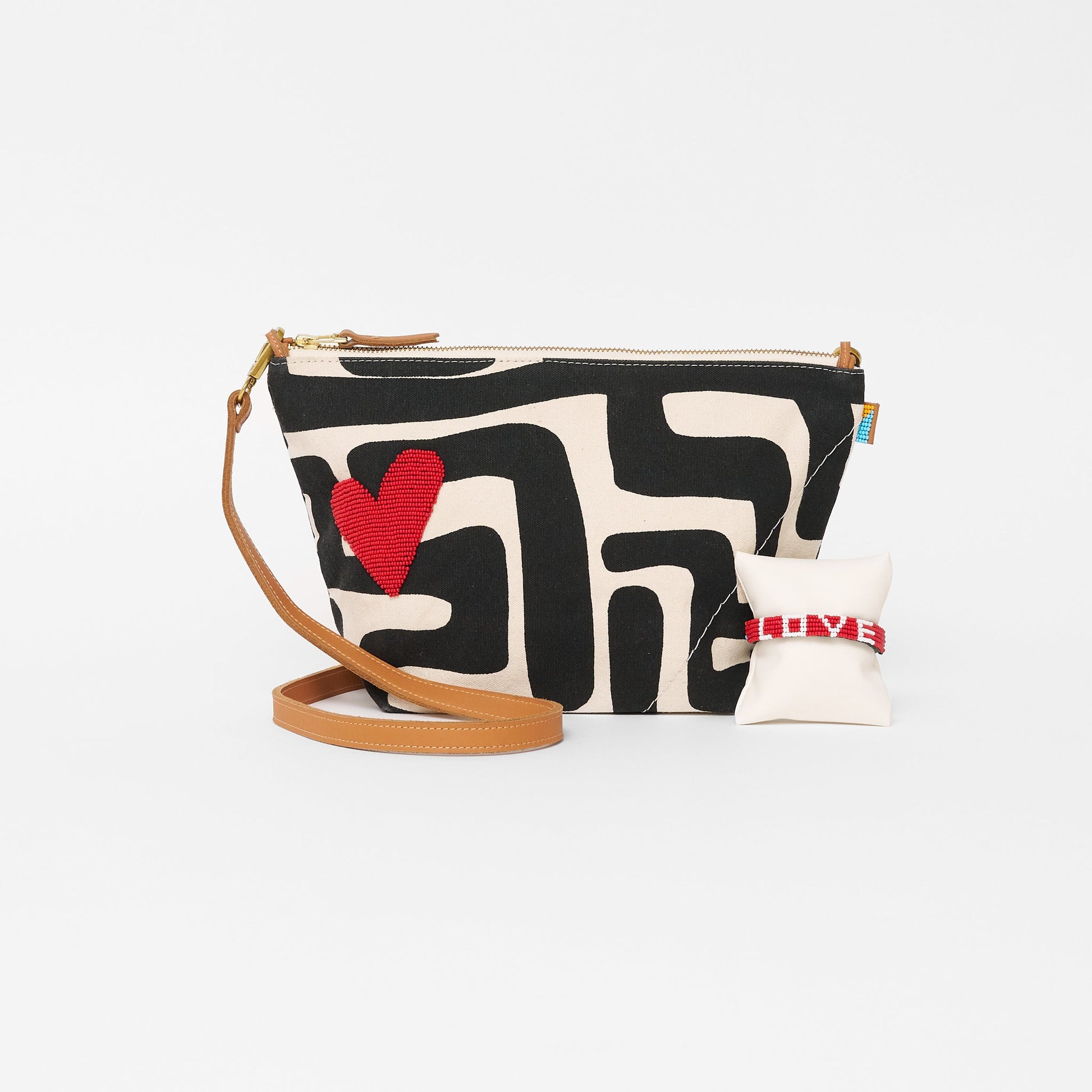 This bundle features our Black Kuba XLarge Convertible Pouch with Beaded Red Heart, Medium Leather Strap for Convertible Pouches, and Red and White LOVE Bracelet.