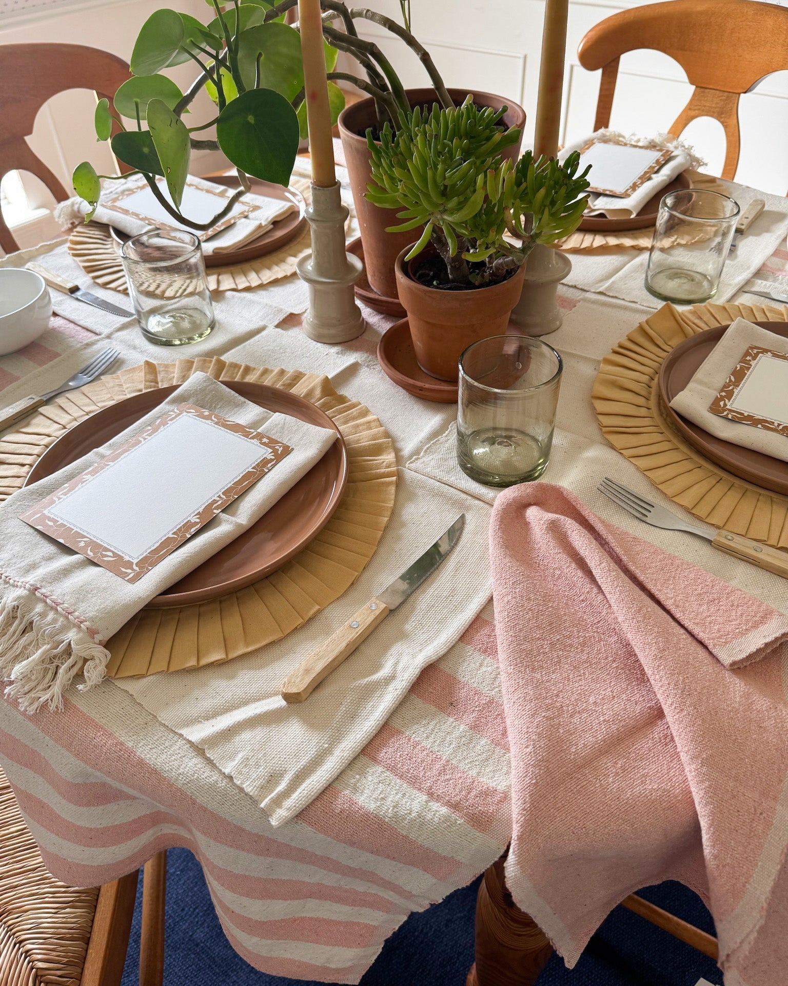 This best-selling, 14” x 28” blush hand towel is 100% organic cotton & can find many uses around the home. The texture, handmade quality, and simple solid color with a thin natural border along the edge set this hand towel apart. Spun, dyed (AZO free), & created by artisan partners.