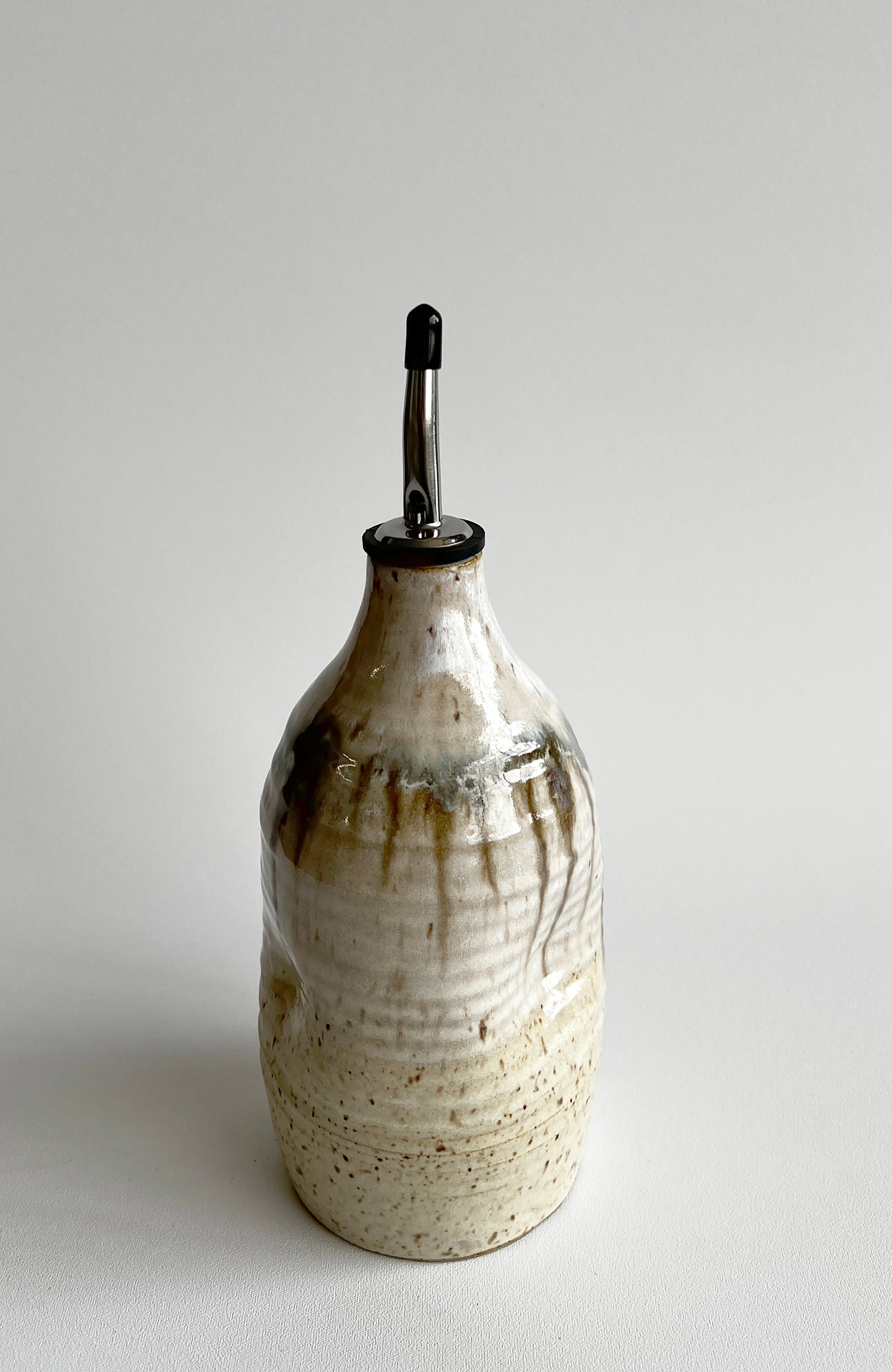 This item is a best seller! Add a touch of elegance to your kitchen with the Borealis Ceramic Oil Cruet from Gina DeSantis Ceramics. This hand-thrown cruet is not only practical but also beautifully designed with three thumbprint indentations for easy grip and a narrow neck spout for drip-free pouring. It stands 8 inches tall (10.5 inches with the spout) and holds approximately 22 ounces of oil or vinegar. Whether you're cooking up a storm or hosting a dinner party, this ceramic oil cruet will surely impress with its functionality and style. Dusk: Contains more bright pink tones Dawn: More of a neutral mix. The pink is subtle. *All of my products are made by hand and will vary. Each glaze firing varies as well. Please keep this and my refund policy in mind when you place your order. Thank you.