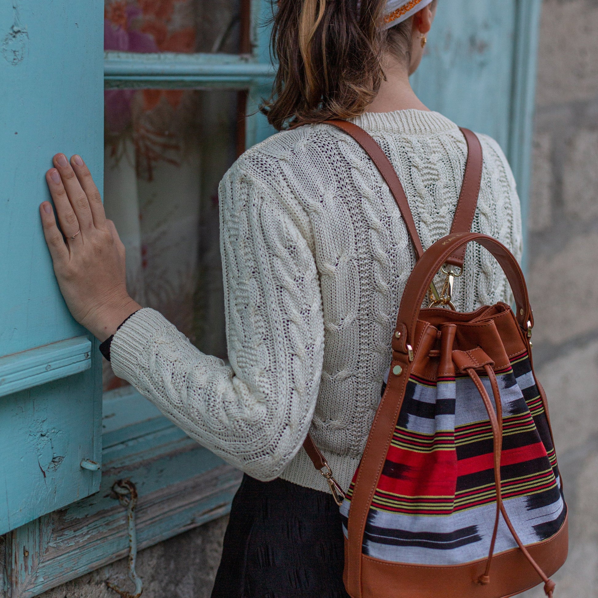 Kuz is ready to give you the comfort and everyday practicality with its convertible form. Being 3-in1 -means hand, shoulder and backpack bag, this handcrafted leather women bag offers you the freedom you need during your trips, walks or vacations. interior leather zipped pocket four protective feet at base a K'ai&Vrosi embossed logo drawstring closure poliester-cotton lining removable hand strap handloomed Turkish fabric size: 28x25 cm / 11x10x5 inch Fabric pattern placement may vary per product. If you have any special order please specify.