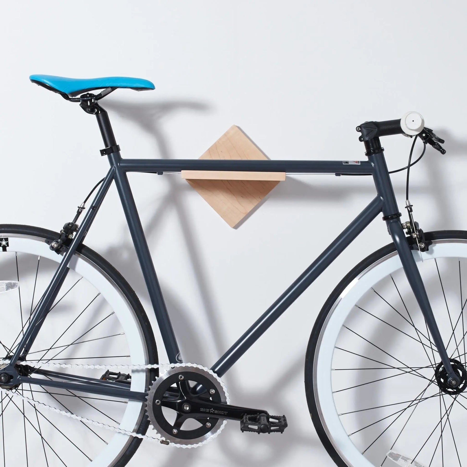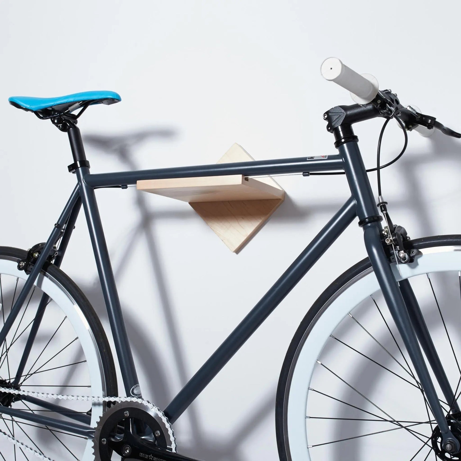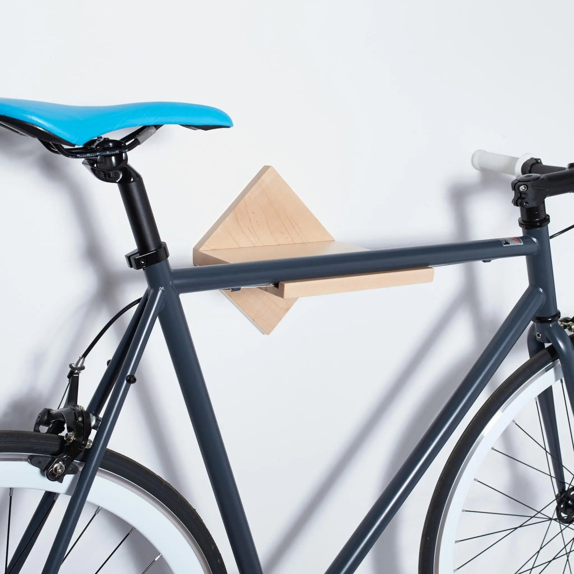 The modern/minimalist design is super clean and a great match for the space constrained and design conscious cyclist. The bike’s top tube rests securely on a built in notch and you can use the shelf space for your helmet, lock or accessories. Crafted from high quality Maple and finished with a clear coat to showcase the natural beauty of the unique wood grain.