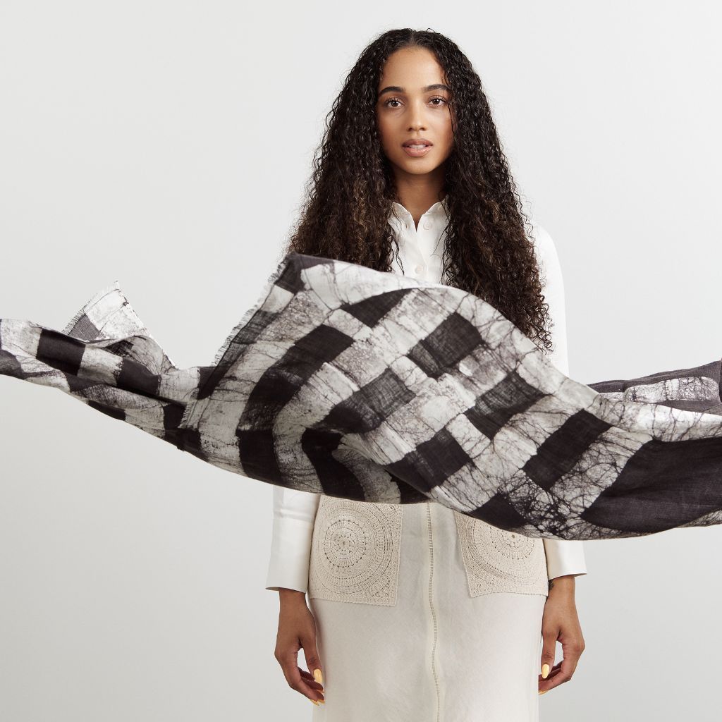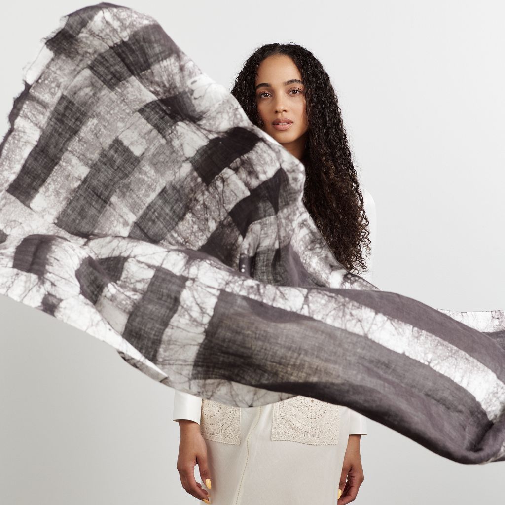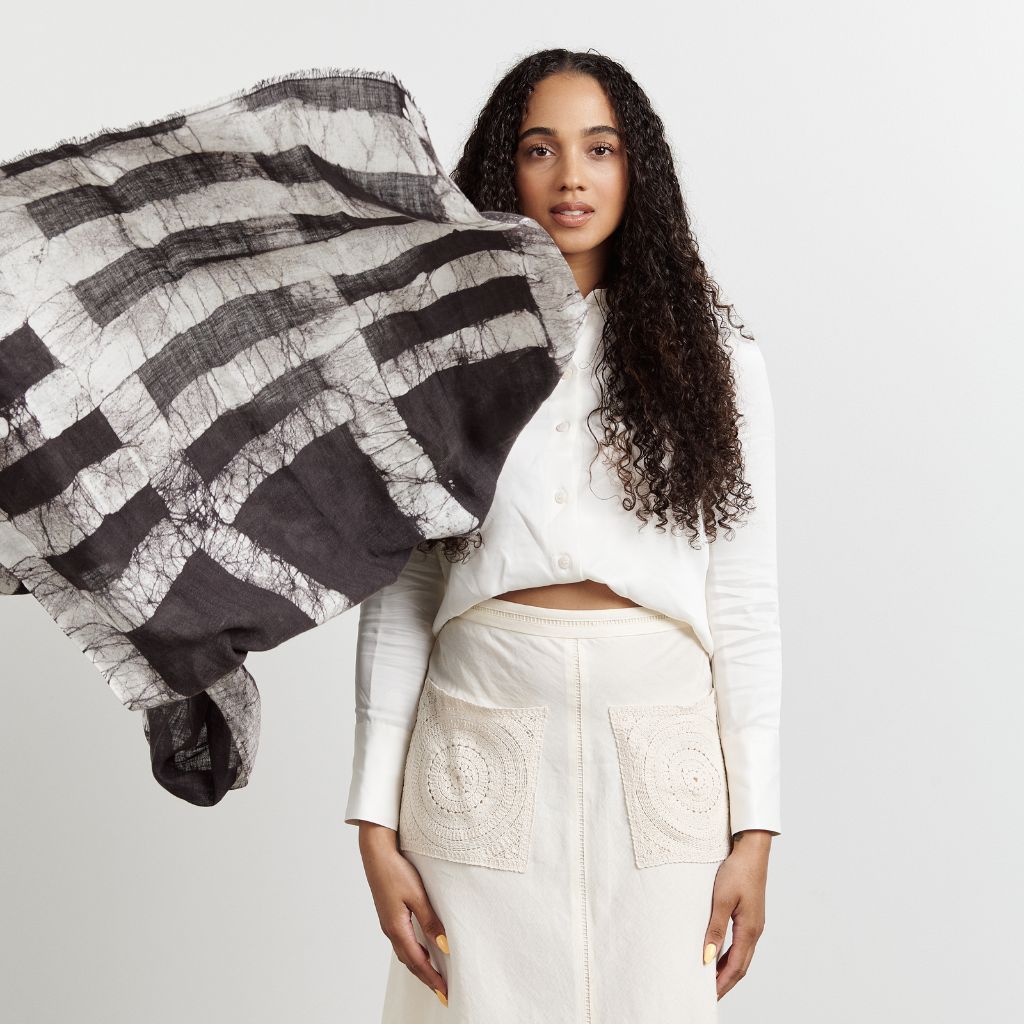 Carbo Black & White Handwoven Wax Block Printed Linen Scarf