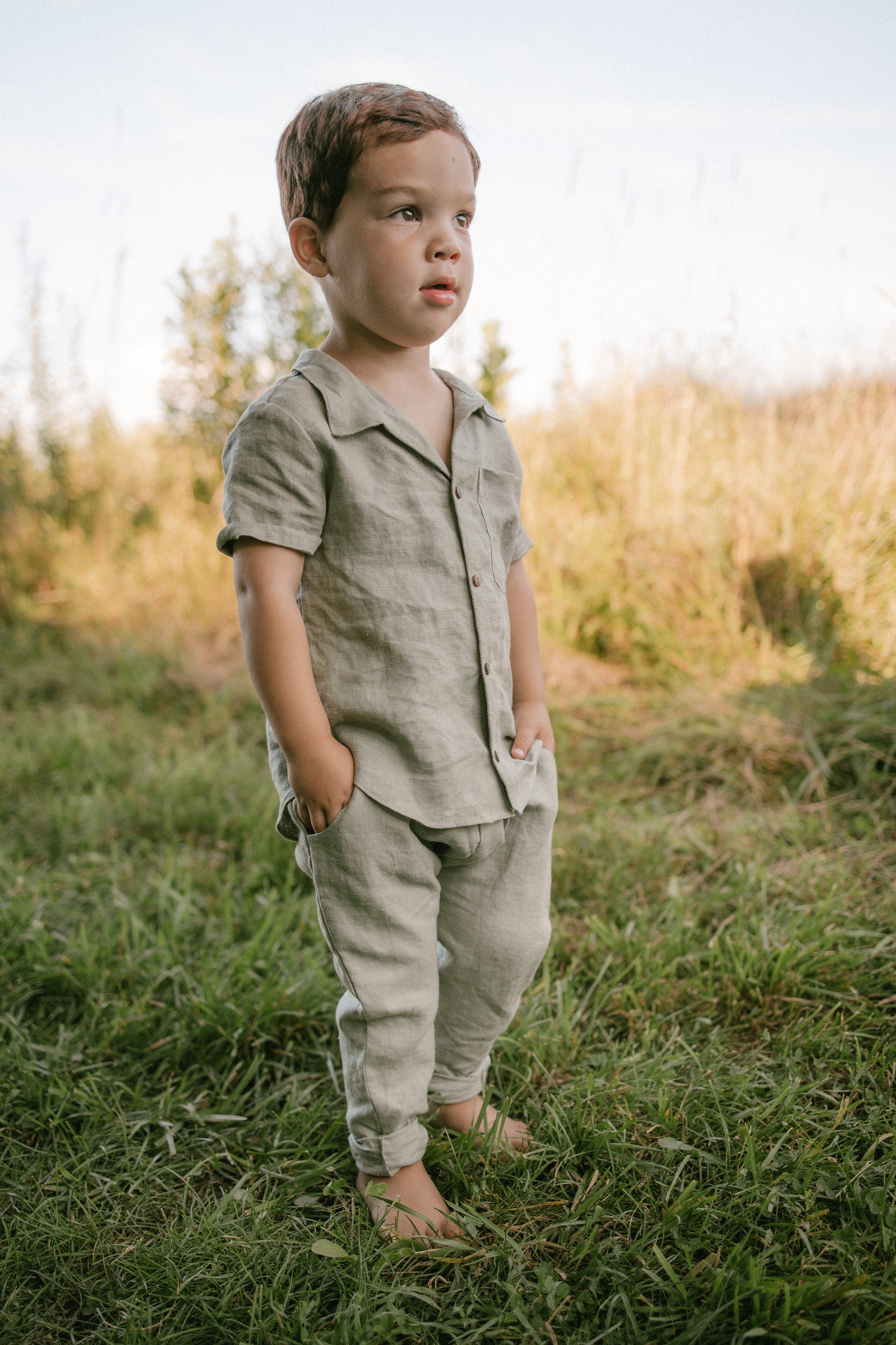 This classic linen shirt and harem-style tapered cut pant set is made from durable flax linen for lightweight comfort and excellent wear resistance. The shirt features a breast pocket, double yoke, front button opening, stand up collar, short sleeves, and shaped hem. The Carter Pant has an expandable waistband, front pockets, and tapered legs for optimal roll-up-a-bility. Made from 100% organic linen and OEKO-Tex certified for chemical safety, machine wash cold and tumble dry low for maintenance.