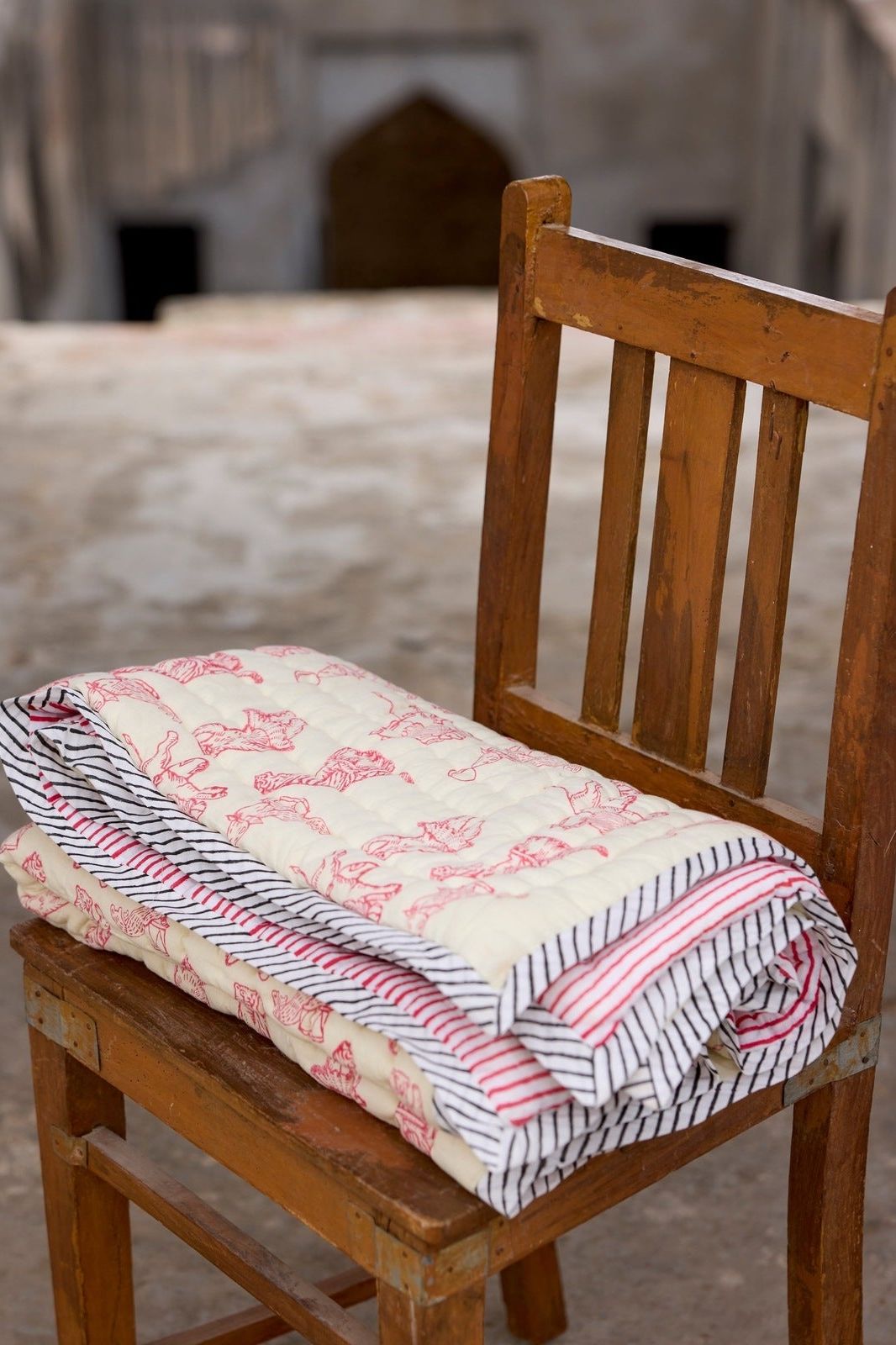 Artisans use hand-carved wooden blocks dipped in dyes to transfer the whimsical stripes and animal designs onto 100% cotton fabric. The printed fabric is then meticulously stuffed and stitched by hand by expert quiltmakers, ensuring every quilt is soft, durable, and perfect for your little one.