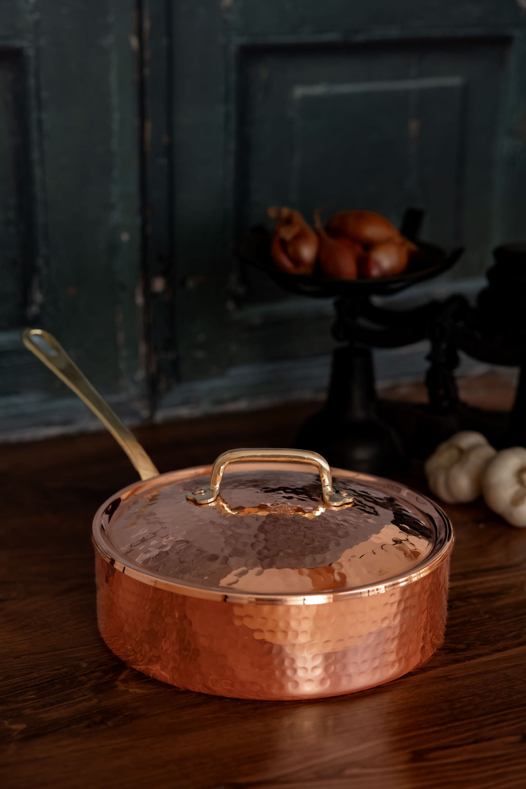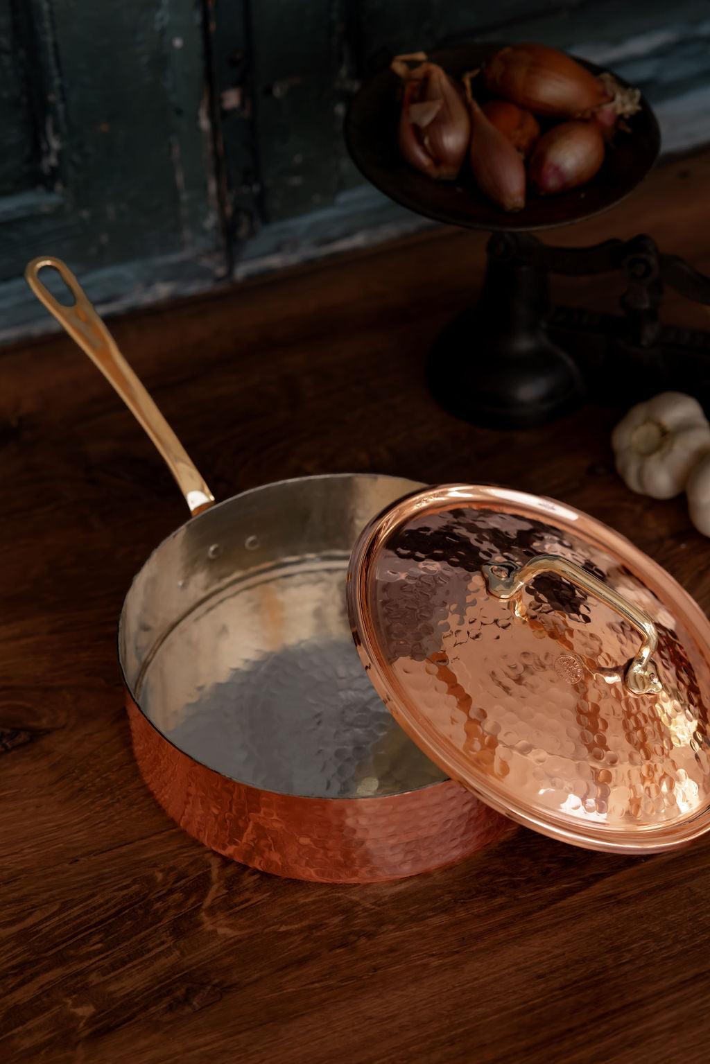 Perfectly sized and steeped in story, our Vintage Copper Medium Sauté Pan offers all the beauty and functionality of its larger counterpart—now scaled for everyday use. Crafted from 2.5mm thick copper with a hammered finish, this tin-lined pan heats evenly and looks stunning stove to table. Its signature handle design was inspired by a French company from the late 1800s, honoring the legacy of European copper craftsmanship.