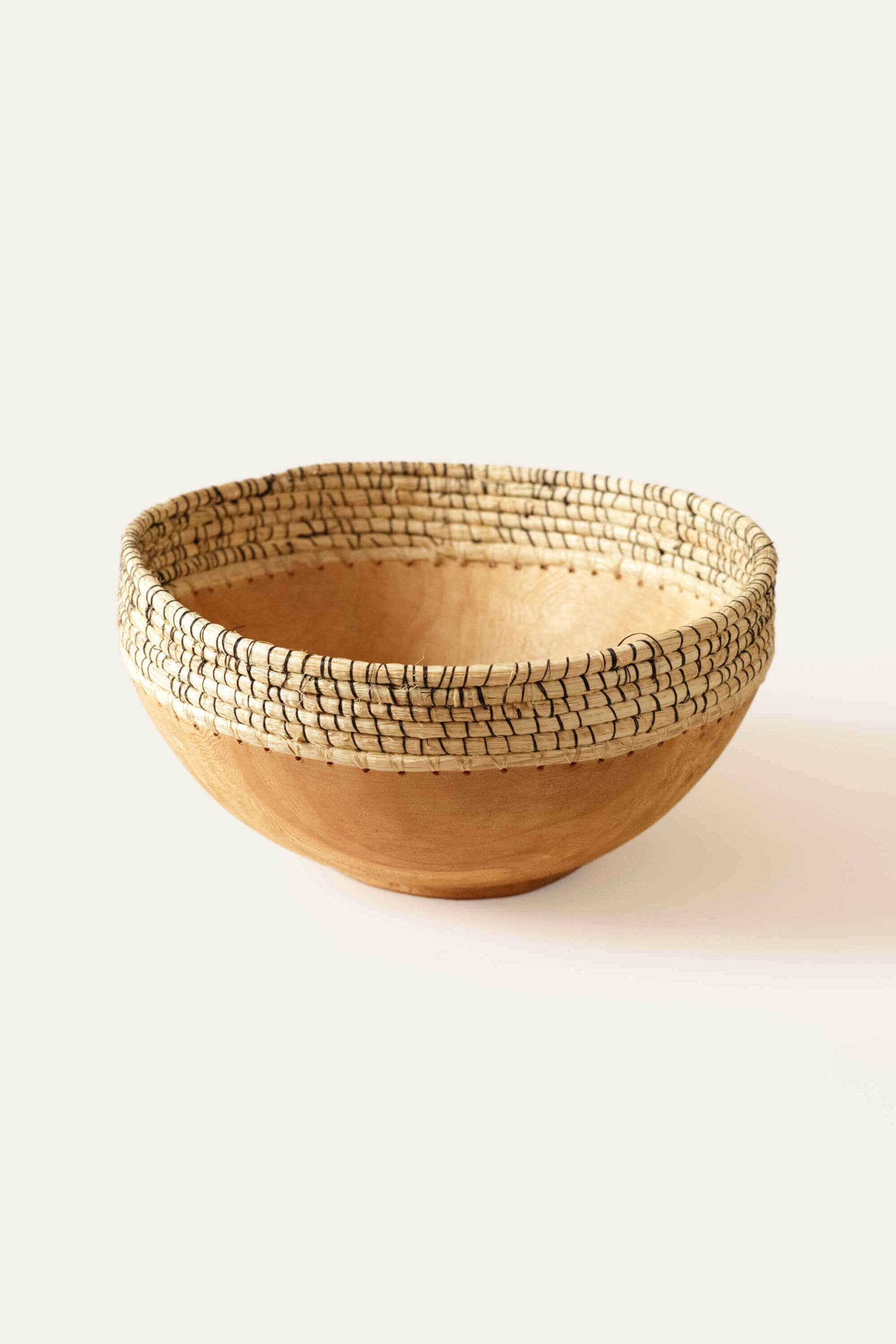 - Features a base made from jacaranda wood and a rim handwoven from locally sourced raffia fiber in natural and black