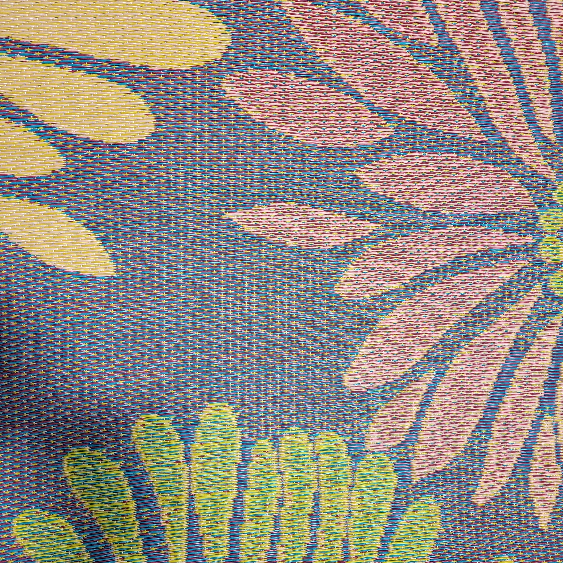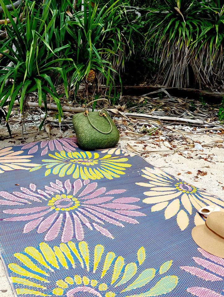 Featuring larger than life flowers against a colorful background, these richly toned, bold rugs are made of recycled plastic for outdoor or indoor use.