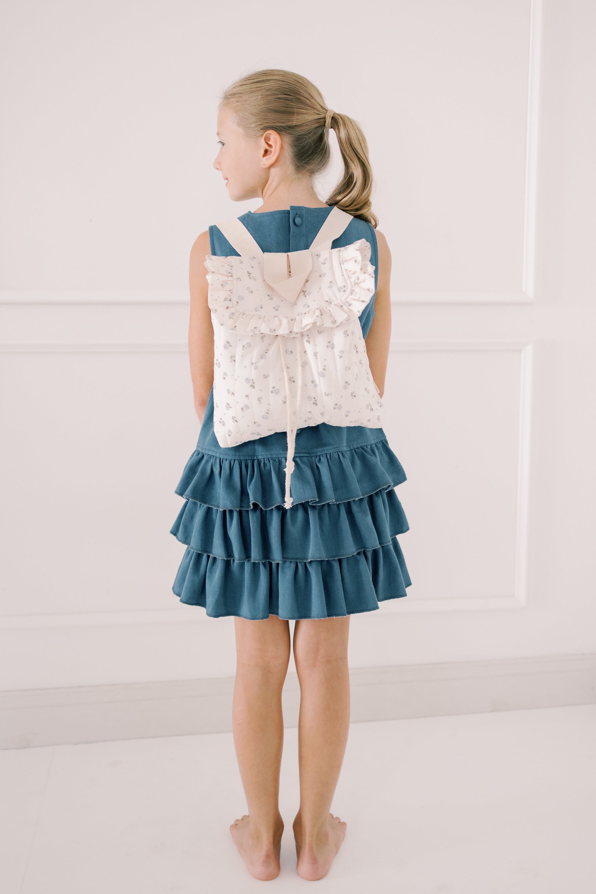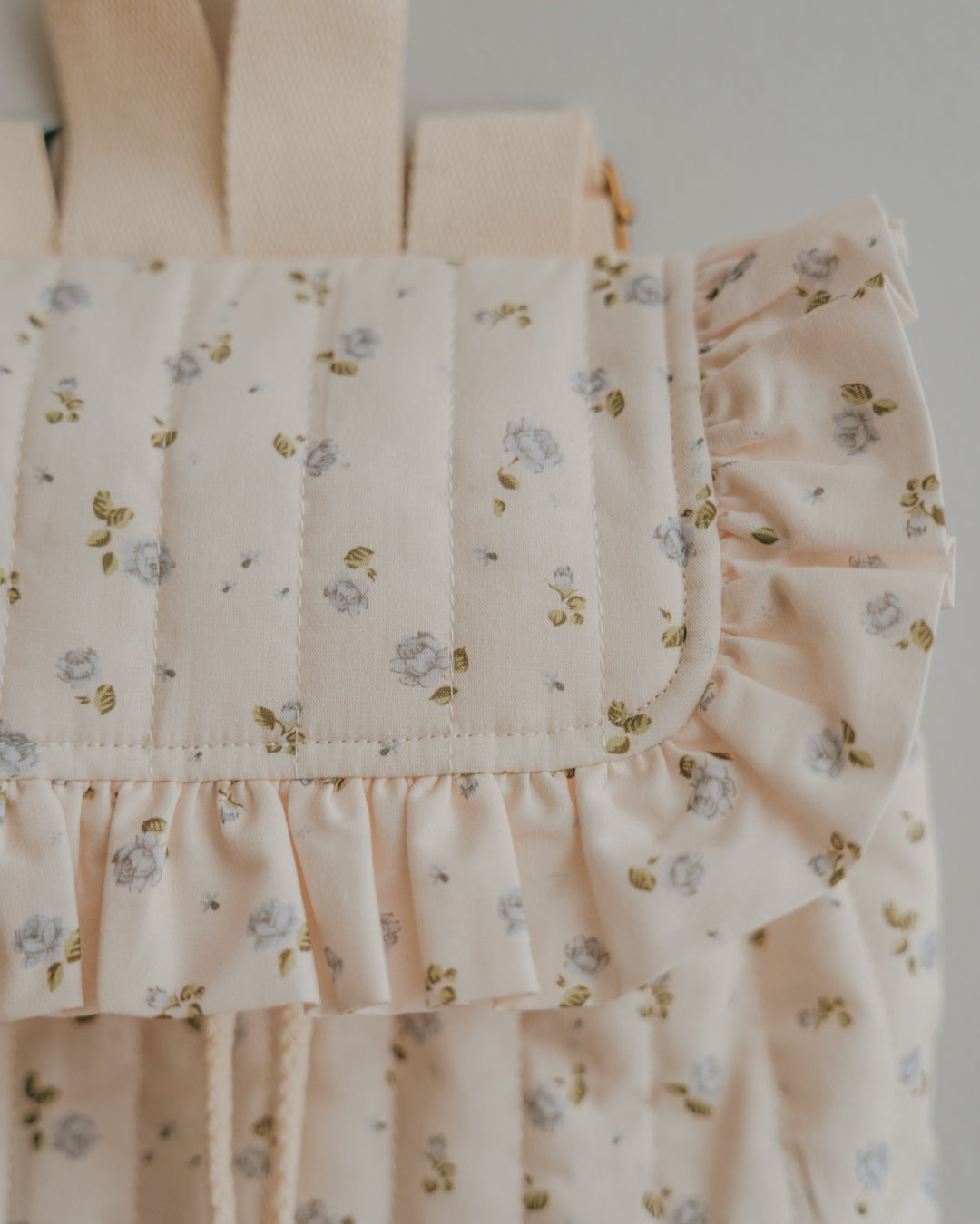 Vintage charm meets everyday practicality. The Eloise Quilted Backpack in Vintage Petite Blue is the perfect blend of vintage charm and everyday function. Crafted from soft quilted cotton, this lightweight backpack features adjustable straps for a comfortable fit and a secure zip closure to keep little treasures safe. Ideal for toddlers and young children, it’s just the right size for school essentials, small toys, or travel. A practical heirloom-inspired piece for every day. The quilted body offers gentle structure, while the ruffled flap and drawstring closure bring a whimsical, heirloom-inspired touch. Perfectly sized for little ones (11.02” x 10.24”). Details: Two timeless florals: Vintage Petite Blue & Vintage Rose Dimensions: 11.02” H x 10.24” W 100% cotton shell with quilted padding Drawstring closure with ruffle-trim flap Adjustable cotton straps Spot clean recommended
