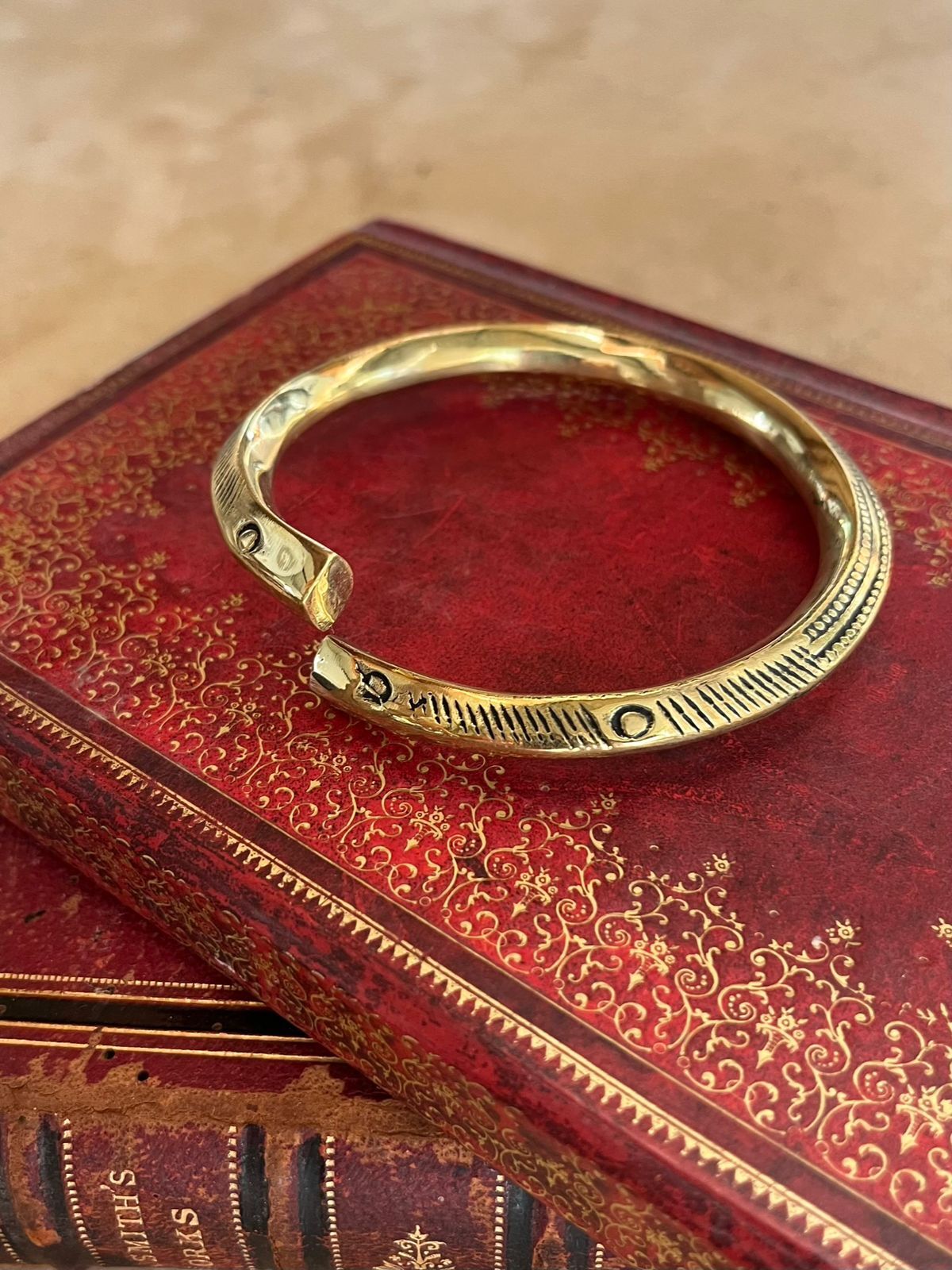 Traditionally, Ethiopian silversmiths hand make their jewellery using the lost wax method. The designed piece is moulded with wax, encased in clay and left in the sun to dry. Hot metal is poured into a hole at the top of the casing. This metal melts the wax inside, taking the shape of the wax. The cast is broken to retrieve the jewellery after the metal has cooled. Cast from an Ethiopian antique arm bracelet, sourced from a market in Addis Ababa and modified to enhance the engraving.