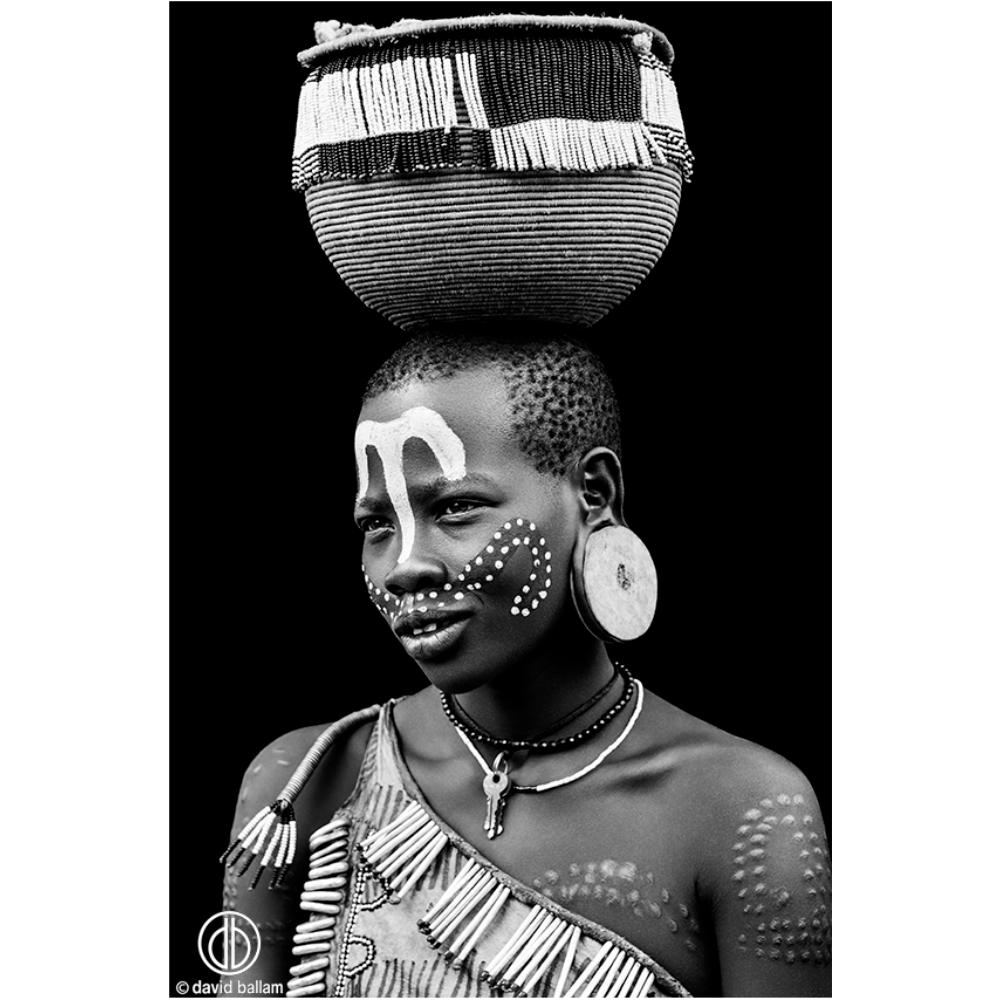 David Ballam is a world-renowned South African photographer. He explores the African landscape and the traditional cultures in each region in Africa. His prints provide a stunning flavor to a space and definitely command attention and thought. This photograph depicts an Ethiopian girl from the Omo valley region balancing a basket on her head with grace and elegance.