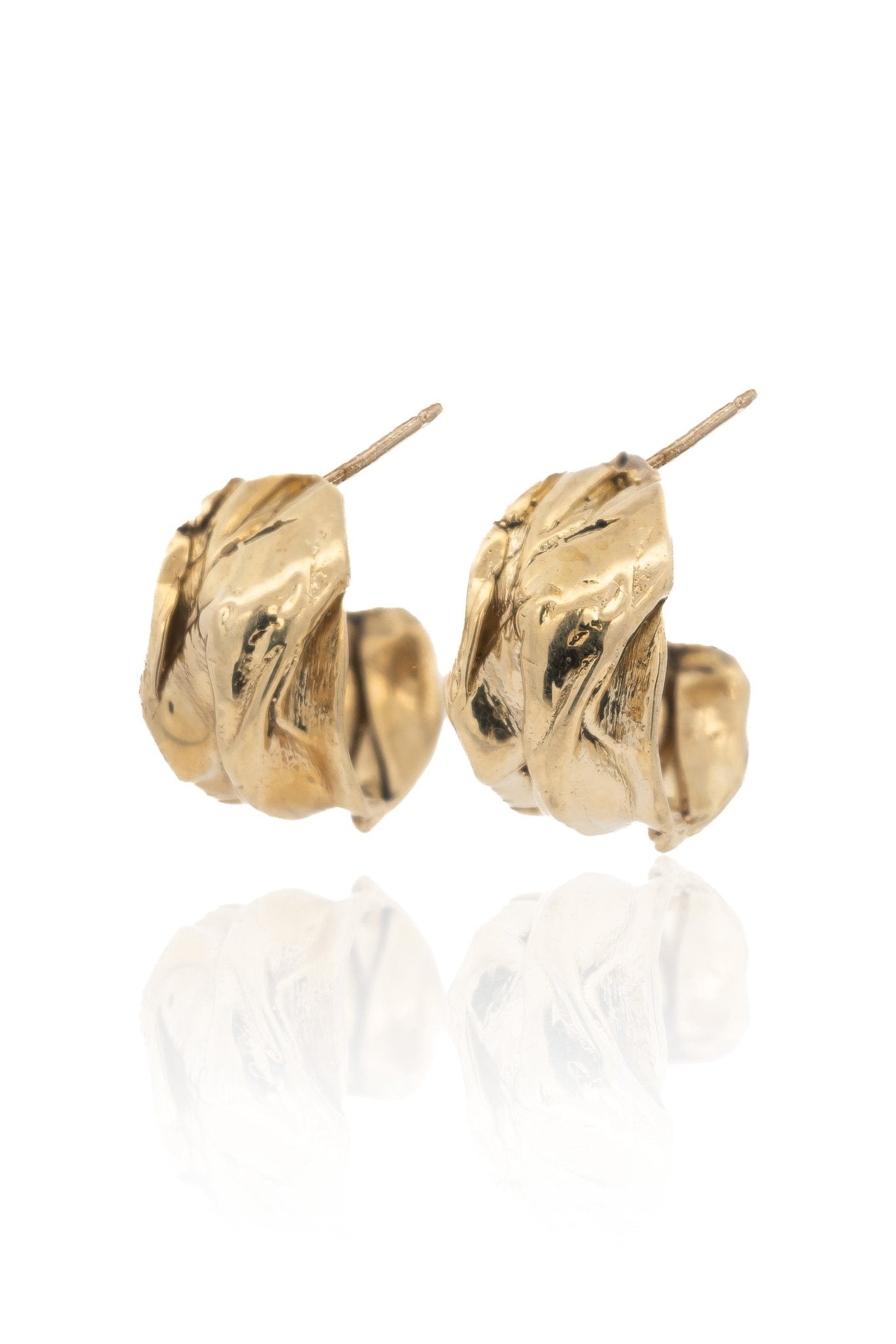 Introducing Eureka Chunky Gold Hoop Earrings, featuring textured and crumpled surface, these gold hoops are crafted from recycled brass through original wax carving.