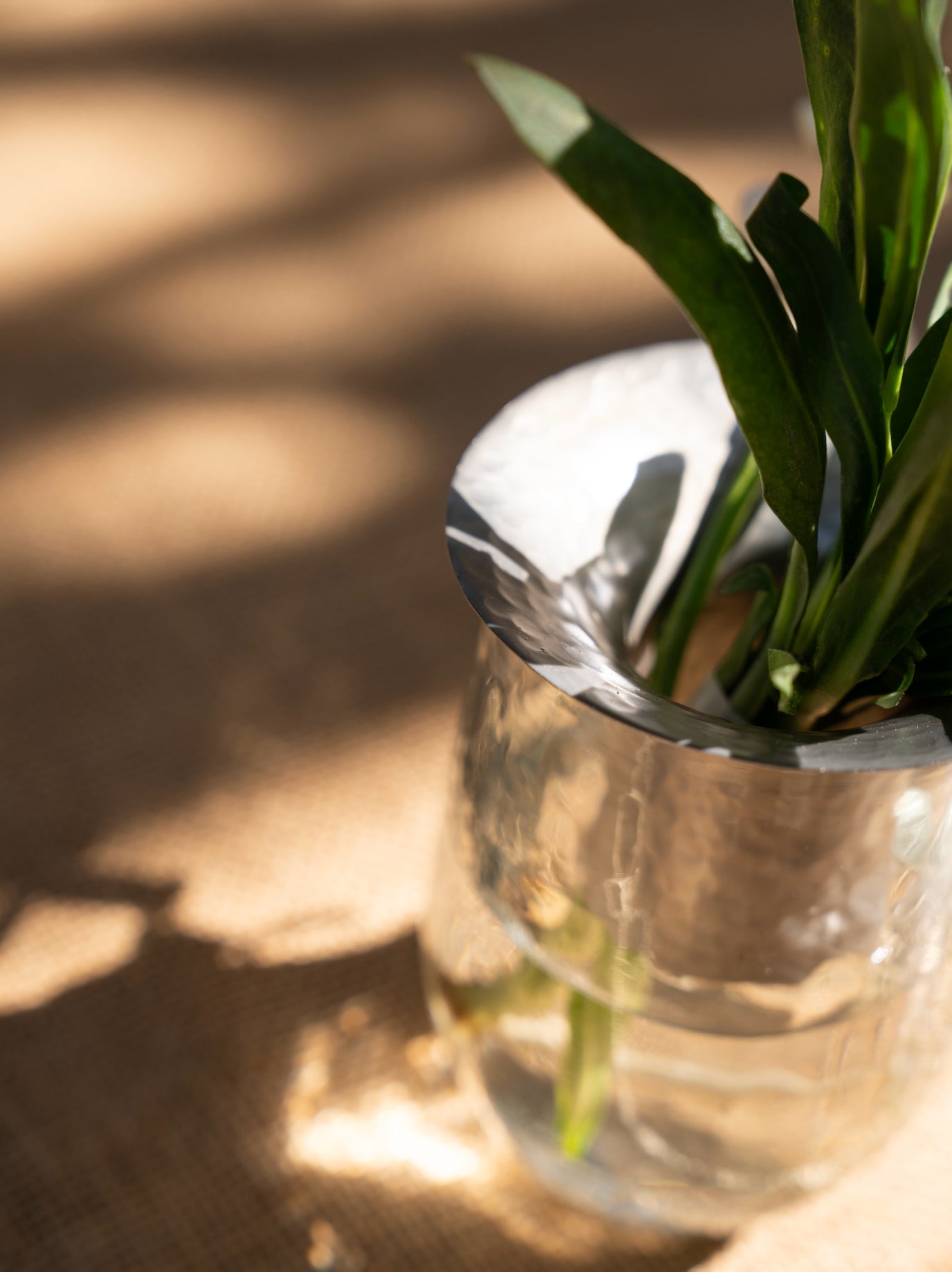 Crafted with high-quality glass and metal, our Floral Bloom Assorted Set adds a touch of elegance to any space. The hammered texture and pewter finish give each piece a unique, artistic flair. With beautiful floral designs, this set is sure to bloom in any room. Set comes with two glasses and two metal tops.