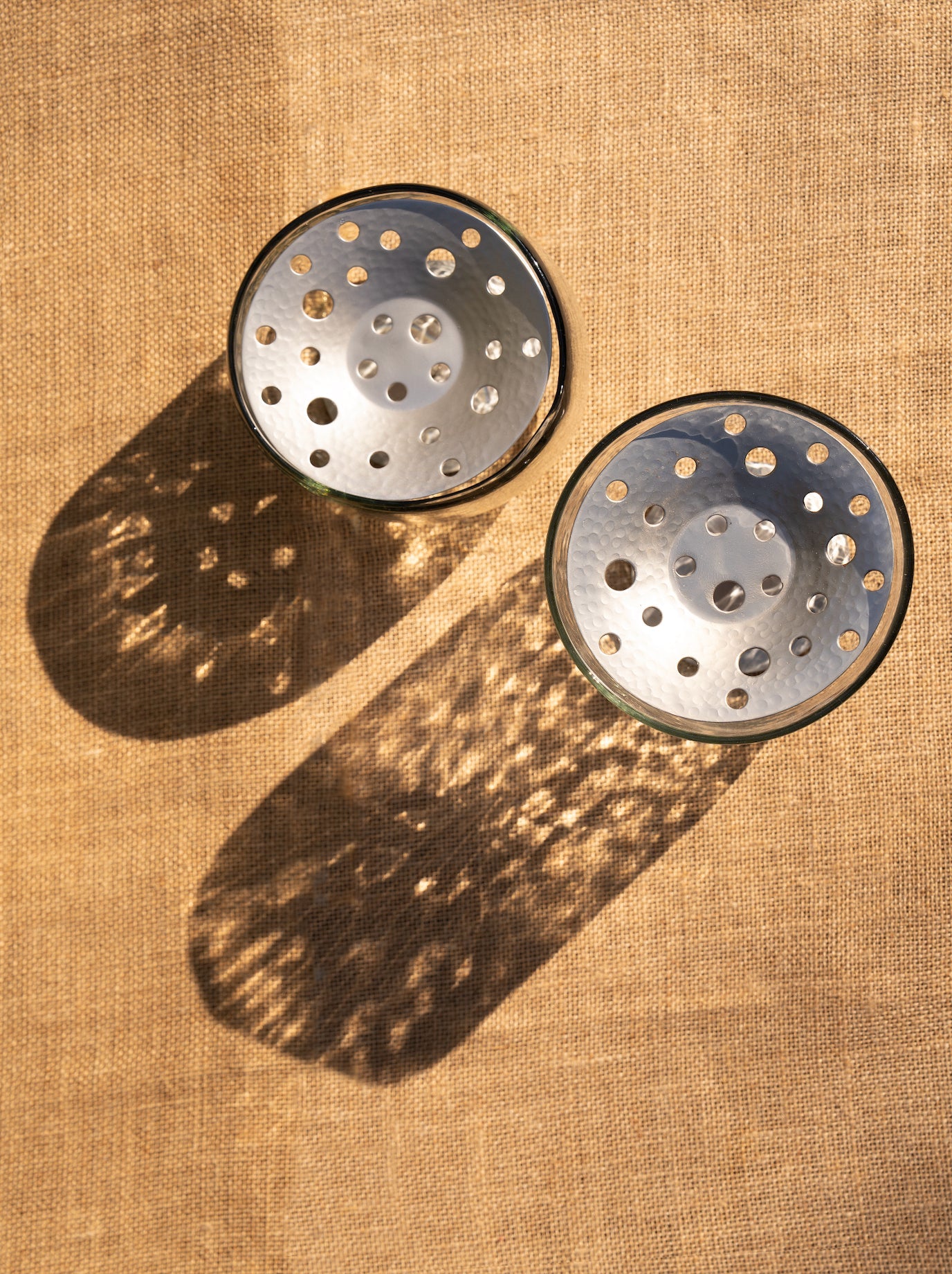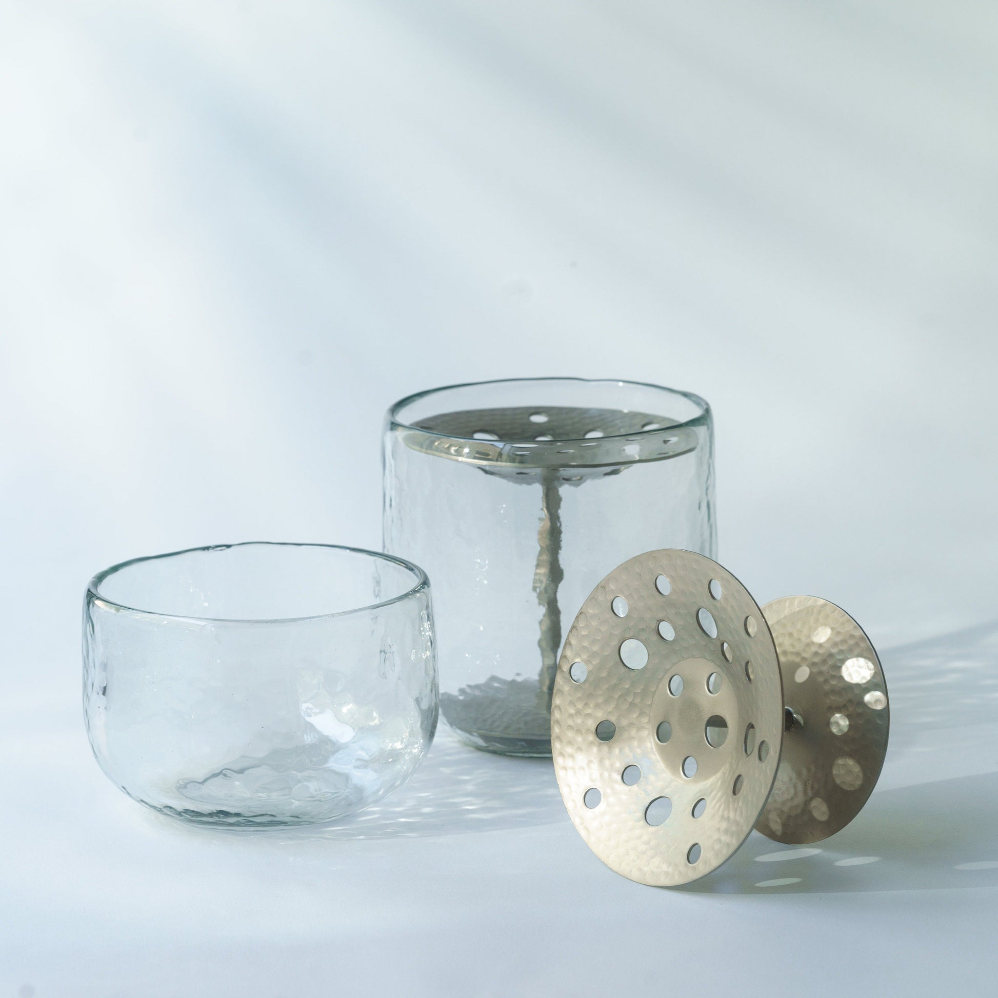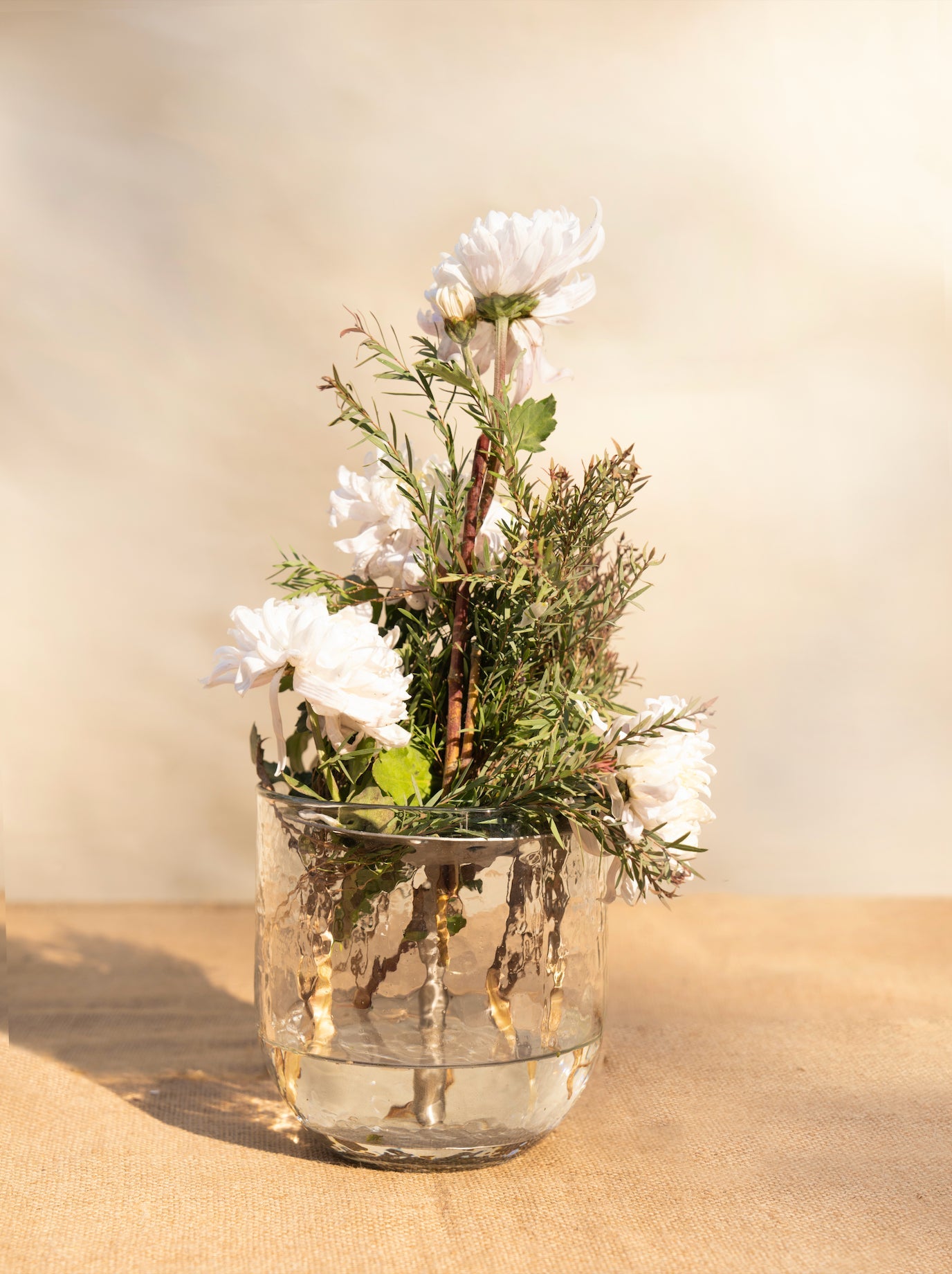 Expertly crafted with a hammered texture and a pewter finish, our Floral Flower Frog is the perfect way to showcase your favorite arrangements. Available in both low and tall sizes, each comes with a glass holder and metal inside for effortless arranging. Elevate your floral displays with this elegant accessory.