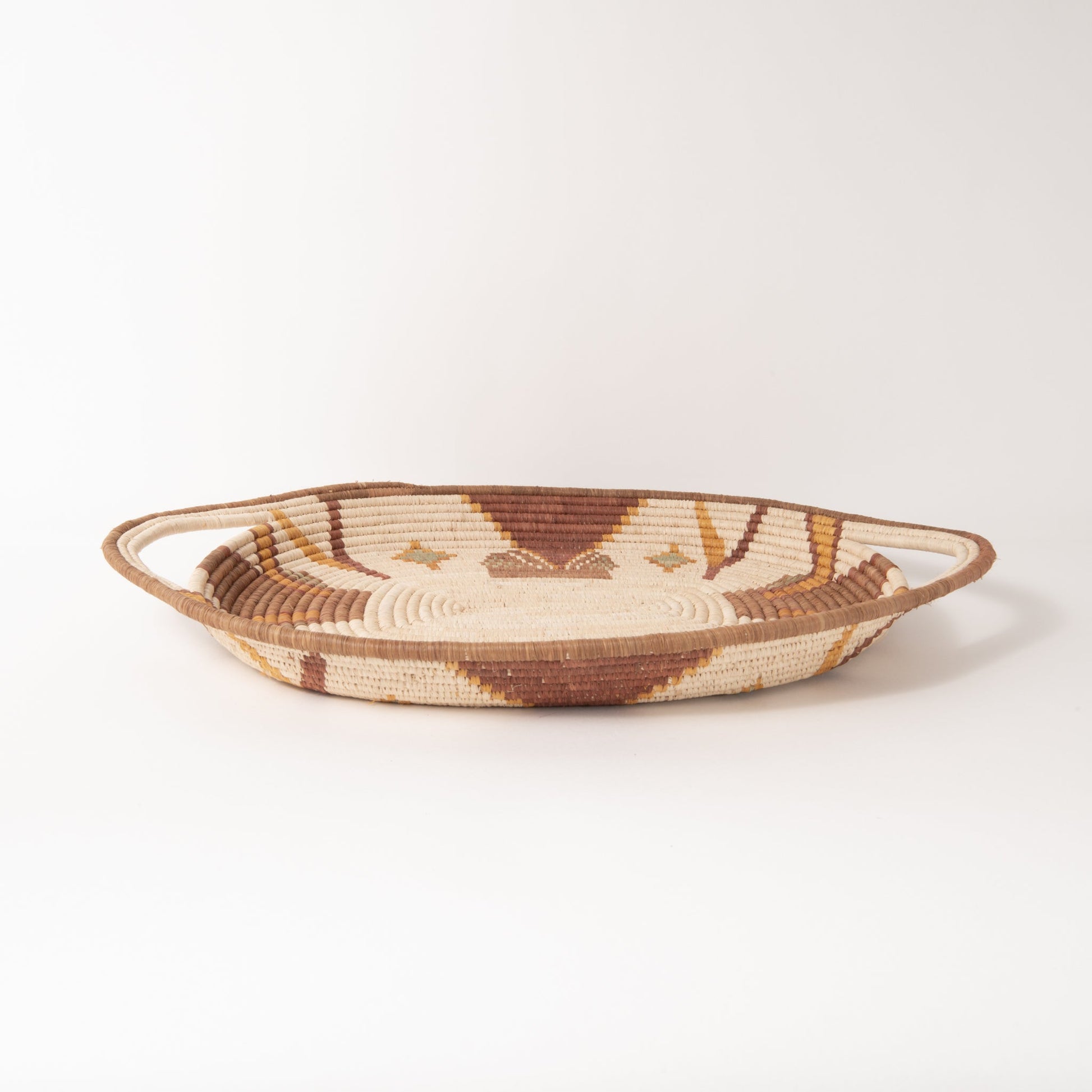 Oval shaped with handles, this handcrafted basket tray will quickly become your most coveted tableware. This lovely and functional tray, in a rich combination of seasonal colors, is part of the Fall 2024 Cultivate Collection.