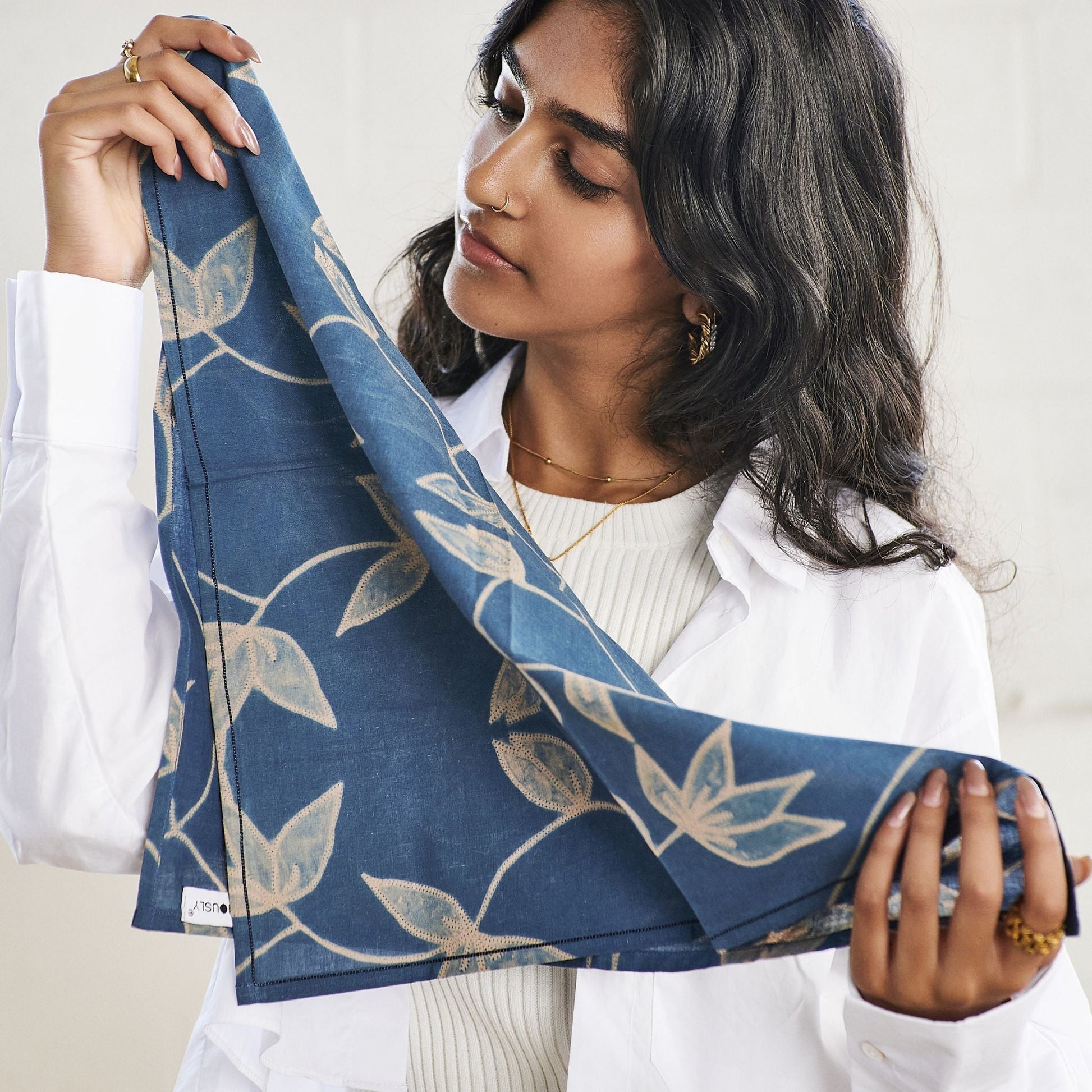Folio Indigo table napkin is a unique modern artisanal napkin. Created artistically and ethically by artisans in India using shibori print technique, using only pure natural dyes. It is a pure statement piece that adds modern and timeless quality as a table ware accessory. Classic & timeless in design,Folio napkin in indigo is a sustainable luxury statement. Created all by hand these napkins are made in small careful batches, each piece being unique as it is completely handcrafted.Natural elements local to the artisan clusters are used to custom create dyes for this production. Each order includes a set of 4 napkins. Material: 60s cotton ( thick ) Size: 18X18" (square) Color: Shibori floral print in indigo. Artisan base: Ethically & responsibly handmade by artisans in India Wash care: Gently hand wash separately. Hang dry in cool shaded place. What Makes Your Purchase Sustainable? 100% organic dyes sourced locally and made to order. Support employment of women artisans. 100% handmade manufacturing process by artisans. All pieces are sun dried / air dried to conserve energy. Use only 100% natural + biodegradable responsibly sourced materials. Small batch production ensures higher quality & less wastage. Note : Folio Indigo Napkin sets are currently in production and will be stocked in September 2025 onwards for deliveries. Customer orders received before will secure and reserve their orders. Variously team will be in touch directly for their pre orders.
