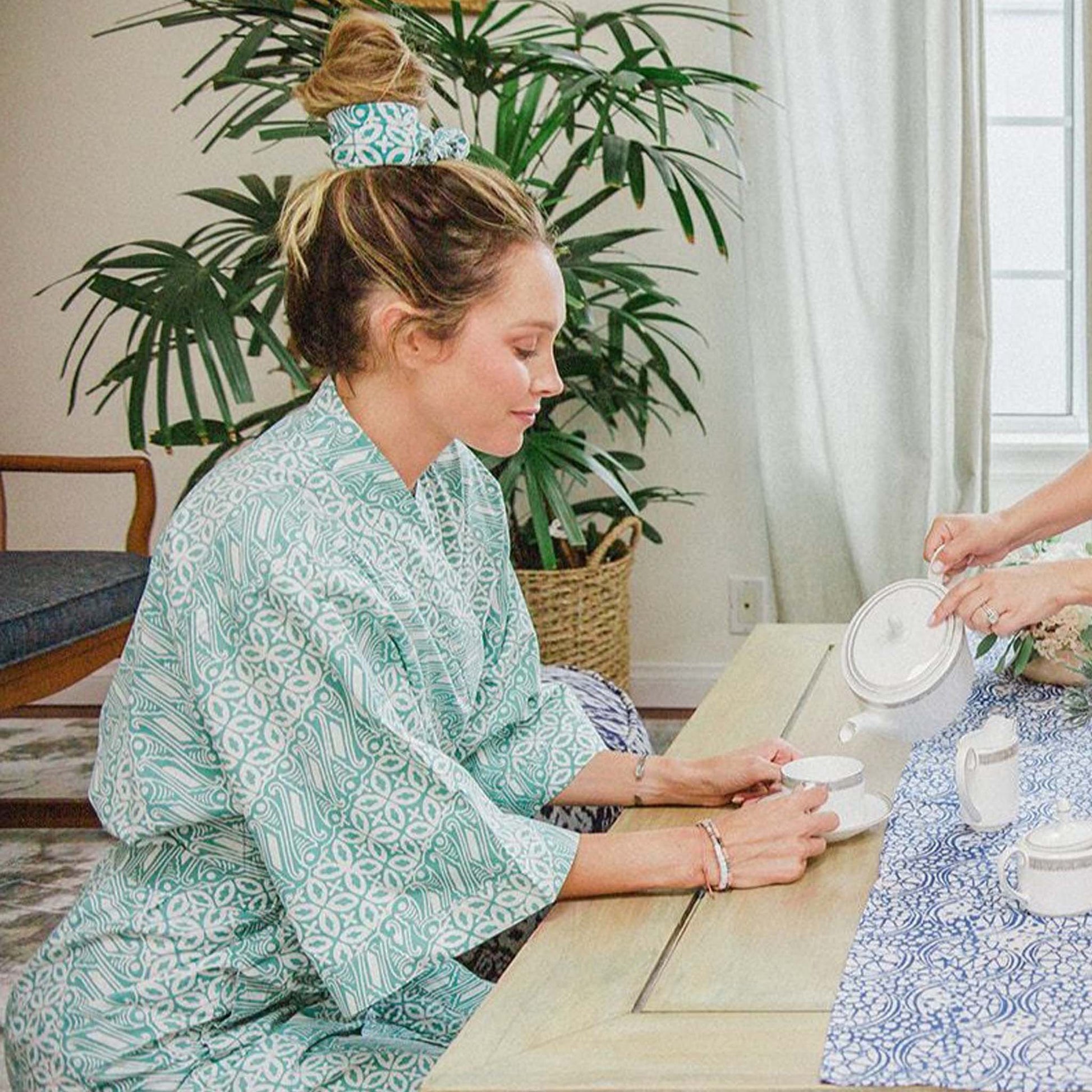 This is a FINAL SALE with NO RETURN, EXCHANGE or REFUND. This batik kimono robe is made from white cotton fabric that is then hand-stamped and hand-dyed using 700 years old batik wax and dye technique. The batik fabric is also then sun baked. This batik kimono robe is designed in Manhattan Beach, CA and handmade by artisans in Java, Indonesia. Please expect some variation of the color due to the hand-dyeing and the sun drying process. This pattern is called Parang Kawung, which has the Machete and Flower petals. This batik pattern is traditionally only reserved for Indonesian royalties to wear. Size: One Size. Up to 48" at chest and hips and 41" in length Made with 100% cotton fabric typically used for hand-drawn batik method Two side pockets Removable waist tie closure Belt loops and inside ties to secure closure Side slits at hem Machine washable in cold and air dry. Wash batik separate from other garments. Get a matching bandana in Royalty