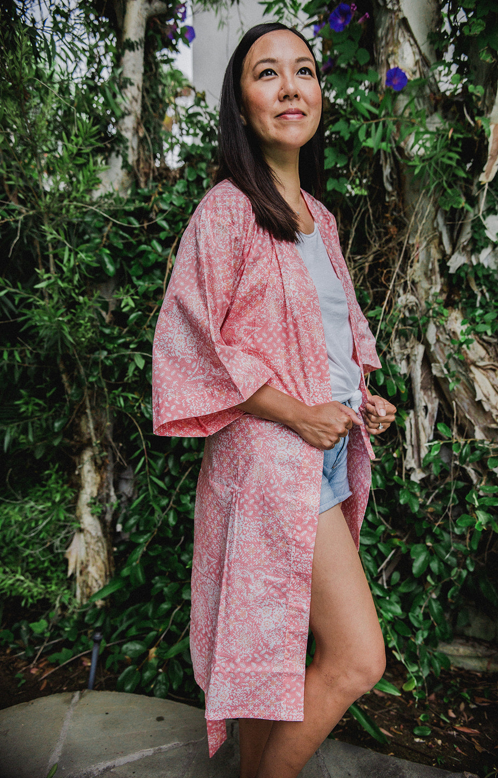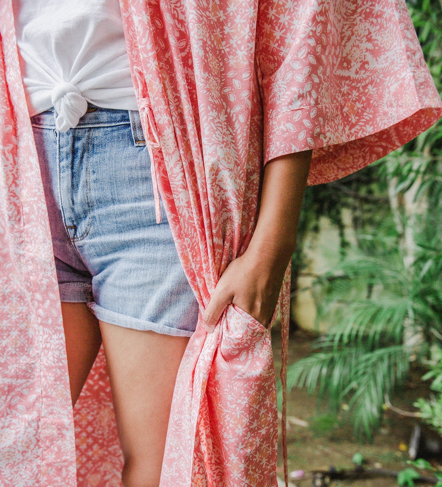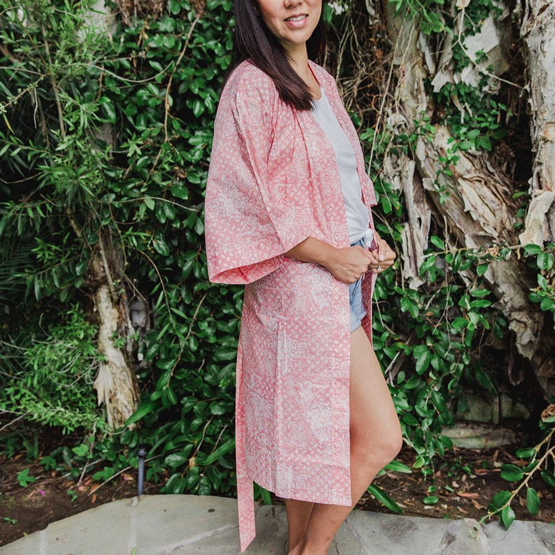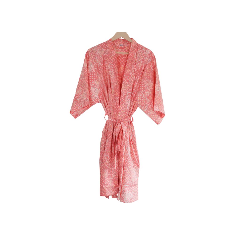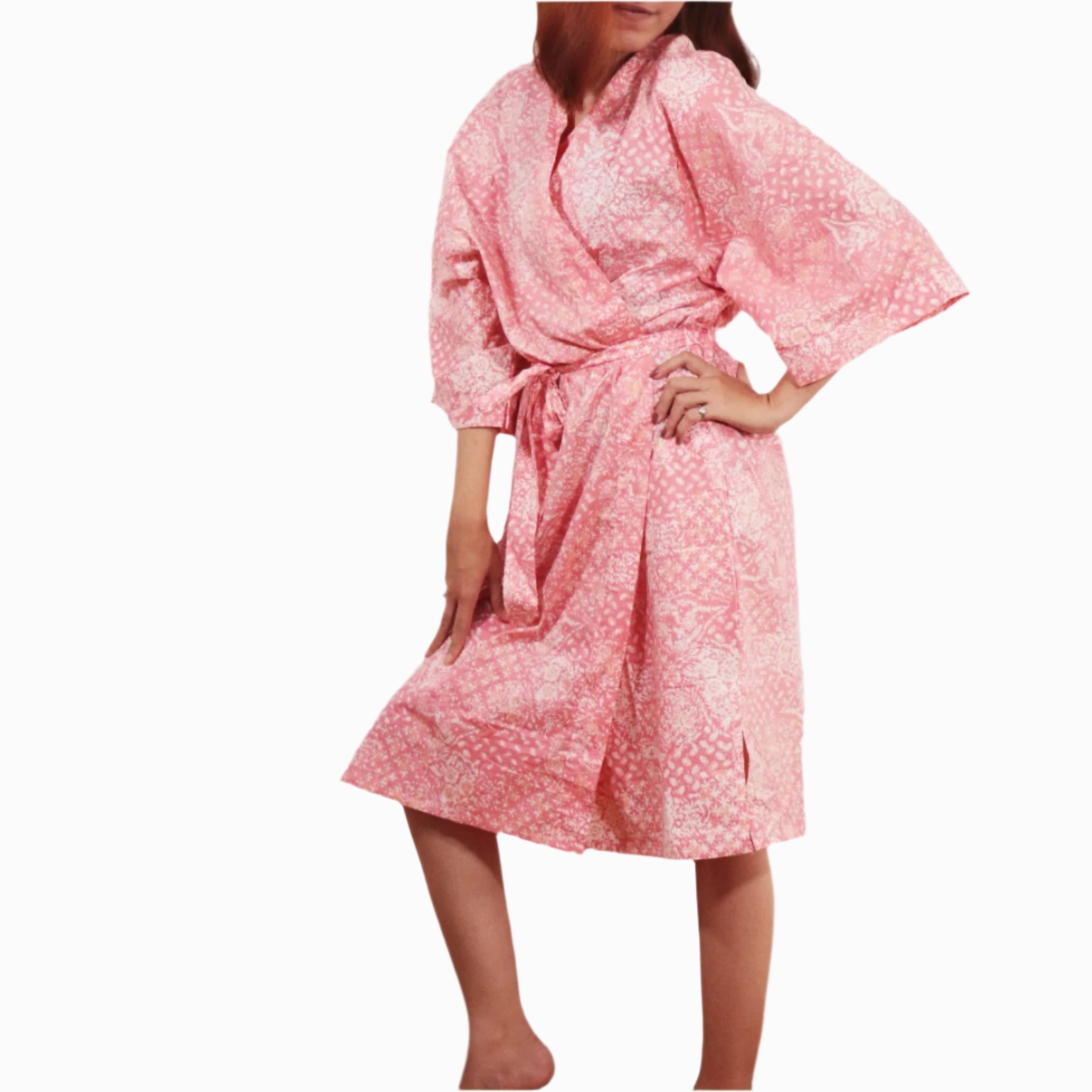 Hand Dyed Batik Robe Kimono, 100% Cotton Pink Wildflower