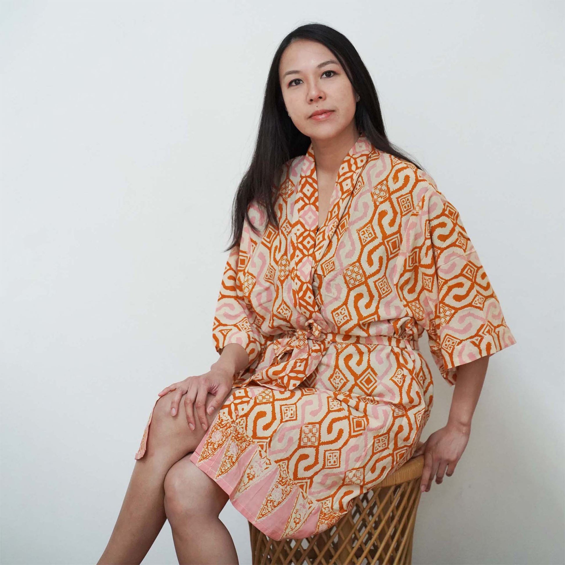 Hand Dyed Batik Robe Kimono, 100% Cotton Soft, Orange Pink Sunset Mosaic, Clementine