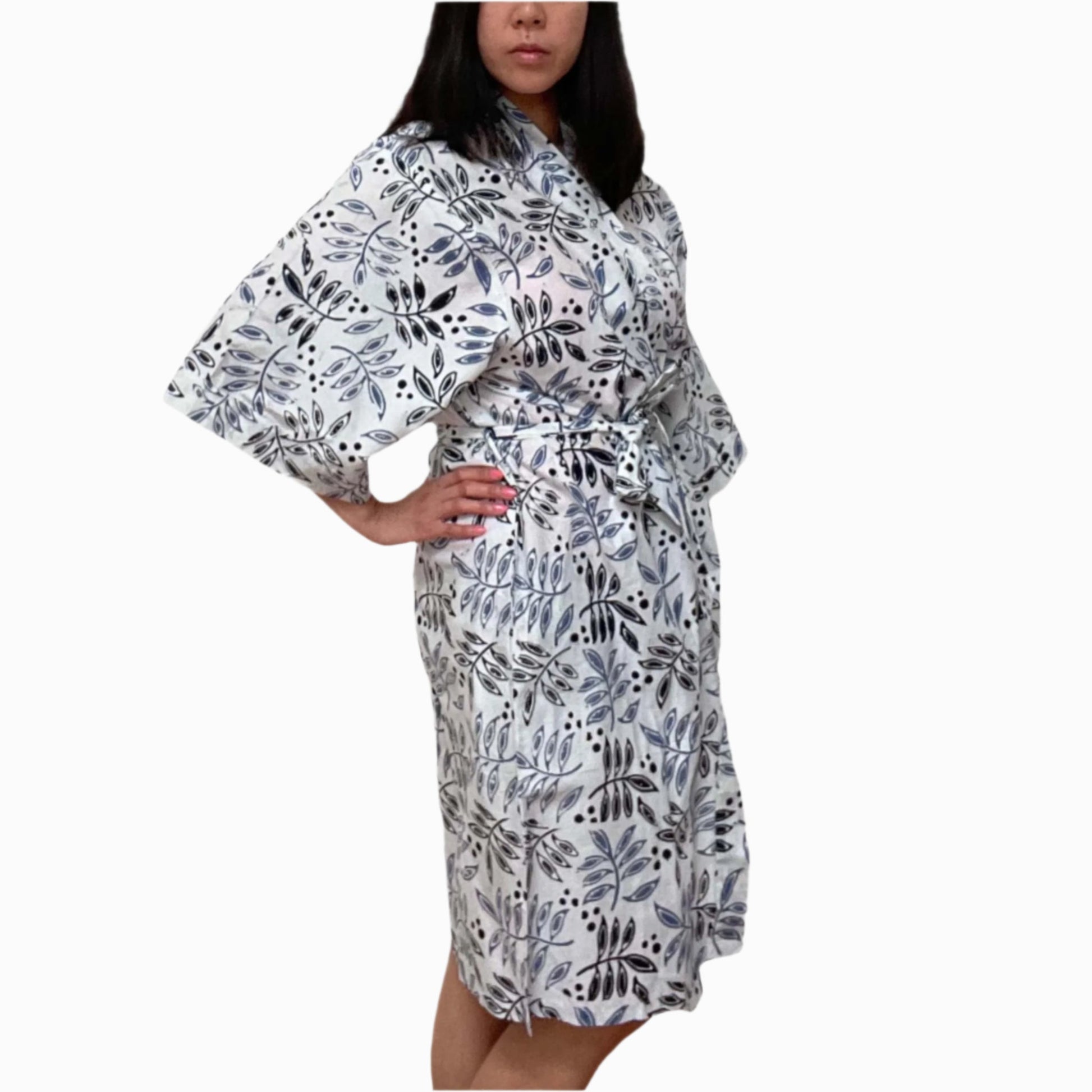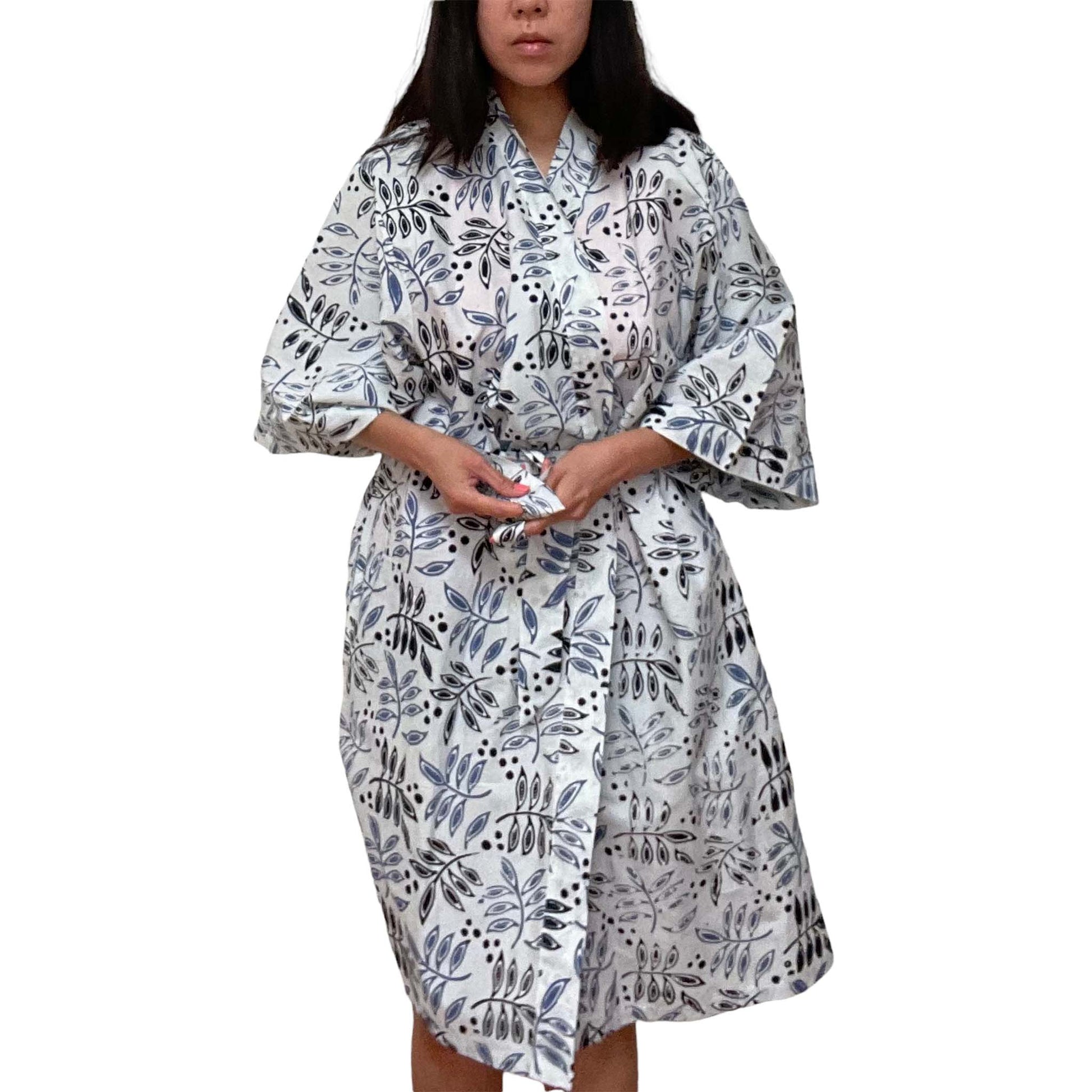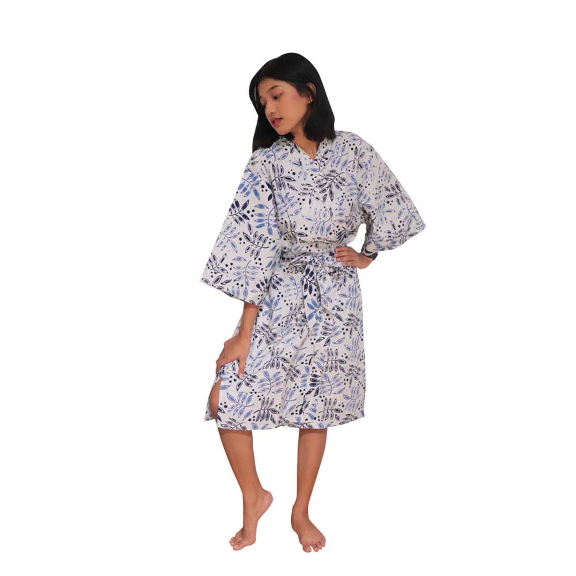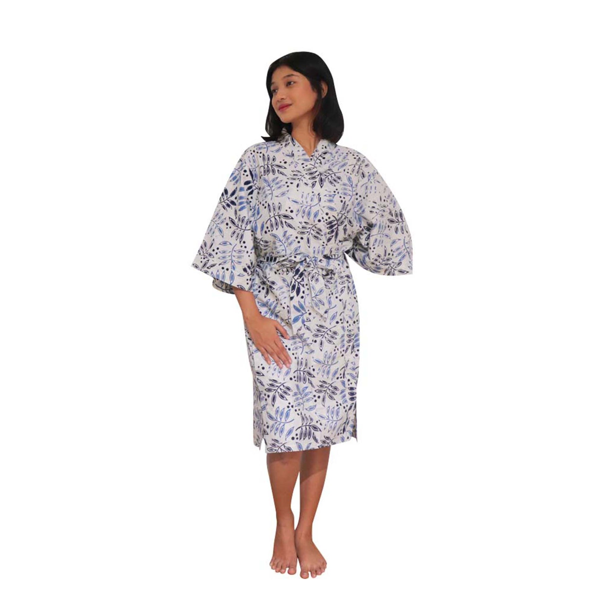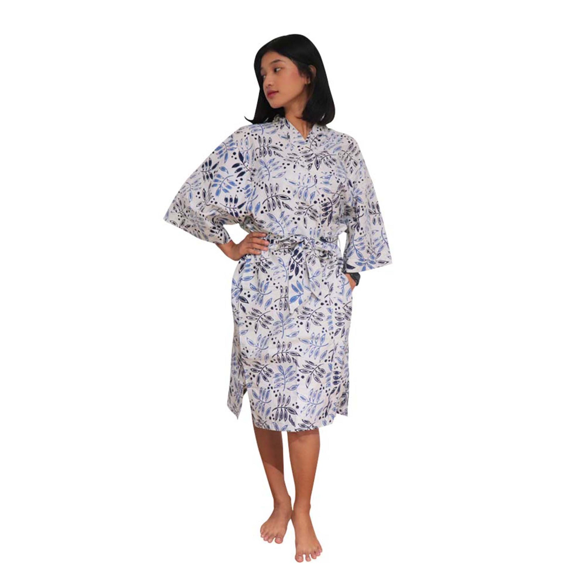 Hand Dyed Batik Robe Kimono, 100% Cotton, White Blue, Floral, Leaf Tamarind