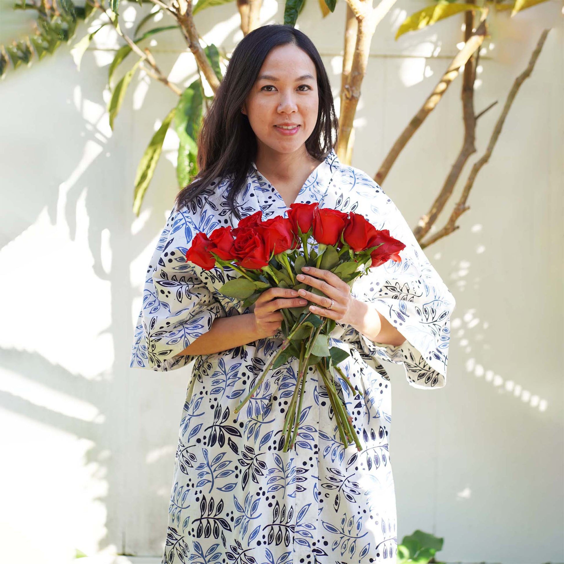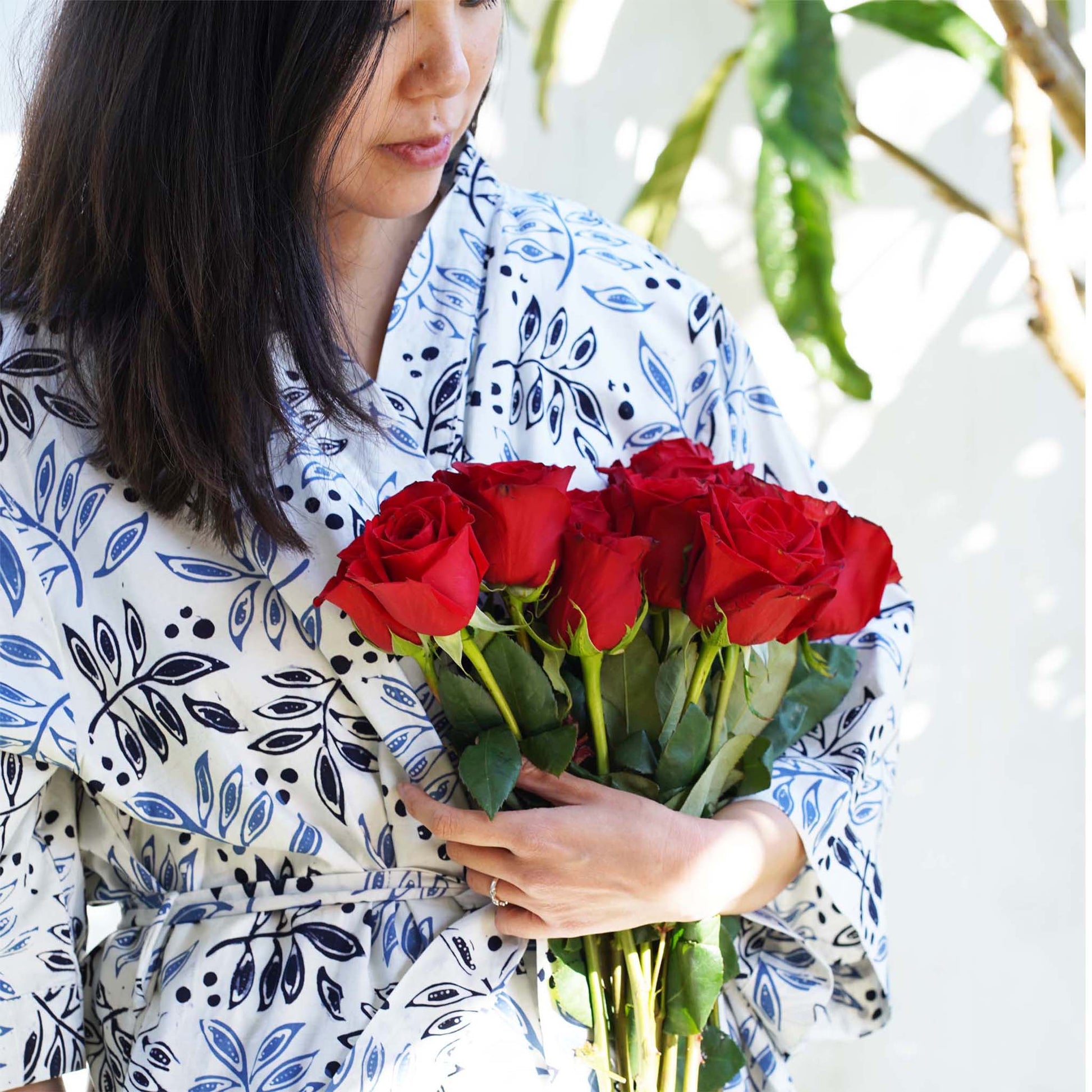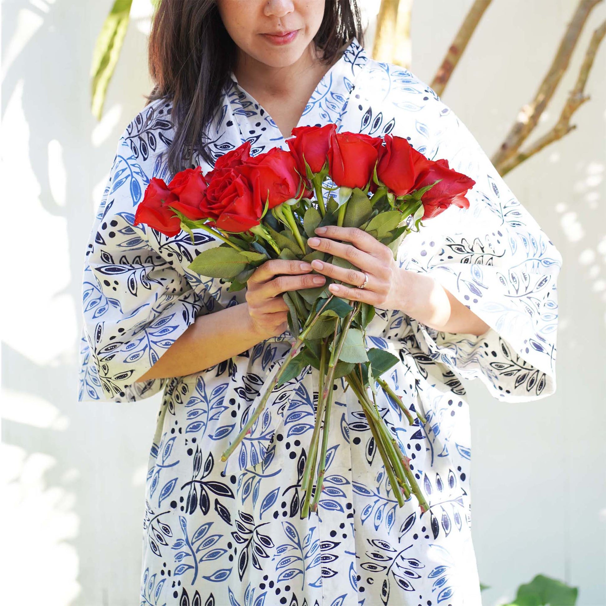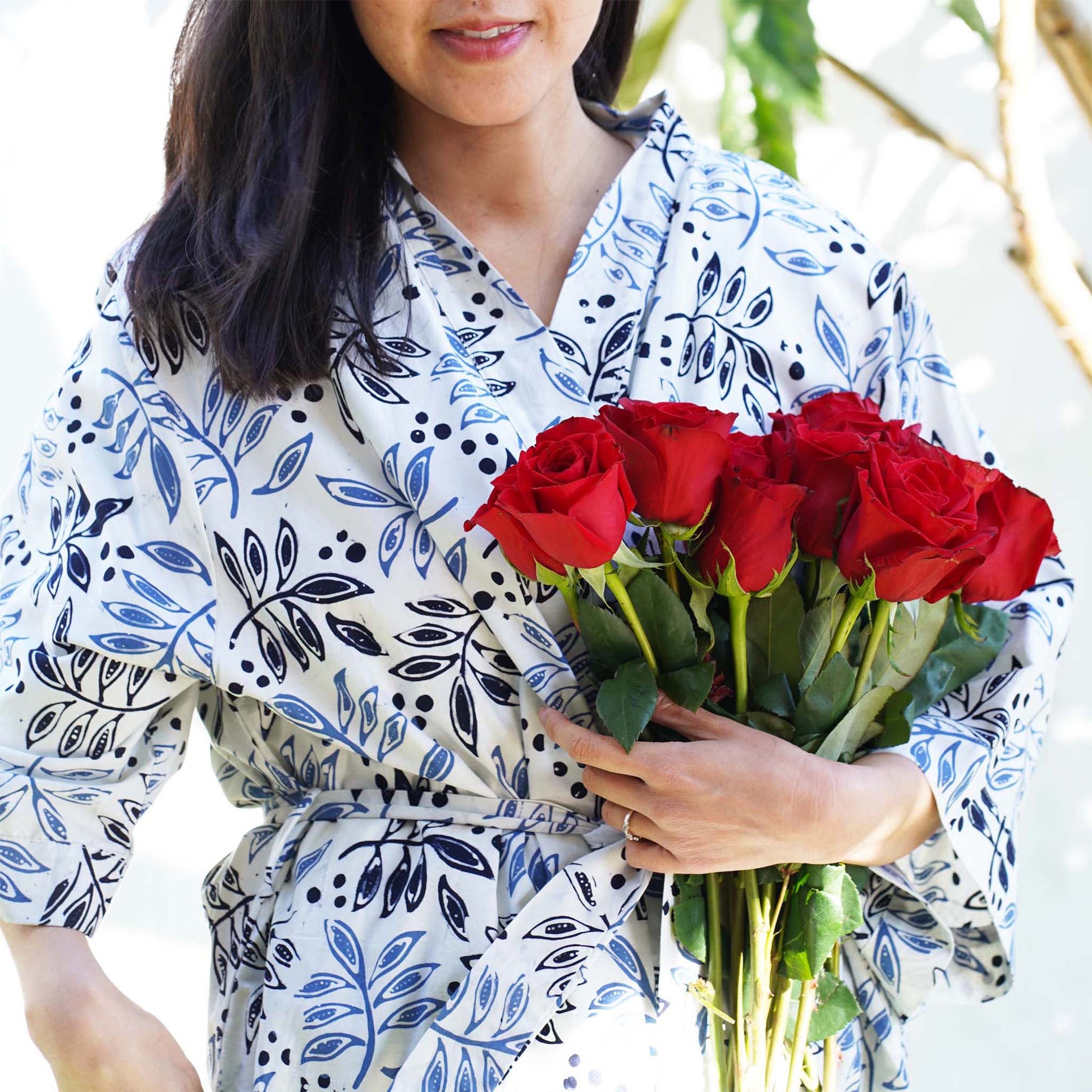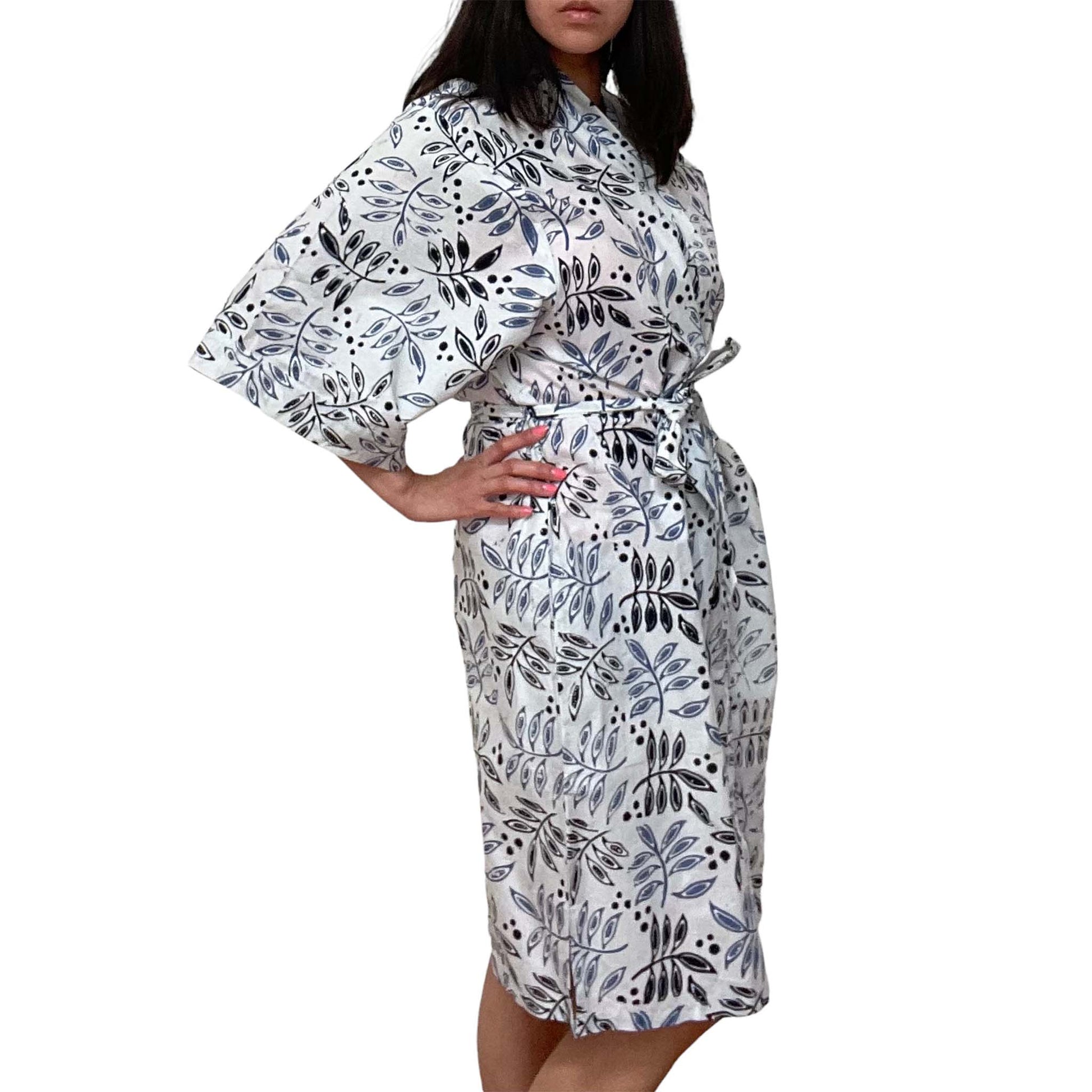 Hand Dyed Batik Robe Kimono, 100% Cotton, White Blue, Floral, Leaf Tamarind