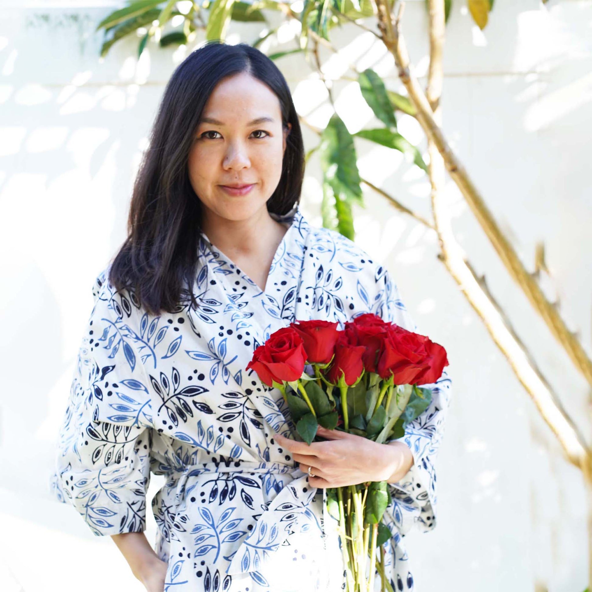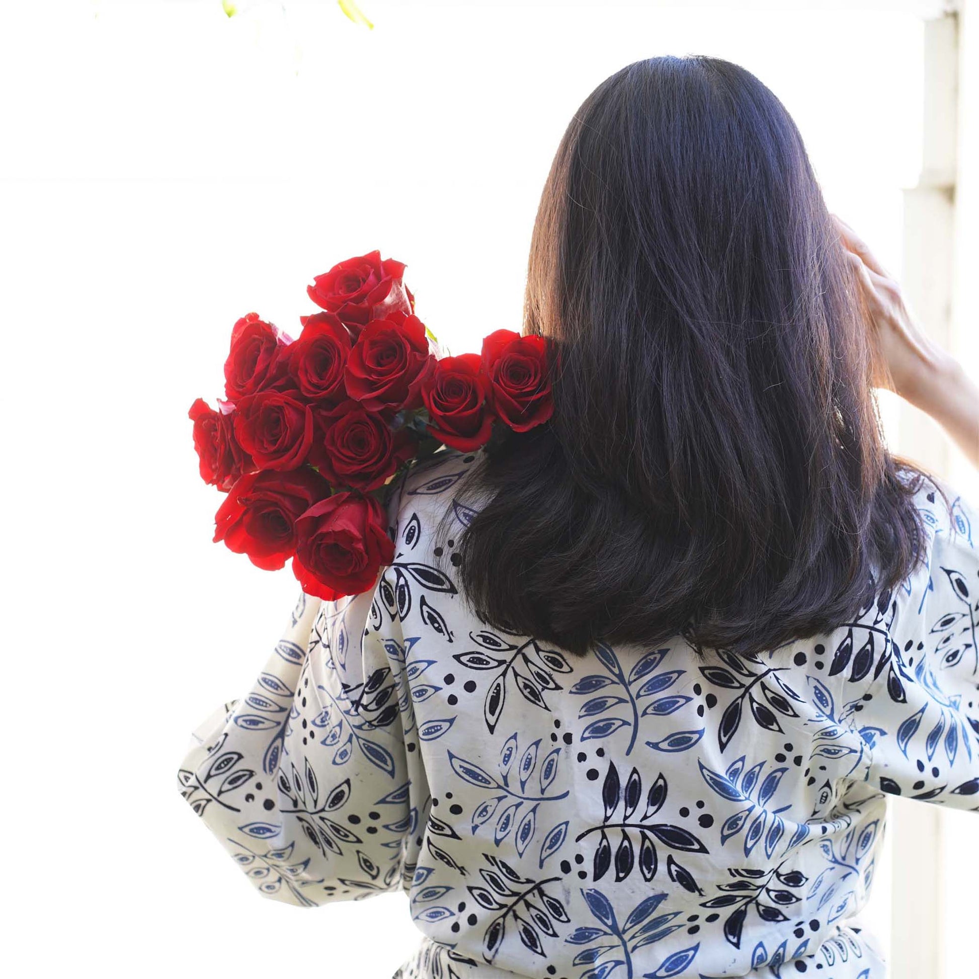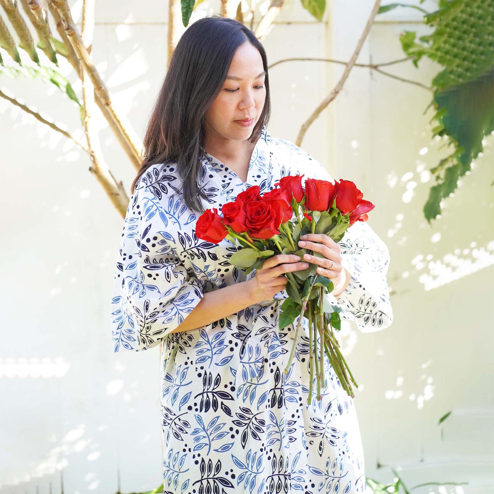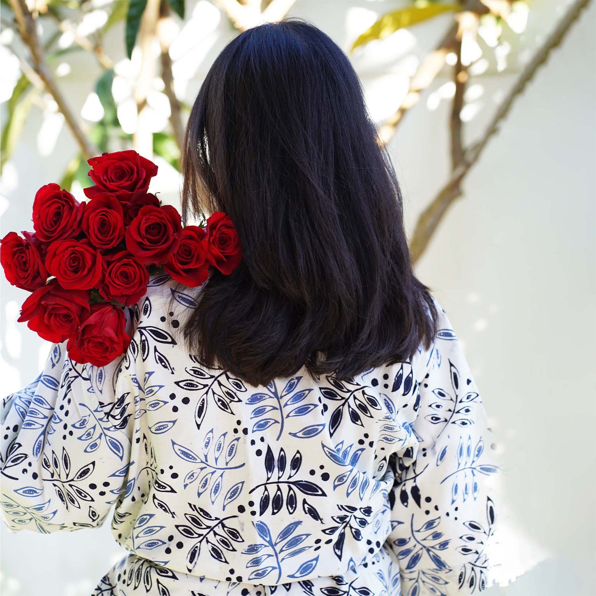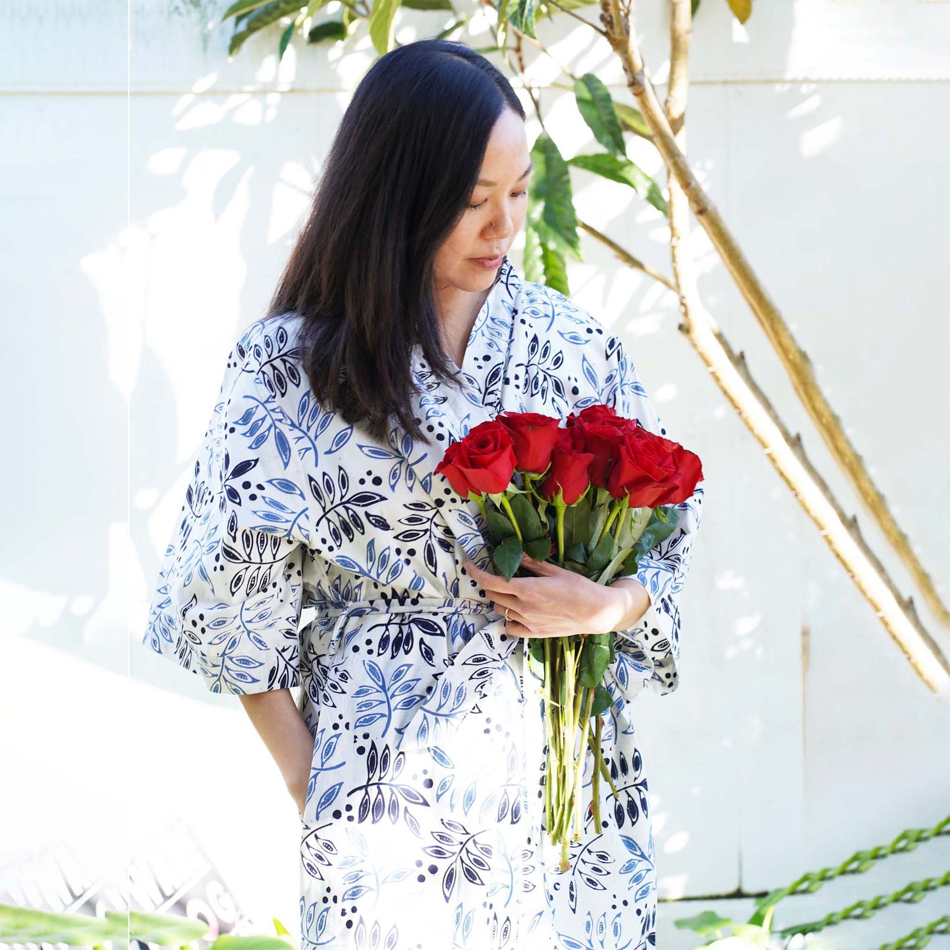 This batik kimono robe is made from white cotton fabric that is then hand-stamped and hand-dyed using 700 years old batik wax and dye technique. The batik fabric is also then sun baked. This batik kimono robe is designed in Manhattan Beach, CA and handmade by artisans in Java, Indonesia. Please expect some variation of the color due to the hand-dyeing and the sun drying process. This pattern is called Dong Asem, which has means tamarind leaf. Size: One Size. Up to 48" at chest and hips and 41" in length. Made with 100% cotton fabric typically used for hand-drawn batik method. Two side pockets Removable waist tie closure Belt loops and inside ties to secure closure Side slits at hem Machine washable in cold and air dry. Wash batik separate from other garments.