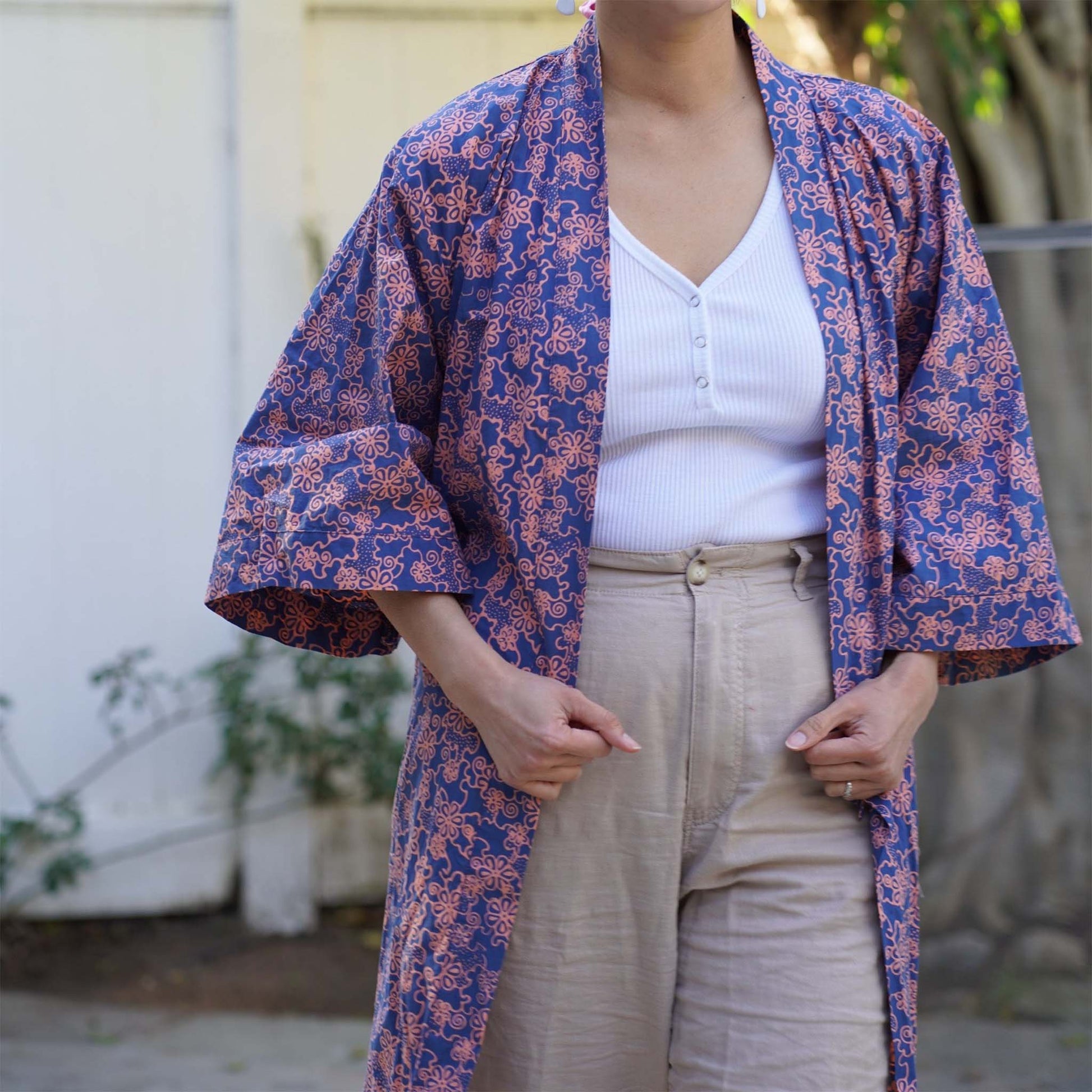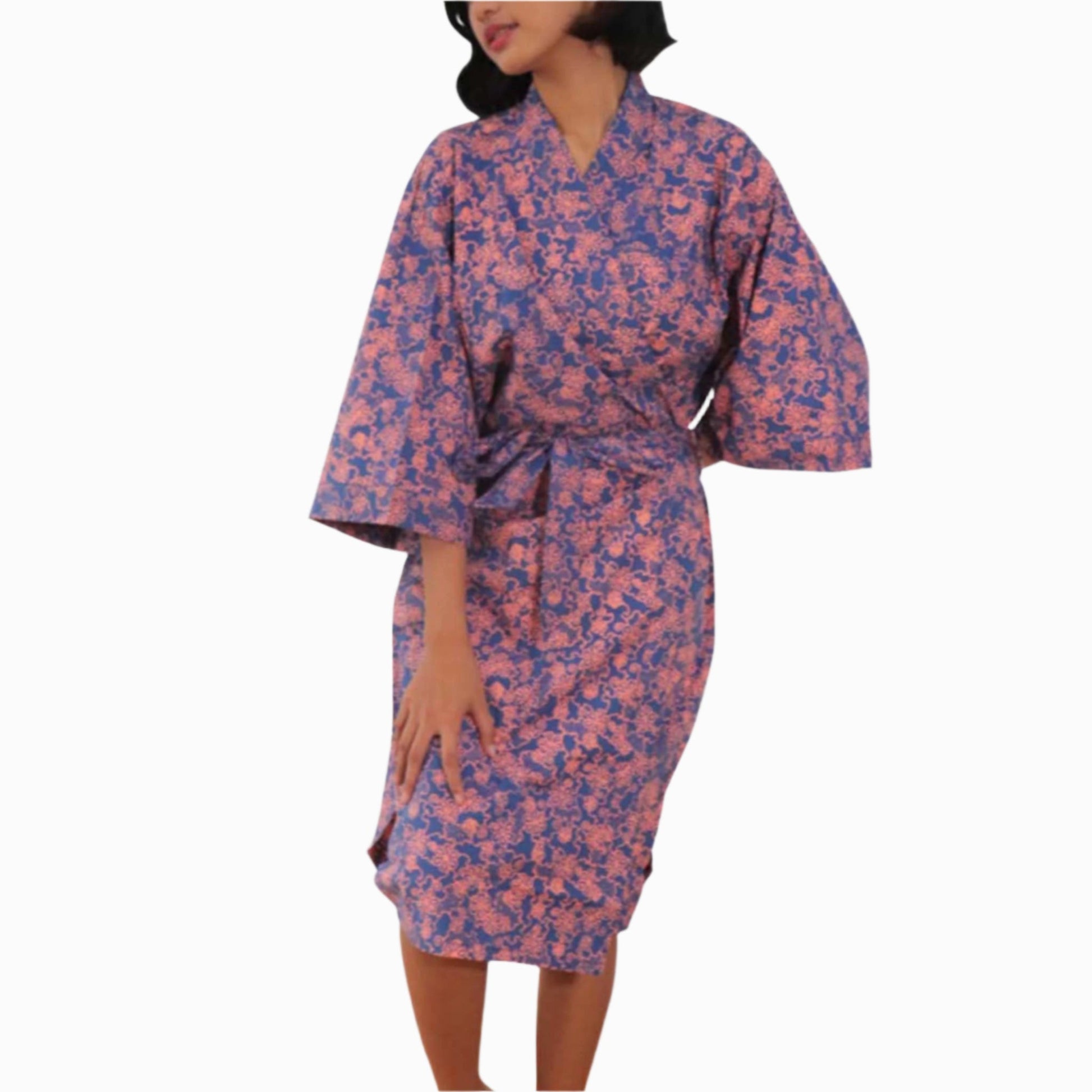 Handmade Batik Robe Kimono, Pink Blue Mangosteen, Lightweight Cotton Ladies