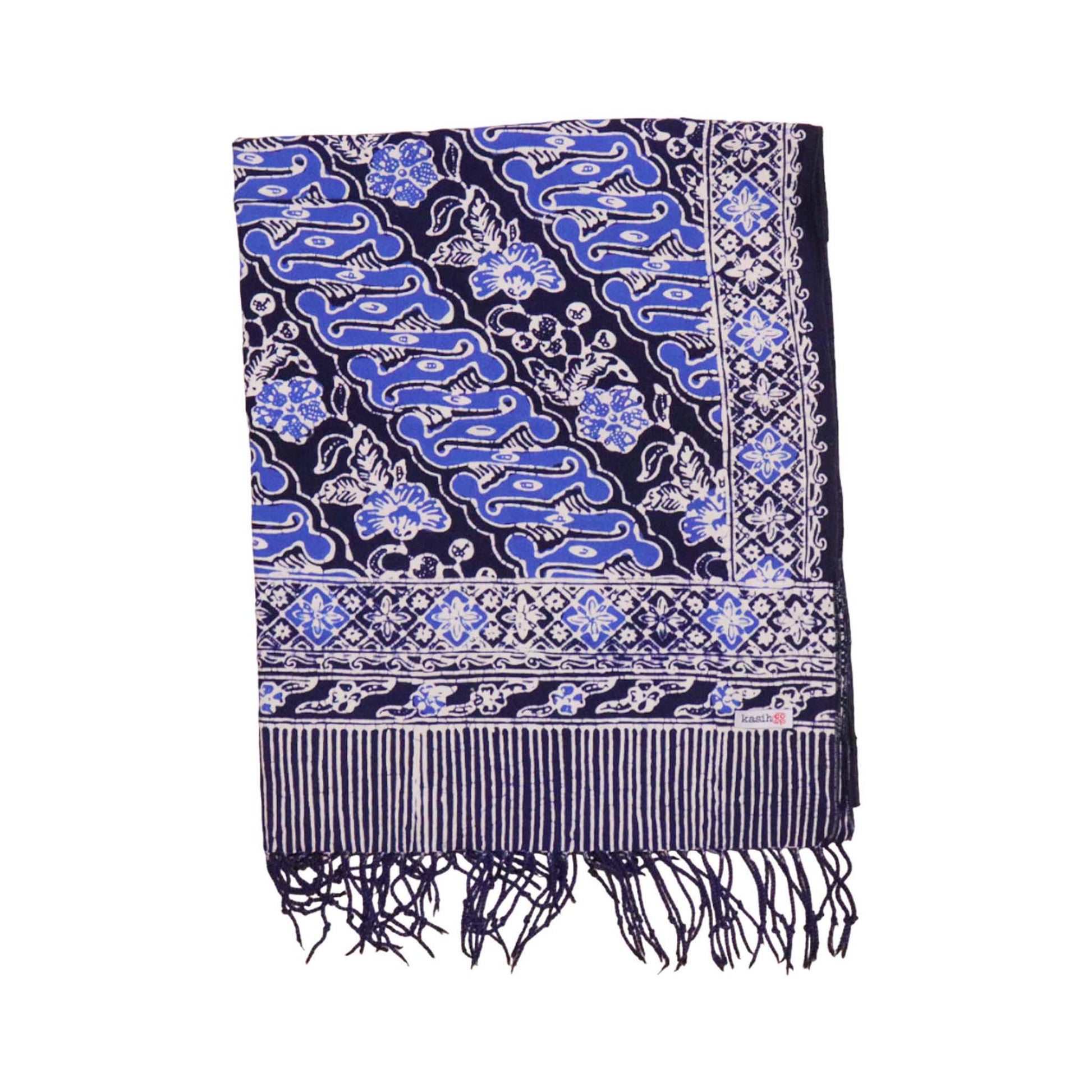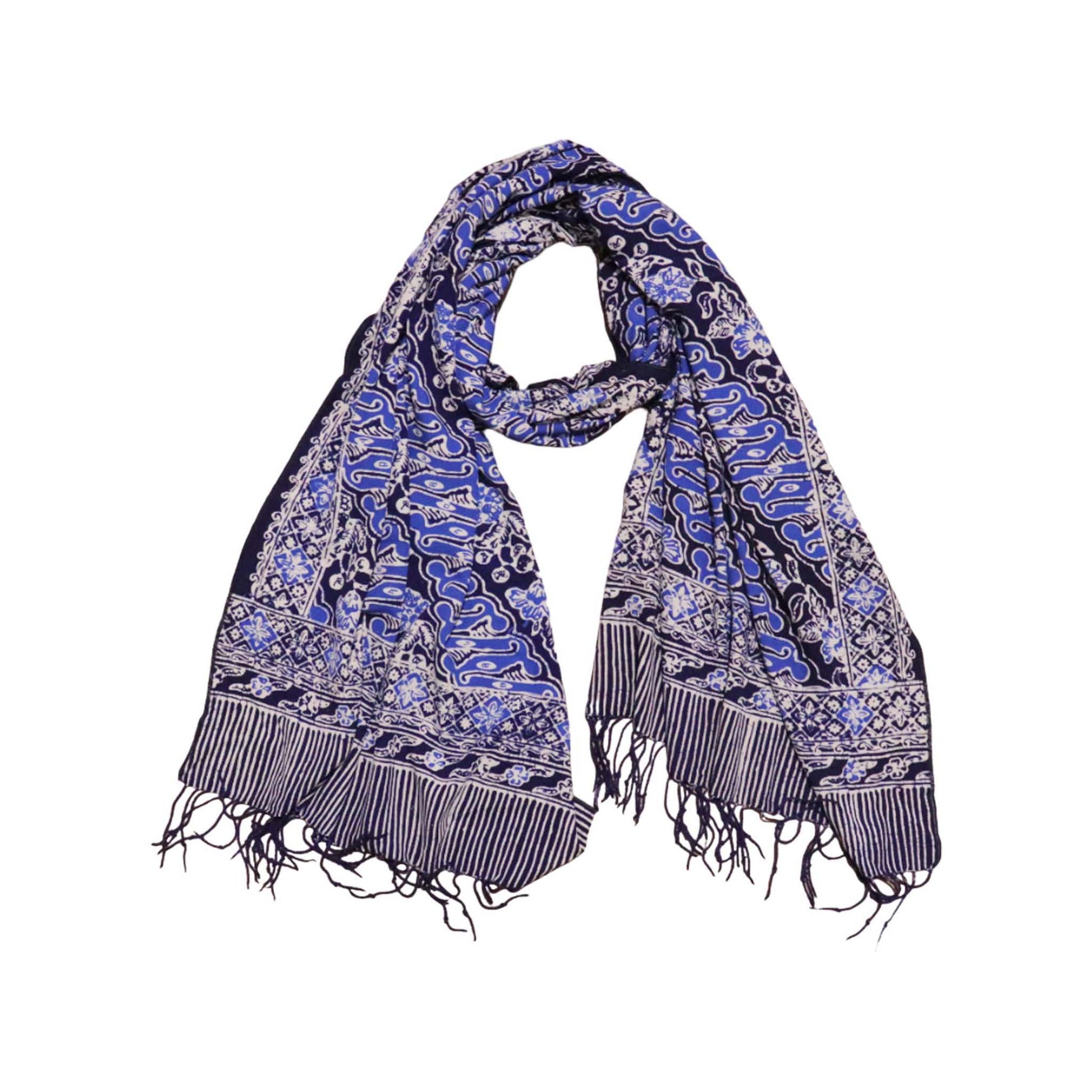 This is a hand-dyed and hand-stamped batik scarf, handmade by artisans. This fabric is handmade by artisans in Java using centuries old wax & dye batik technique. This fabric is made from the lightweight bandana fabric. This scarf is made from white cotton fabric that is then hand-stamped and hand-dyed using 700 years old batik wax and dye technique. The batik fabric is also then sun baked. You should expect some variation of the color. This pattern is called Midnight Autumn Size: 71"x21" Made with 100% cotton fabric Machine washable in cold and air dry. Wash batik separate from other garments. See our video of batik making process from white cotton fabric to the final product below