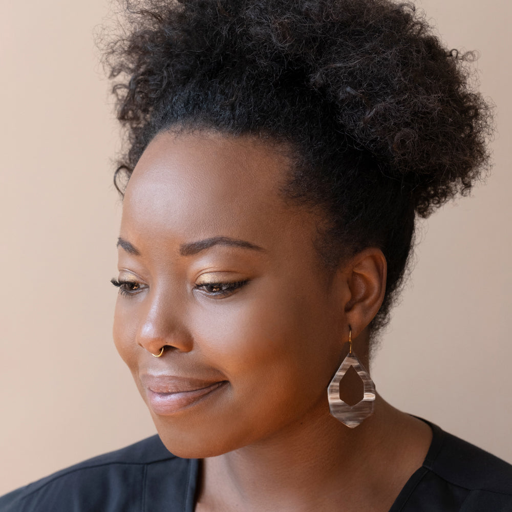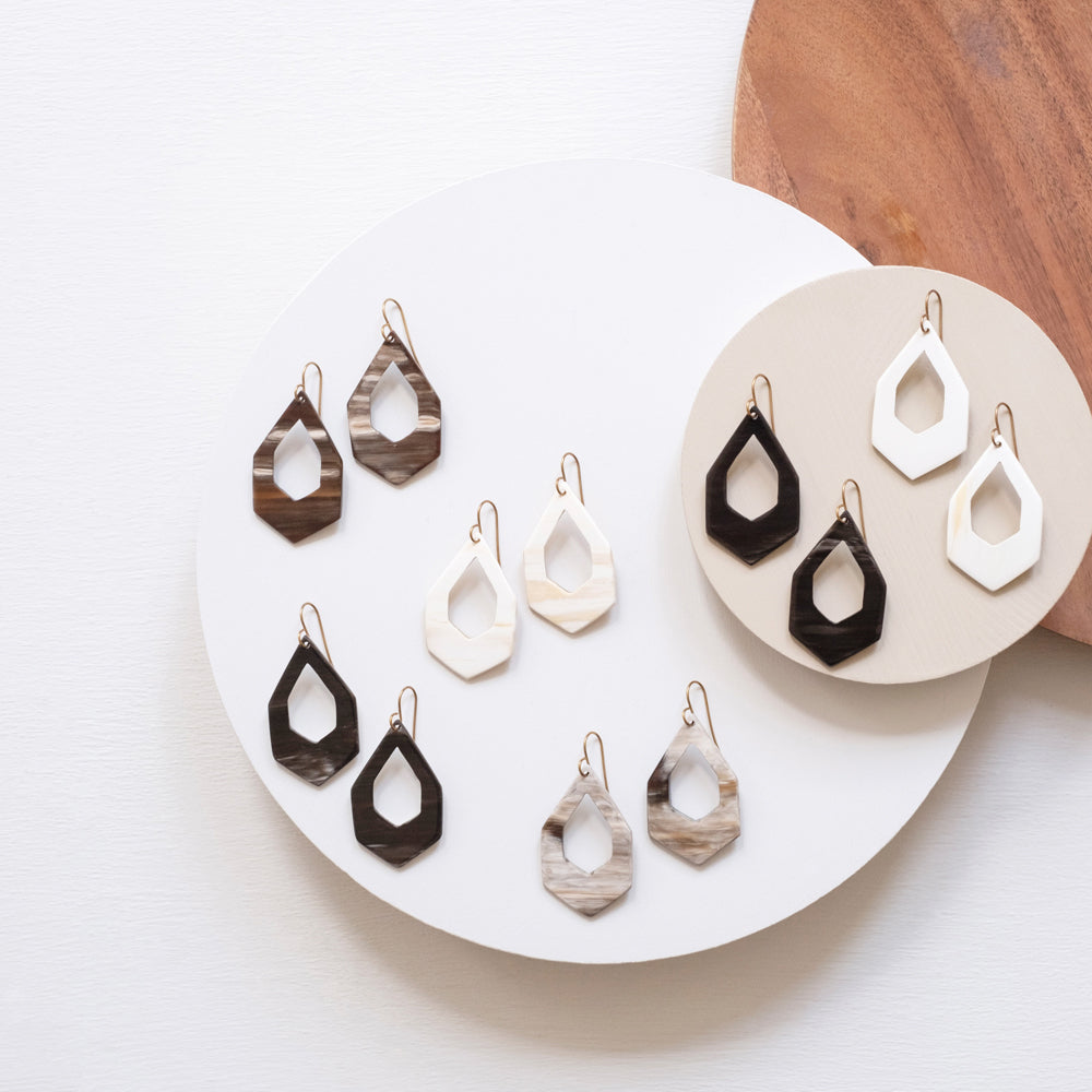 Beautiful hand carved and polished cow horn earrings in a simple but elegant long hexagon art deco design. Sustainably sourced horn from rural Ugandan cattle keepers, horn is used and upcycled instead of wasted.