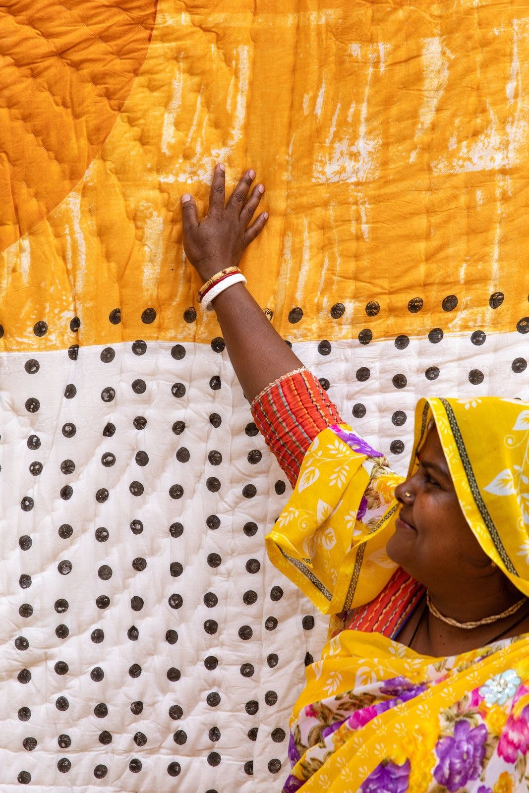 The design is hand-pressed onto each quilt using hand-carved wooden blocks dipped in dyes. The printed cotton shells are brought to the homes of quiltmakers, who stuff and stitch the quilts by hand, creating the final product.