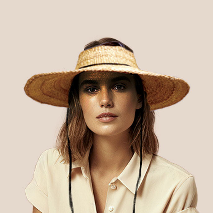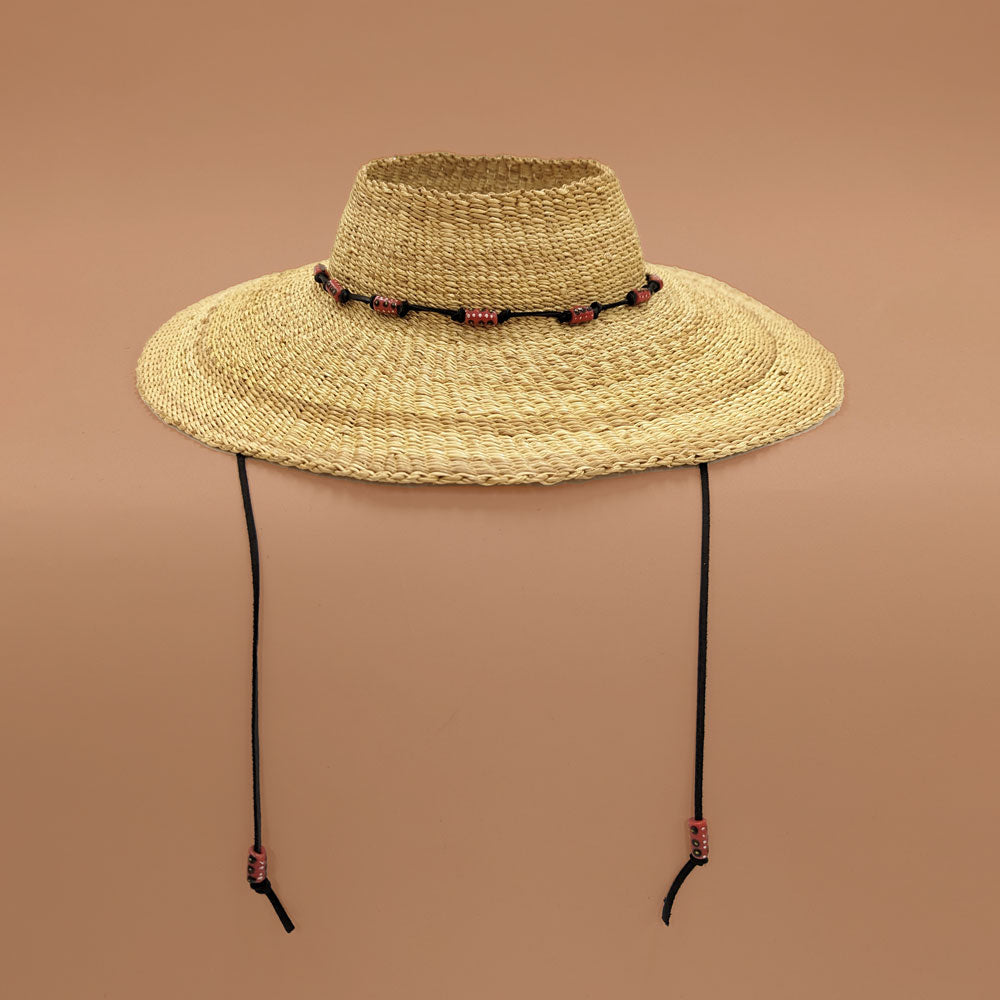 Handcrafted in Ghana from elephant grass and fashioned with thin leather straps for added secureness, this wide brim visor only gets better with each adventure.