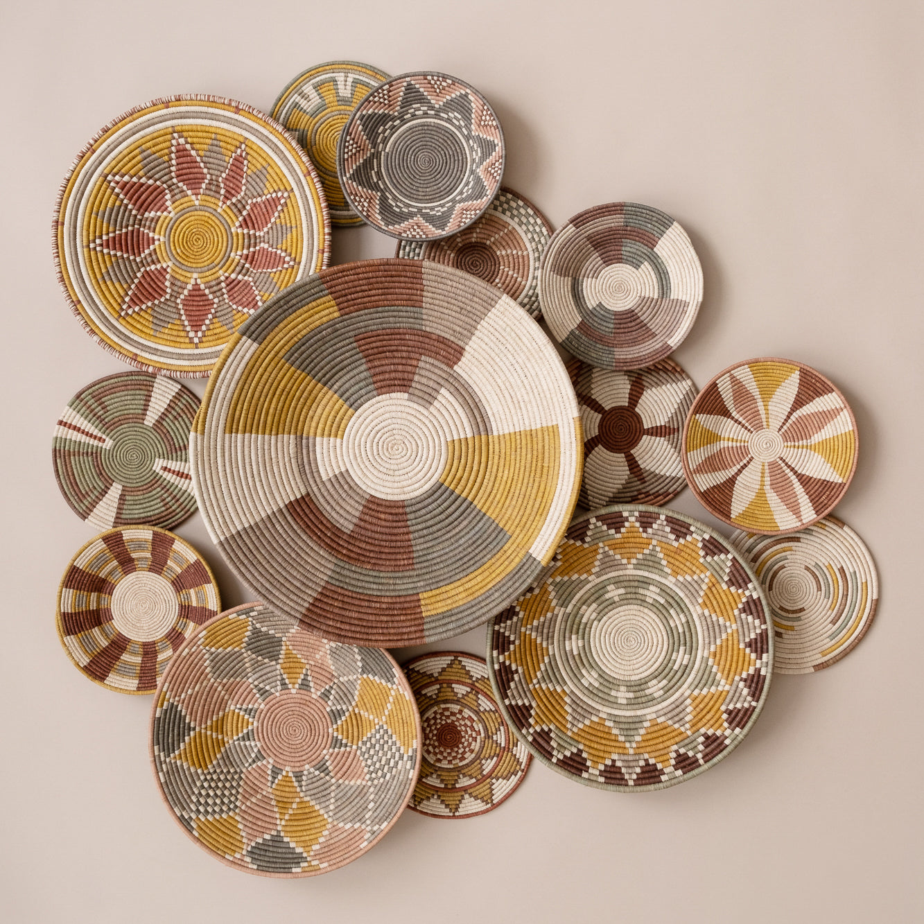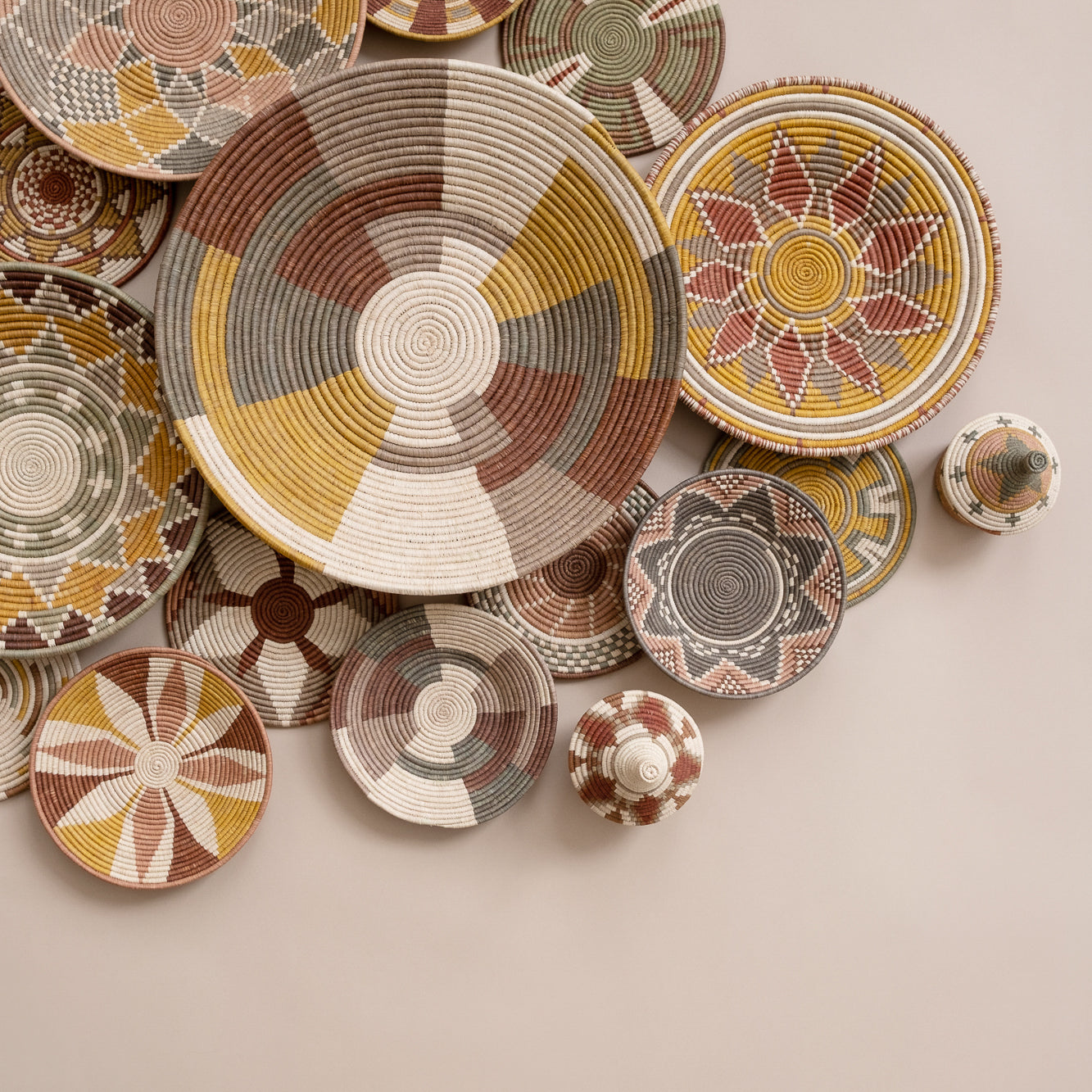The hand-dyed raffia is twisted and wrapped around coils of banana fibers, creating structure and intricate designs.