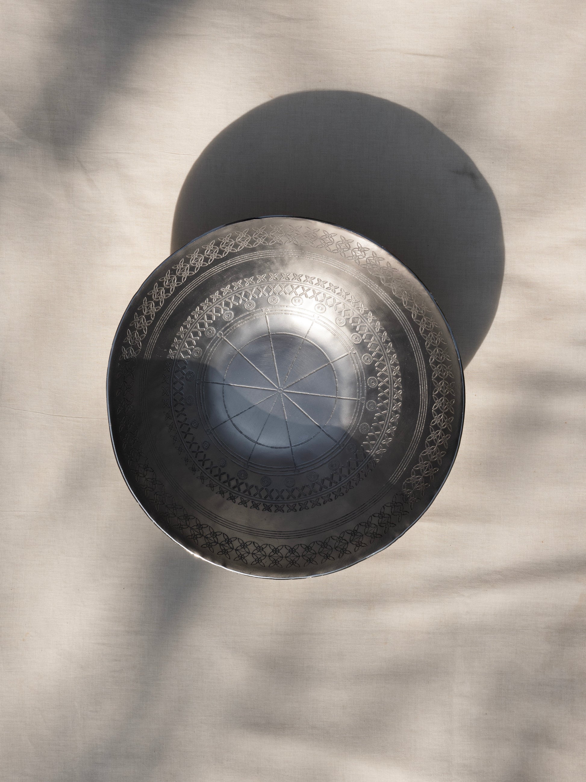Experienced craftsmen begin with thin sheets of aluminum to create this set of unique nickel-plated serving bowls. Each piece is then embellished with intricate patterns etched by hand into its satin finish, creating a focal point. Serving sets are sized in a range for everyday use to hold fruit or present snacks.