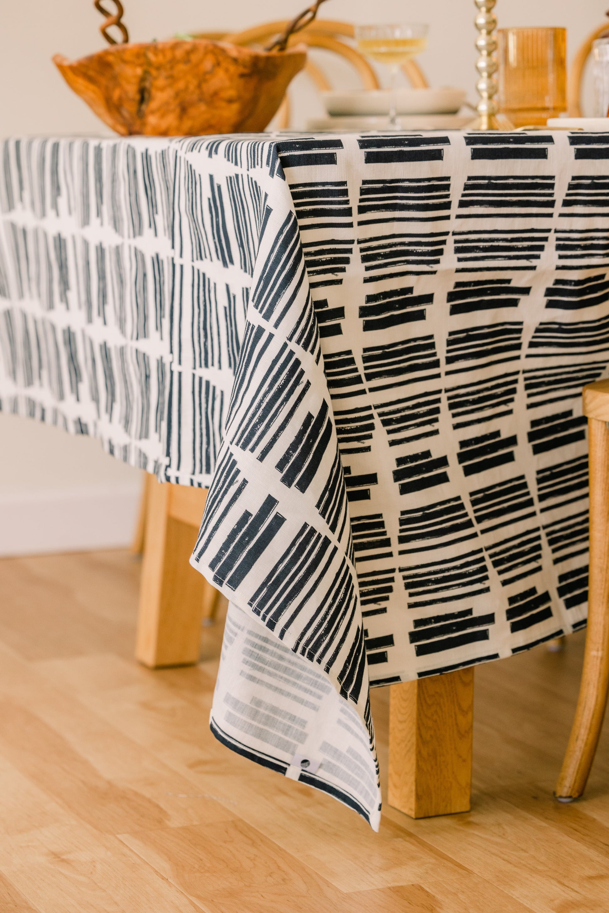 The complete Marguerite. Style fully layered with the Marguerite Placemat and Napkins, then top it off with your finishing touches. Everything goes. The Marguerite Tablecloth in Indigo is responsibly printed, cut and sewn in the US on a 55% linen and 45% cotton blend with yarns from Belgium. It measures approximately 70” x 90”.
