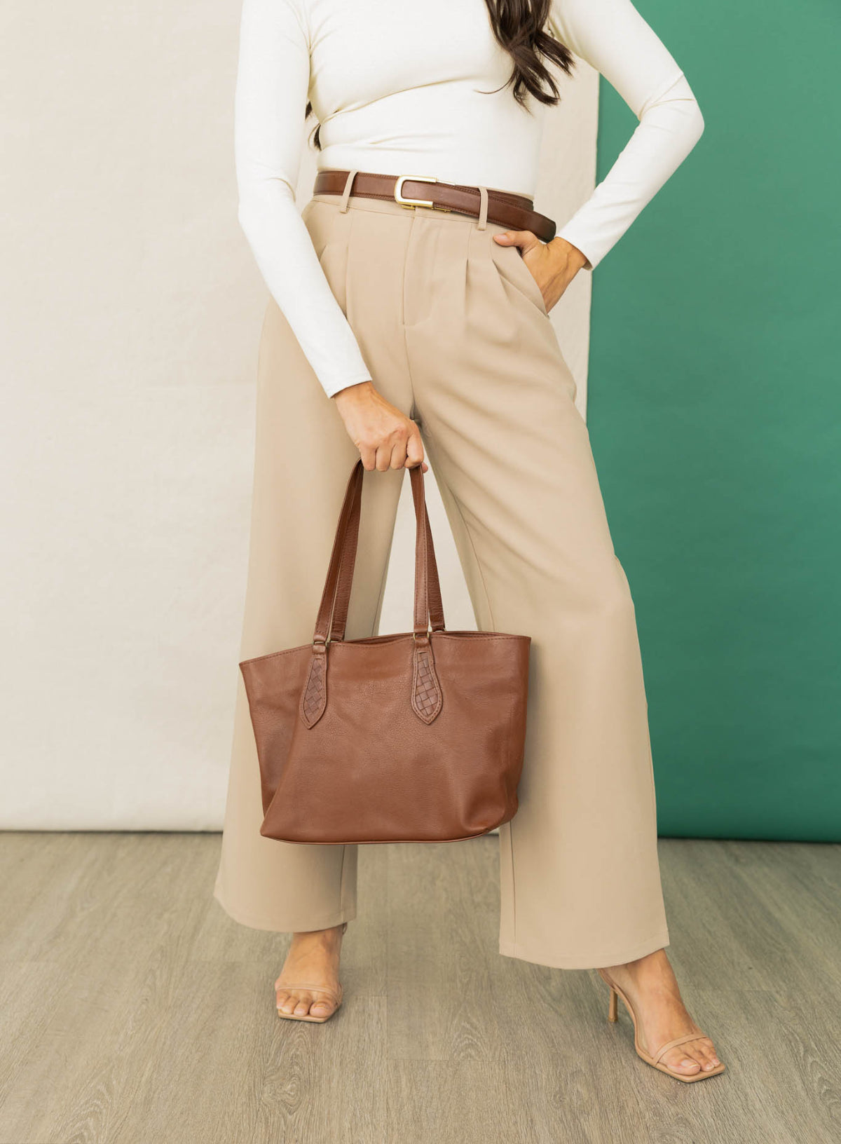 The Mid Tote is a beautifully handcrafted essential, featuring a sophisticated woven leather design and responsibly sourced materials. Ethically made in Haiti under fair trade principles, each bag offers a spacious interior, durable craftsmanship, and natural variations in leather texture, ensuring that every piece is unique.