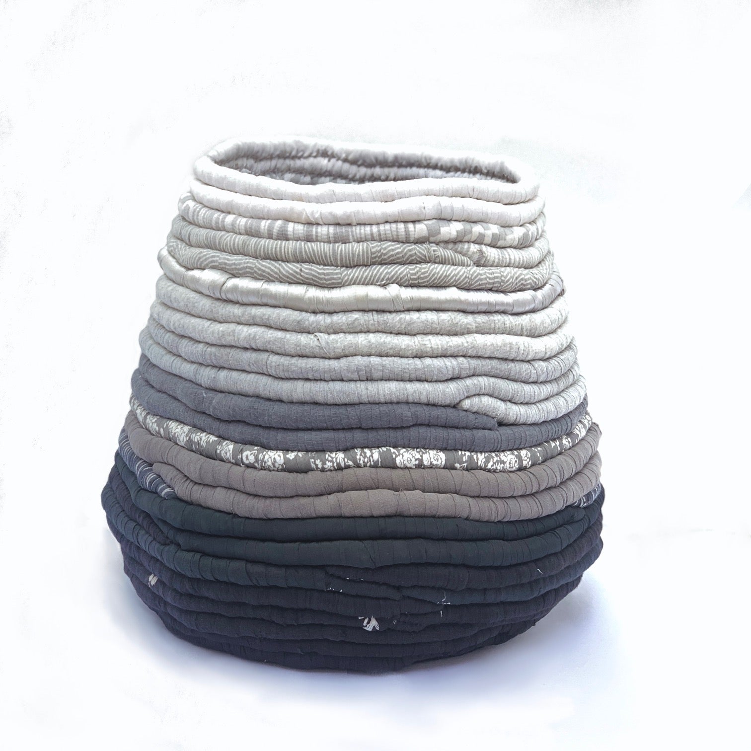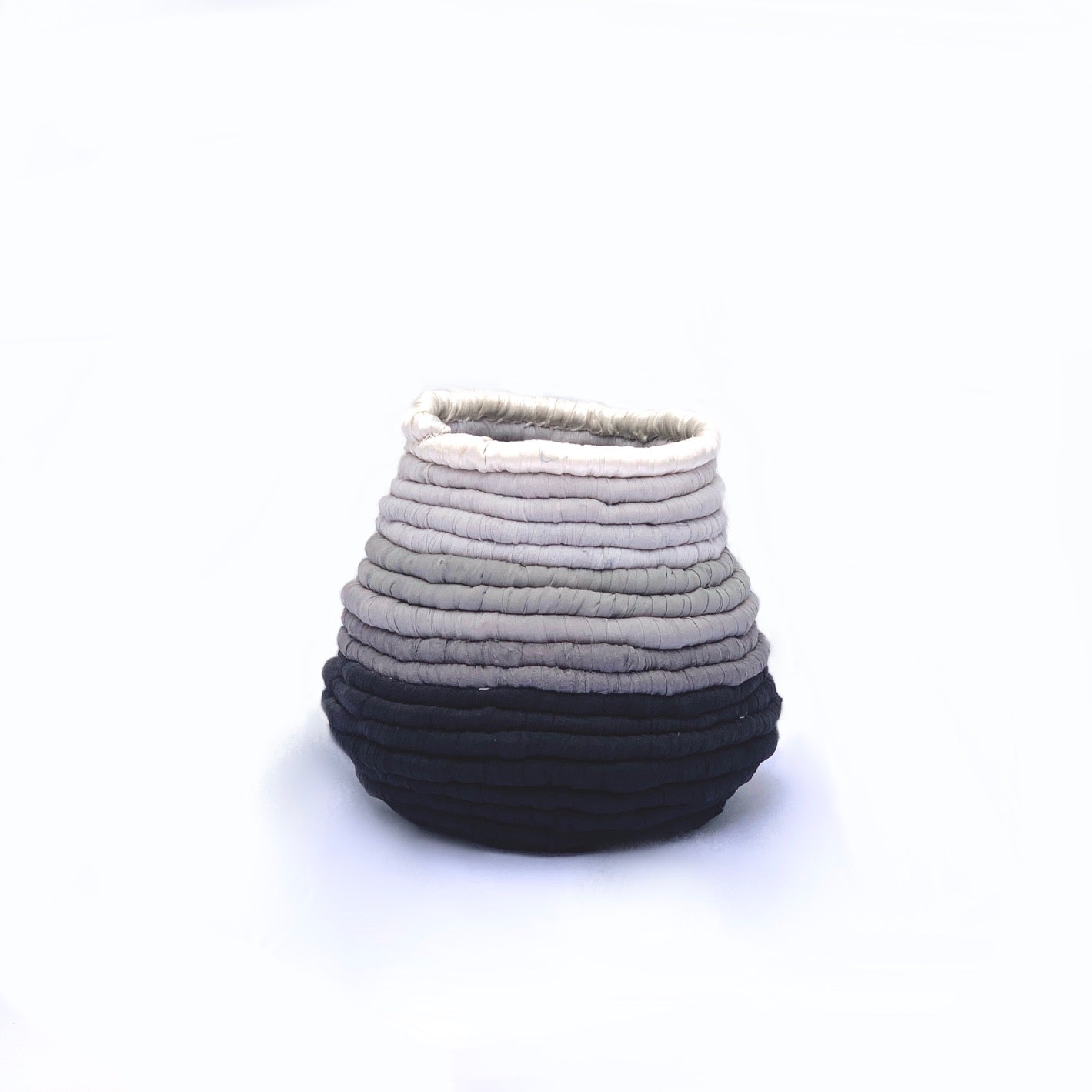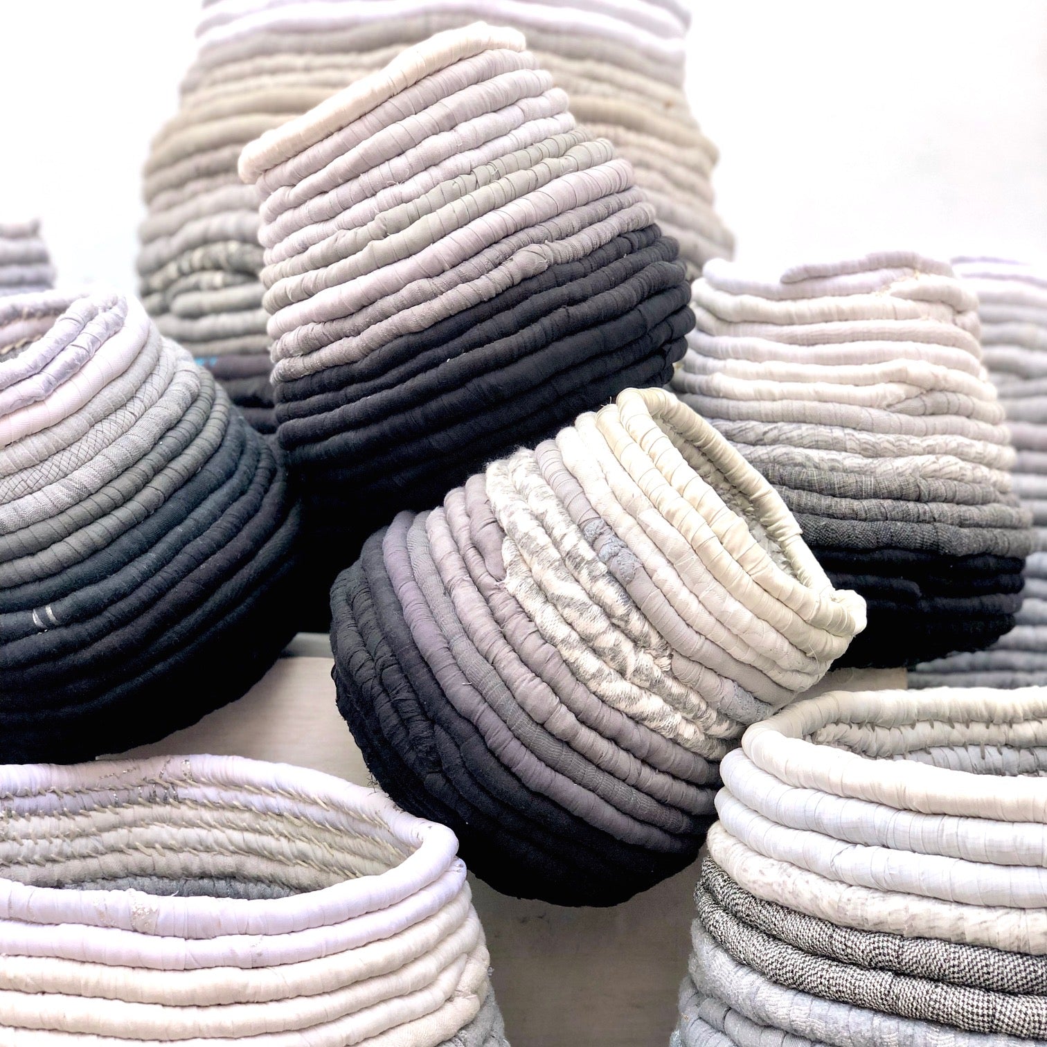 These unique storage pots or baskets are created from repurposed discarded fast fashion. The second hand clothing industry known as Salaula (hence the name Sally's Collection) keeps many people in the informal sector here in Zambia in business. However from every bale there are always pieces that don't get sold. These are collected and resold for less but even these traders have pieces they can't move. These are the pieces we buy. They are painstakingly washed, cut into strips and wrapped around acrylic fluff to form coils that are wound into traditional African pot shapes. The result are stunning, colorful, textural and completely individual baskets ideal for storage, to hold plants or as decor statement pieces.