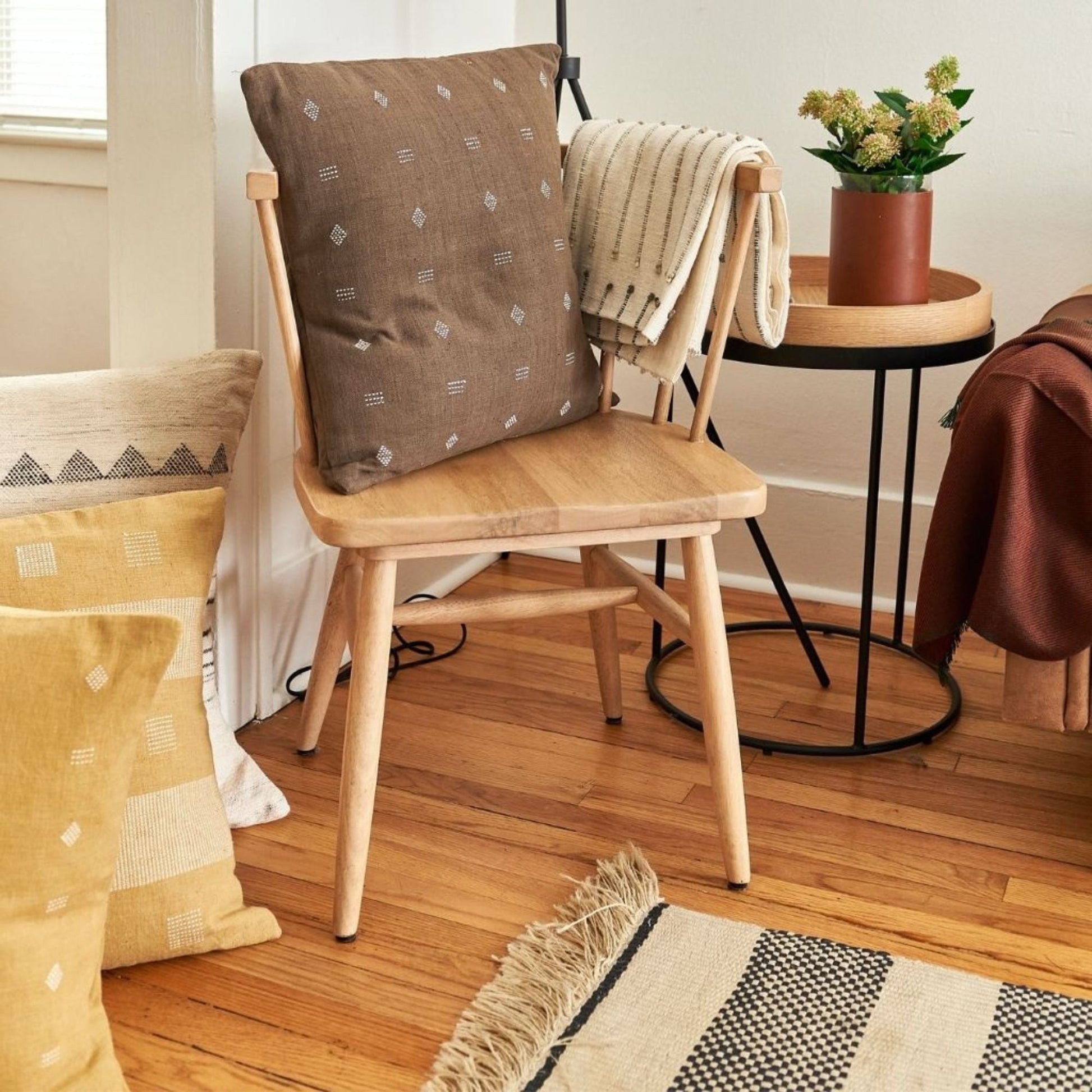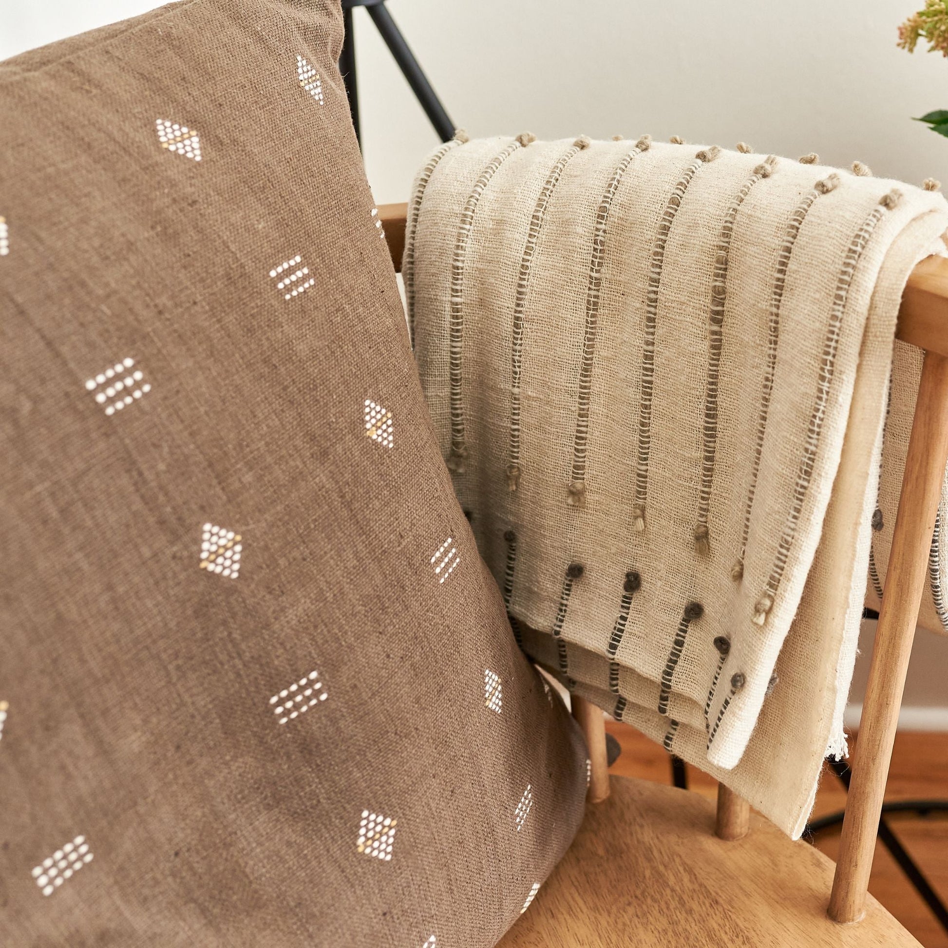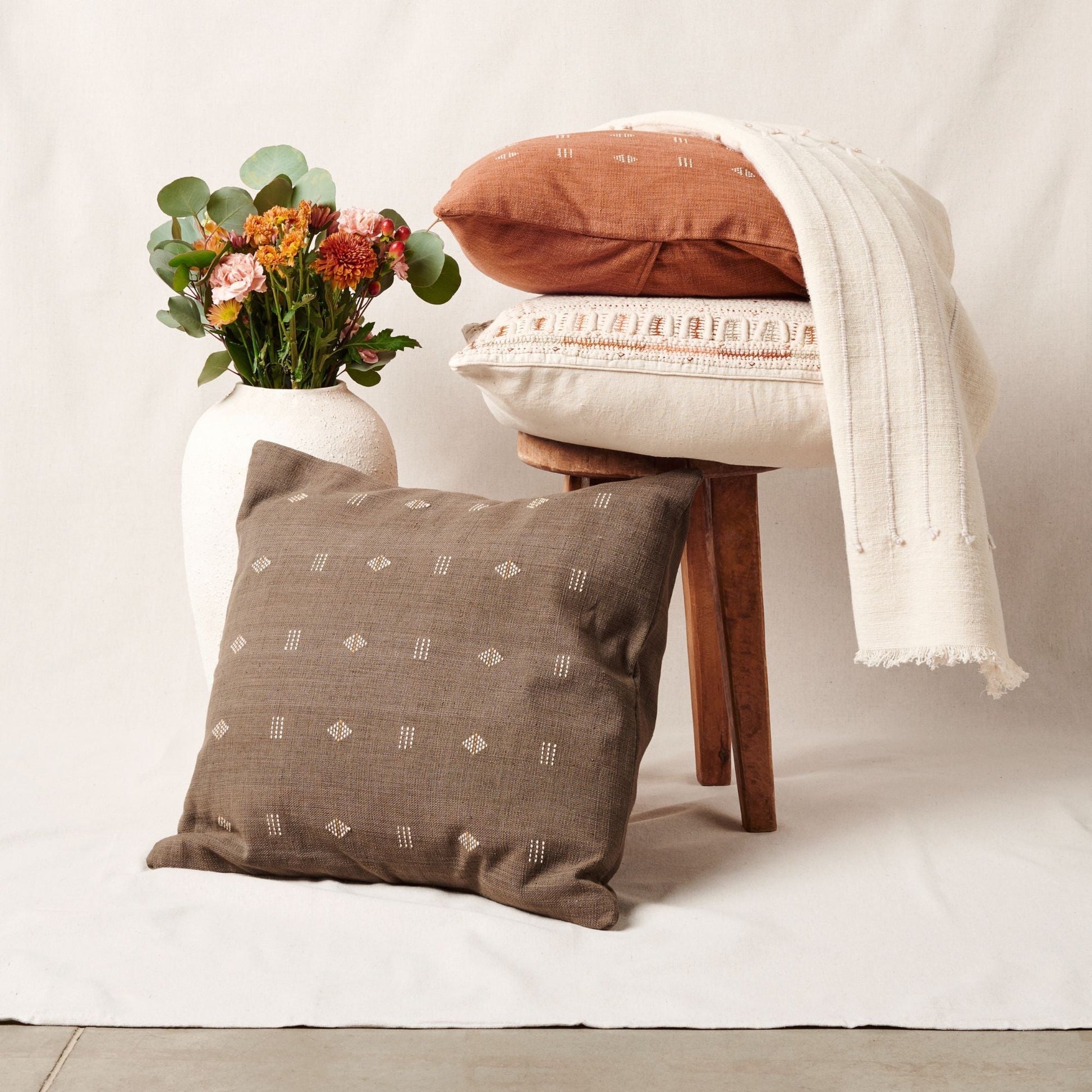Nira Choco Pillow is a slightly textured handwoven pillow where our artisans have skillfully created a classic pattern using an ancient weaving technique. Undyed yarn is used as a design element with the backdrop of pleasant hues of choco brown. The dyes are completely natural made by using flowers & herbs. The beauty of this pillow is in its pure design that stands out with the use of undyed white yarns left in its natural state. We are using a 700 year old weaving technique, which only this specific artisan cluster is known to using. As this pillow is 100% handmade from start to finish, each piece is unique and will have a slight variation which is the beauty of the handmade process. Requiring attention to detail and finishing, It takes an incredibly skillful master artisan to make this special piece which is unique to the artisan cluster it originates from. Throw Size: 20" X 20 " ( Down filler included in this price ) Material: 100% Rain-fed Organic Cotton Color: Choco Brown & White (undyed and both yarns in its natural form ) Artisan Base: Ethically hand woven by artisans in India What Makes Your Purchase Sustainable? 100% natural hand-sun yarns used. Support employment of women artisans & local farmers. 100% handmade manufacturing process by artisans. Low carbon foot print as the cotton is 100% rain-fed. Use only 100% natural + biodegradable responsibly sourced materials. Small batch production ensures higher quality & less wastage. Each product comes in a biodegradable recycled pouch.