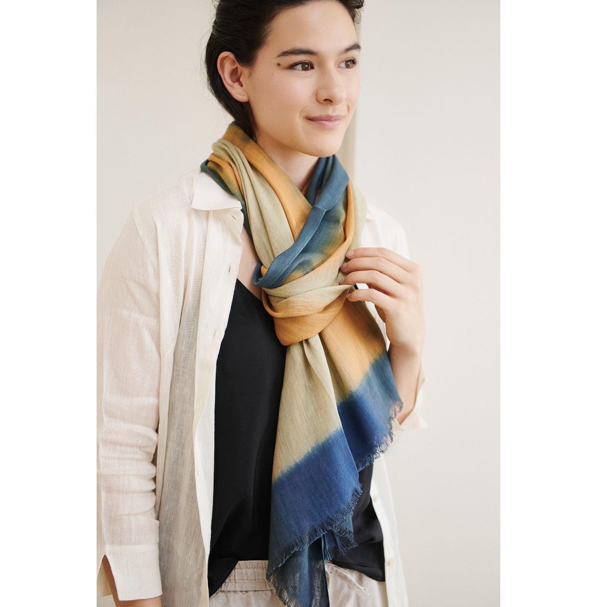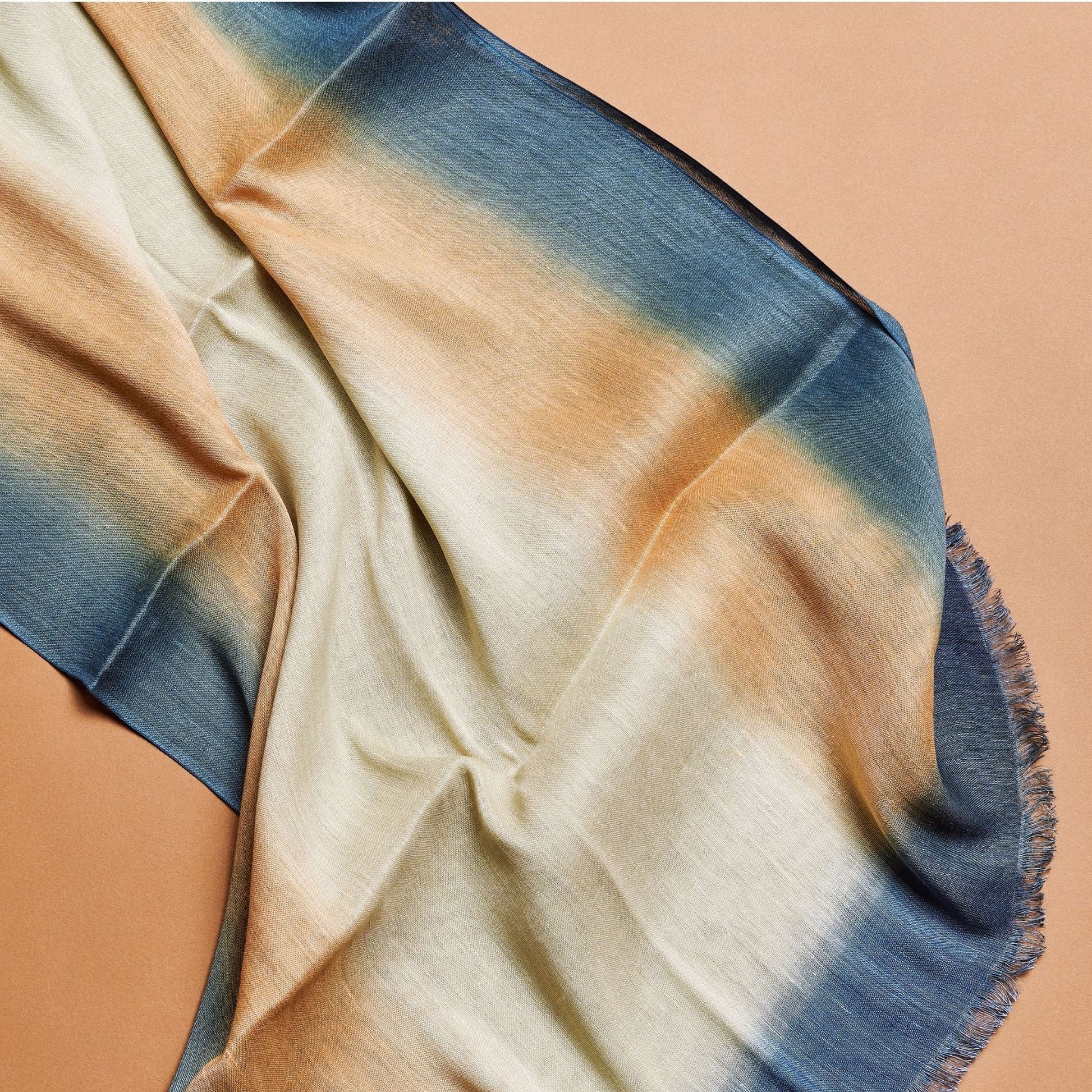 Oceana is a timeless scarf handwoven by weavers in Nepal with whom we directly collaborate without any middlemen. Soft in hand feel this classic scarf has been hand dyed in ombre effect to give it a soothing look that also makes it a unisex piece. This scarf can be worn all year around, suitable for travel, freezing offices or a full day drape that can be easily styled with multiple outfits. Plant based pure linen with pure silk blend makes this scarf naturally textured and breathable as a textile. Linen keeps it cool in summer and silk adds a gentle warmth when it's chilly outside. A thoughtful gift or a personal purchase, this softly textured scarf is a sustainable purchase supporting artisan communities ethically. Material: Linen Silk blend Size: 56 cm x 200 cm Color: Sand, Cream, Indigo Blue Artisan base: Ethically and responsibly handwoven by artisans in Nepal. Wash care: Gently hand wash using gentle detergents. Hang dry in cool shaded place or delicately dry clean only. What Makes Your Purchase Sustainable ? Eco-Swiss dyes. Support employment of handloom weavers. 100% handmade manufacturing process by artisans. Use only 100% natural responsibly sourced materials. Small batch production ensures higher quality & less wastage.
