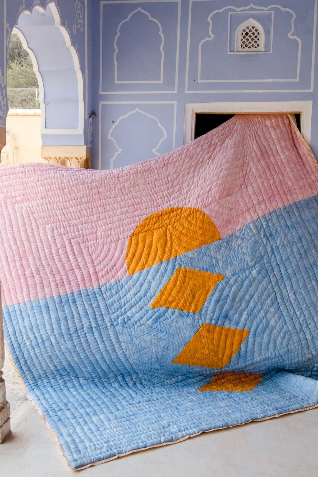 The design is hand-pressed onto each quilt using hand-carved wooden blocks dipped in dyes. The printed cotton shells are brought to the homes of quiltmakers, who stuff and stitch the quilts by hand, creating the final product.