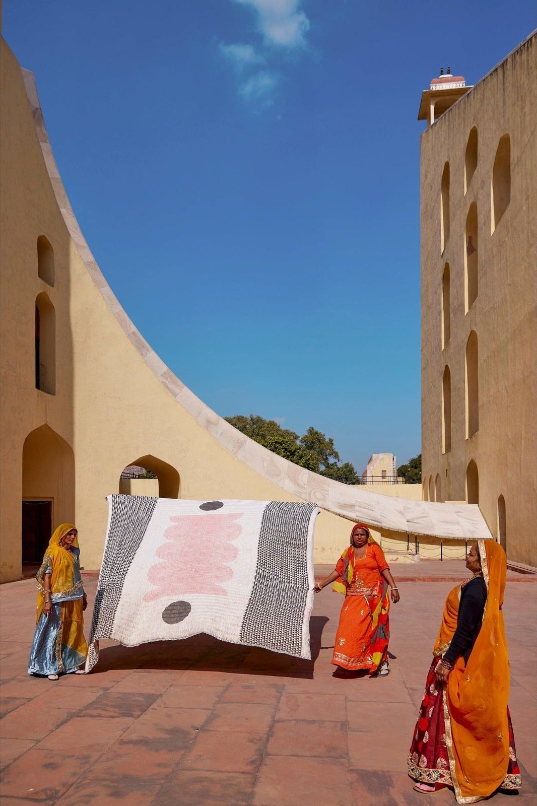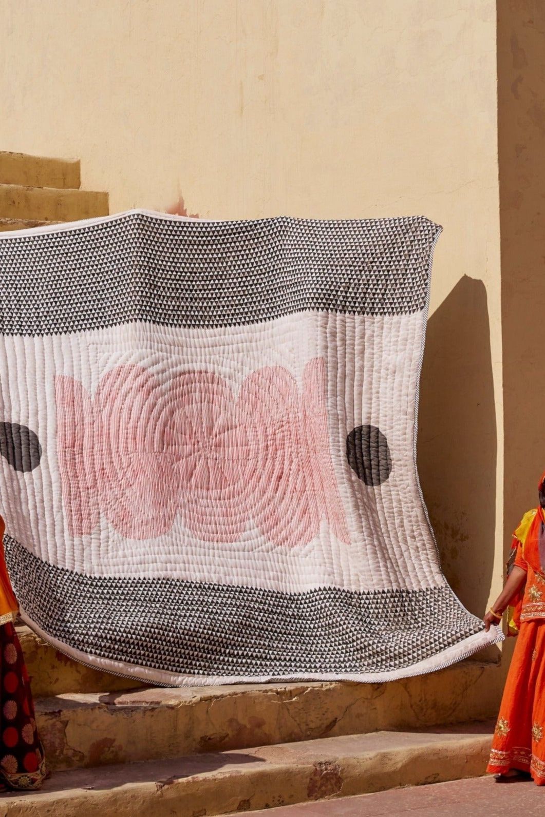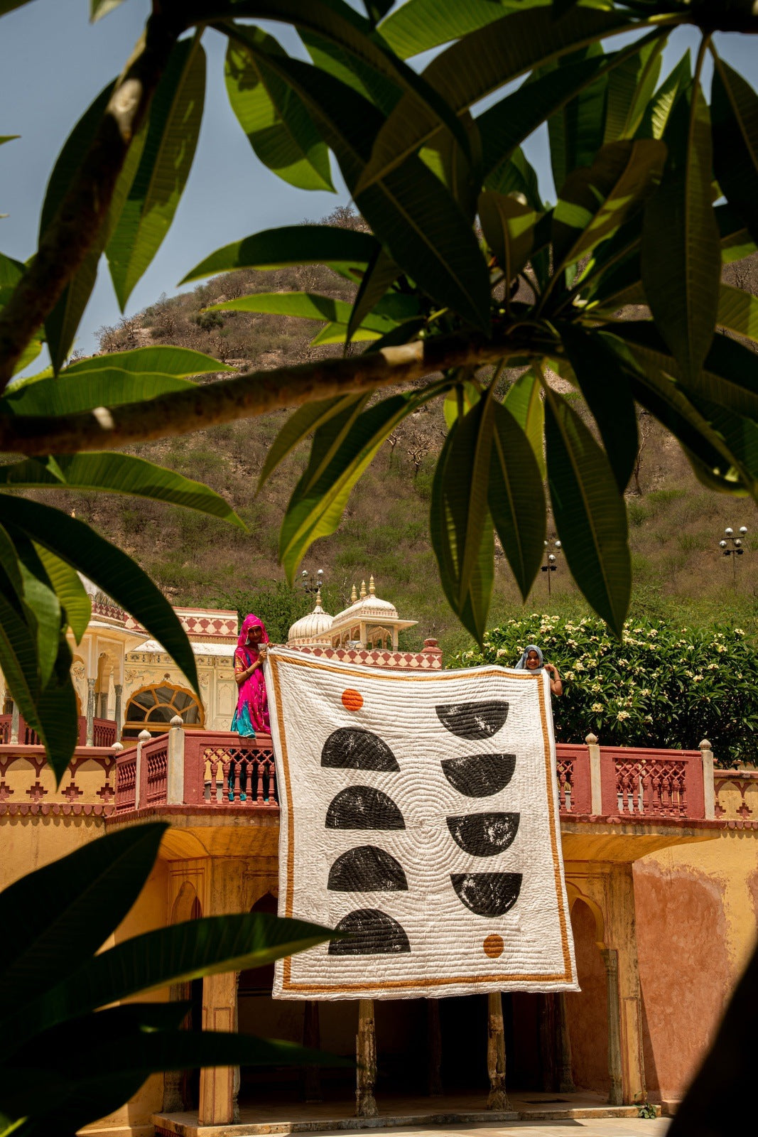 The design is hand-pressed onto each quilt using hand-carved wooden blocks dipped in dyes. The printed cotton shells are brought to the homes of quiltmakers, who stuff and stitch the quilts by hand, creating the final product.